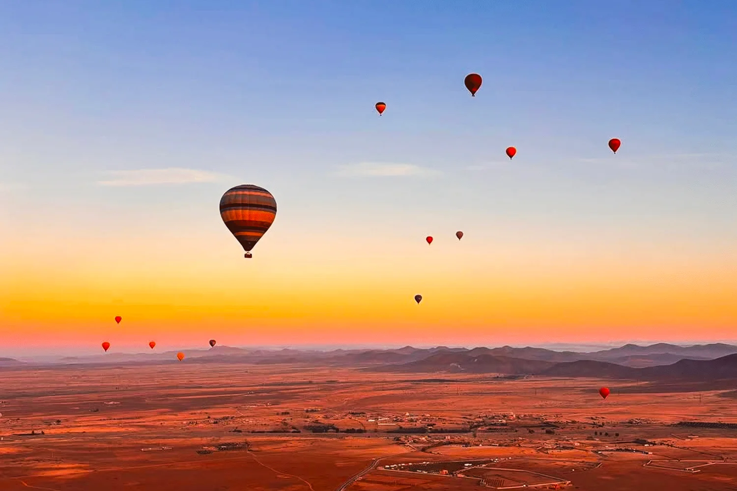 Experience the dramatic contrast of the Moroccan landscape with a sunrise flight over the Agafay Desert and the Atlas Mountains. From a premier vantage point, watch the "Red City" awaken as the first light strikes its ancient ramparts. This journey provides a serene and exclusive perspective of the region's raw natural beauty.