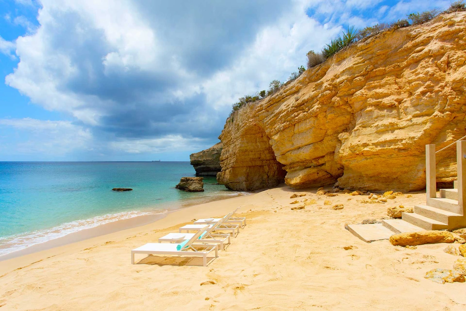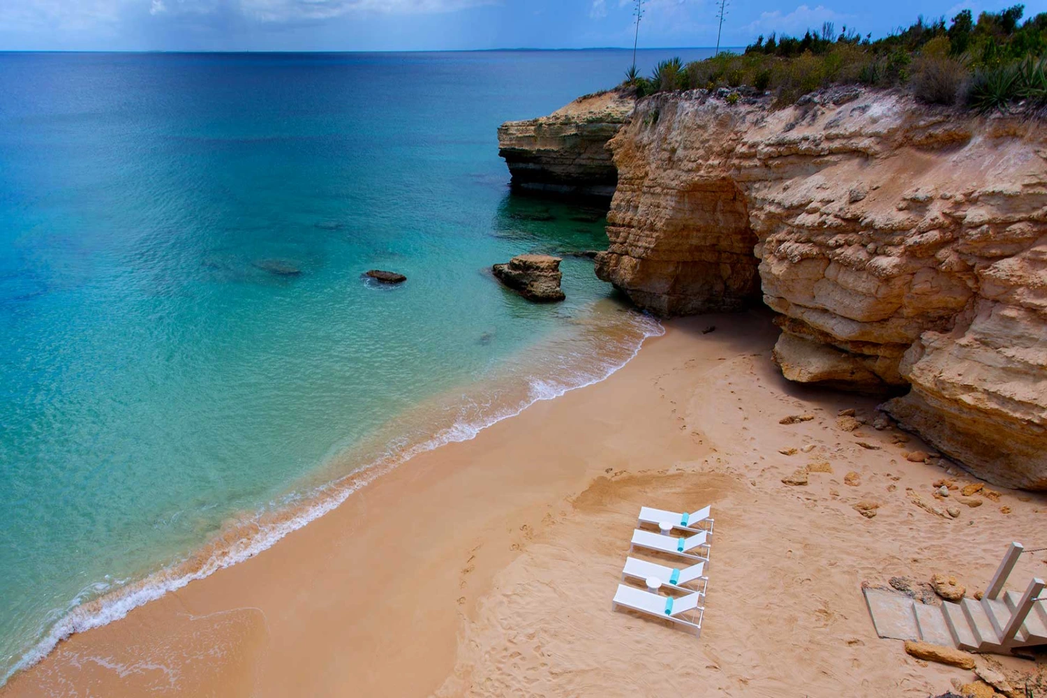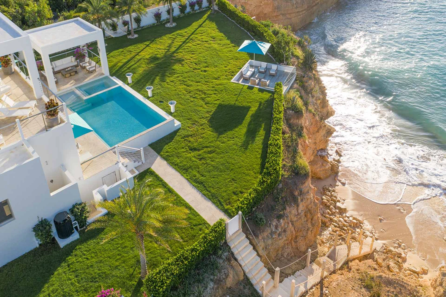 Exterior staircases allow guests to move about the villa with ease. Simply descend the stairs along the surrounding cliff to reach a breathtaking beach cove. Relax on the sand atop a sun lounger or take a dip in the crystal-clear sea.