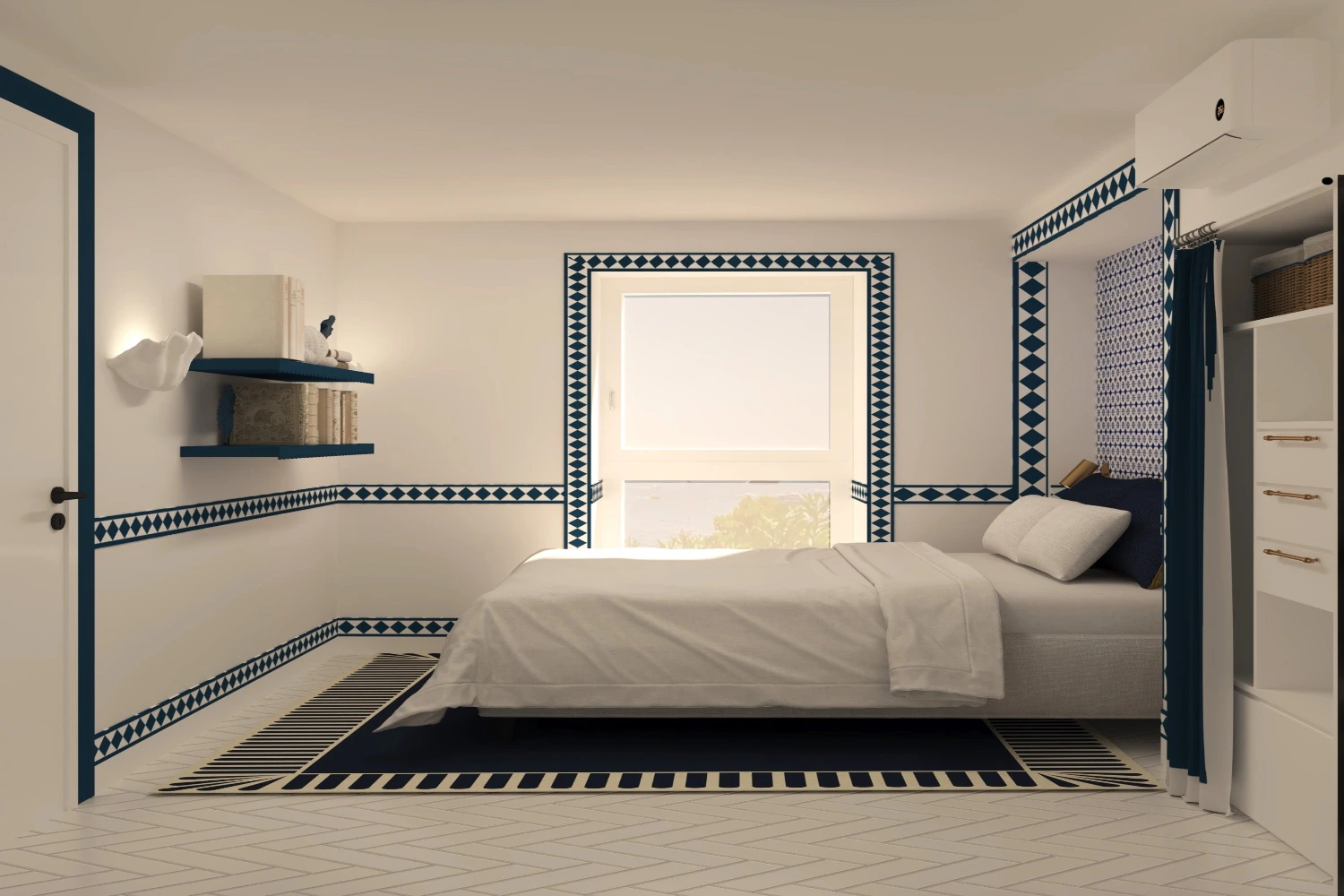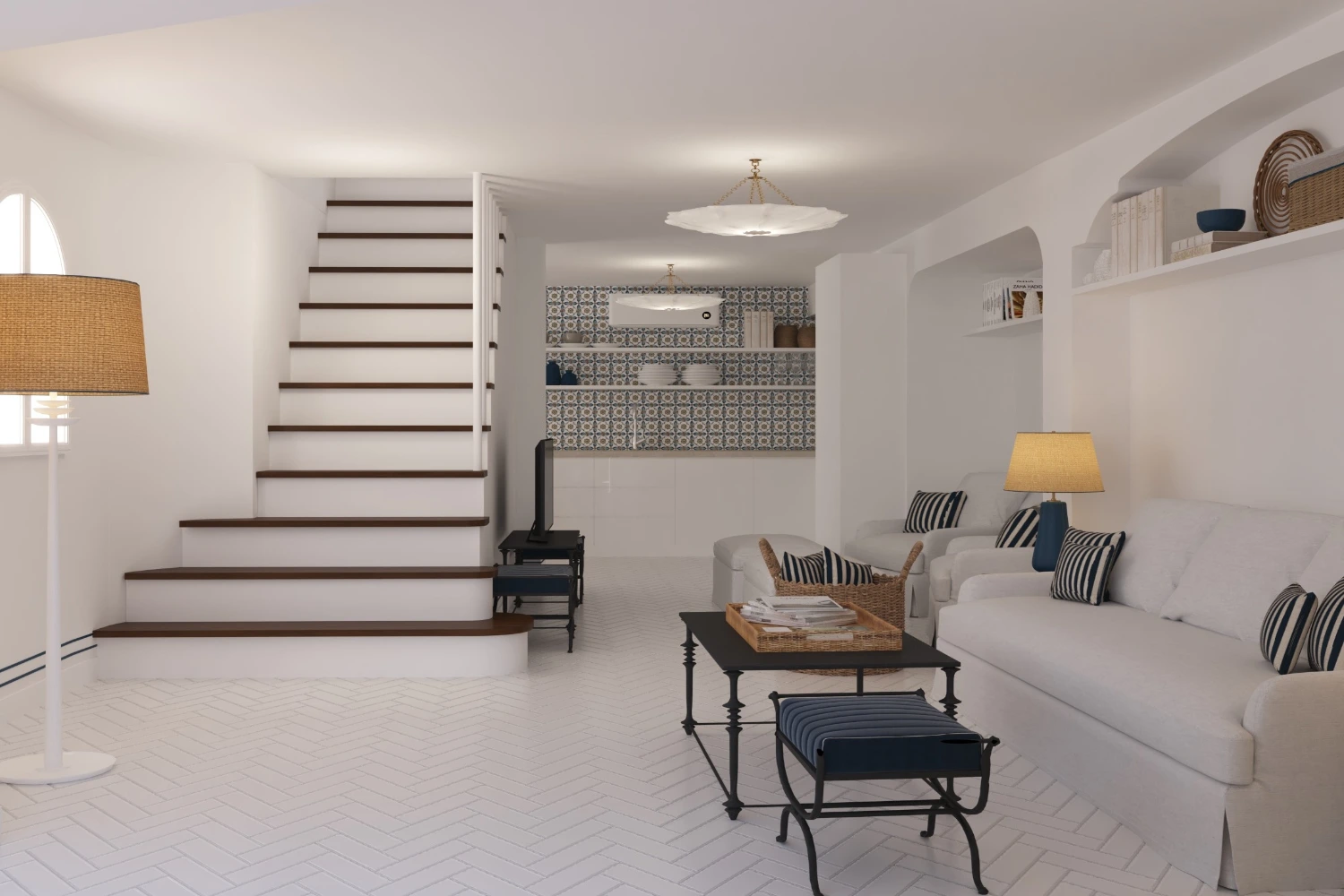 This three-level villa is divided into two distinct living areas, providing flexibility and privacy for every guest. The main house features a master bedroom and a second bedroom, both offering stunning sea views. Descend from the main house to the lower level, where you’ll find two independent bedrooms offering apartment-style living. The first floor of the main house boasts a dine-in kitchen and open-plan living and dining area. Cool white walls reflect the Mediterranean light, while accents of color, namely dark blue, add elegance and charm.