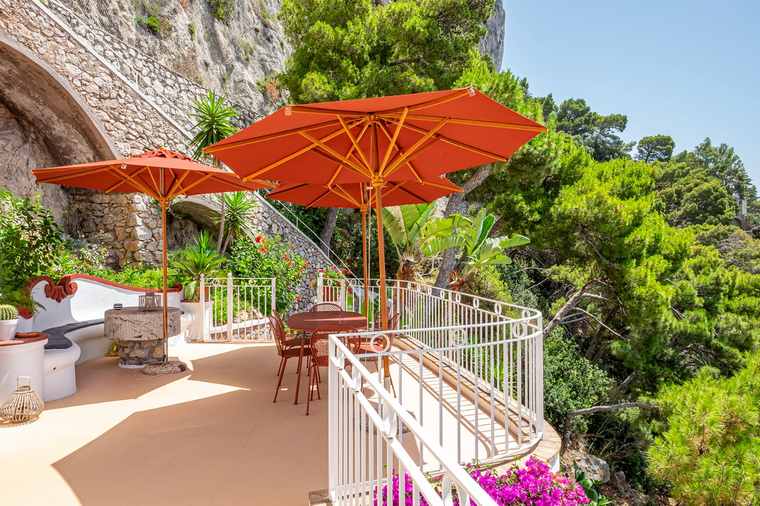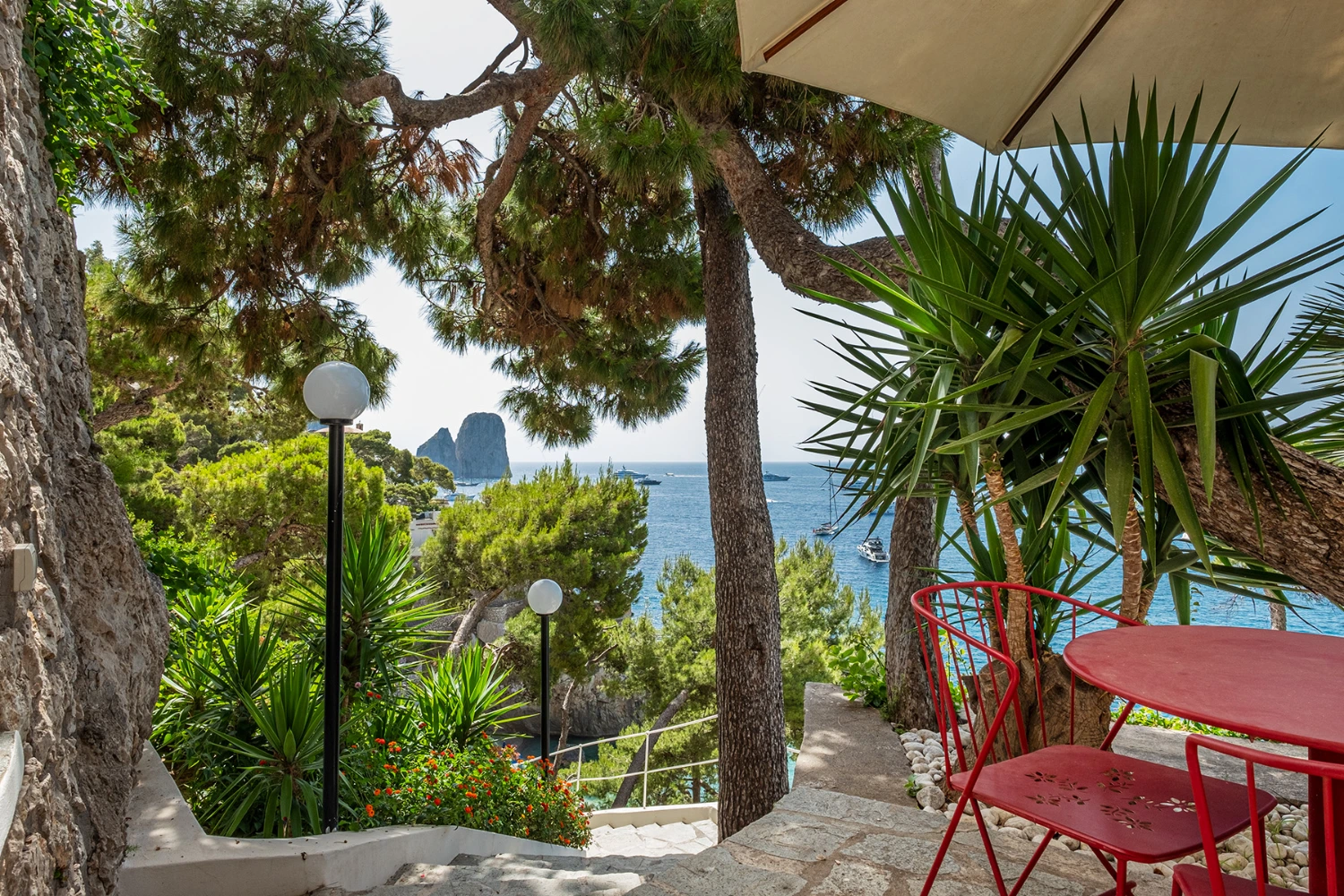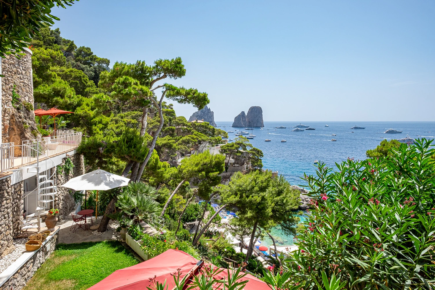 Looking out on the iconic Faraglioni Rocks and surrounded by a tropical and Mediterranean garden, a pine forest, and limestone cliffs, Tenuta Saracena provides the privacy of a clifftop escape. At the same time, guests can take advantage of the villa’s proximity to Marina Piccola, a family-friendly bay and beach cove, and Capri Piazzetta, a lively public square perfect for people watching while sipping an Aperol spritz.