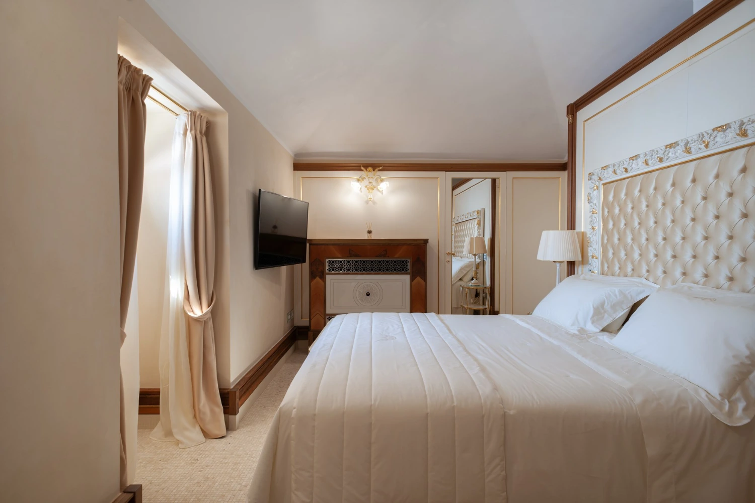 Accessible only by stairs, each room in this high-ceilinged villa has been exquisitely restored and furnished to exude true luxury. Decorative furnishings throughout the home include Murano glass lamps, artistic statues and busts, fireplaces, gold-plated door knobs, and tiled floors. The main living room has a grand piano and floor-to-ceiling windows, through which guests can enter the terrace. Each common area features a bar—ideal for gathering for cocktails any time of day. Guests can prepare delicious meals in the fully equipped kitchen and enjoy a daily continental breakfast throughout their visit.