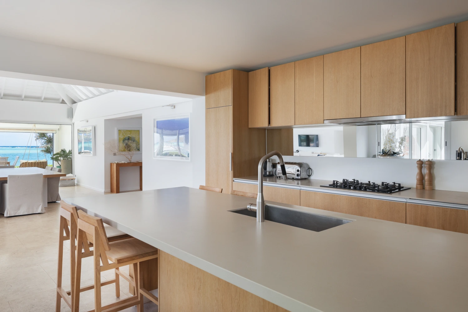 Clean white walls and exposed beam ceilings create an airy, peaceful atmosphere ideal for rest and relaxation. The open-plan living room and dining area at Villas Aqua & Bleu make an inviting gathering space, day or night. Cozy up on the deep-cushioned sectional sofa to enjoy a game of chess or a movie on the flat-screen TV. Gather at the nearby dining table or the gourmet kitchen, featuring a large center island with bar seating and a gas stovetop, each morning for a daily continental breakfast.