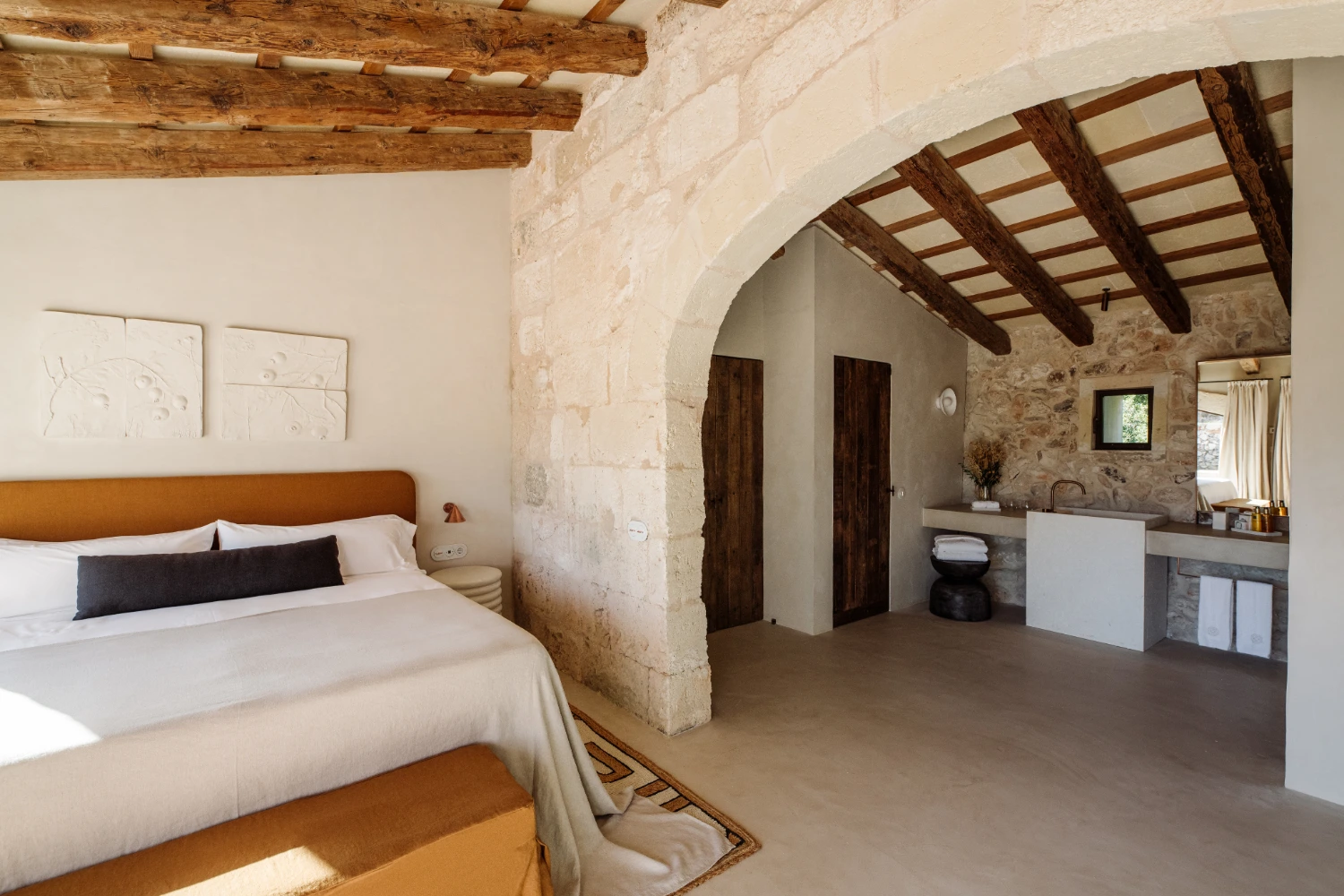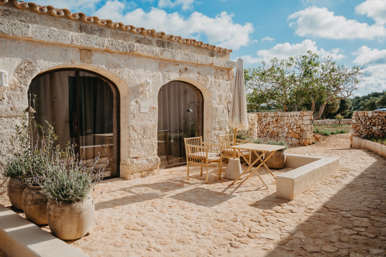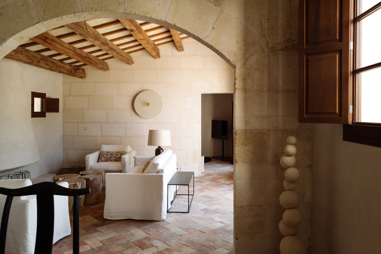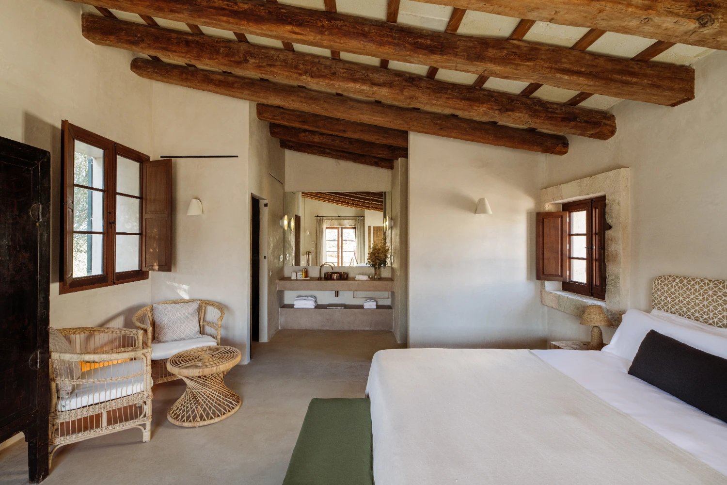Villa Santa Ana is a fully restored luxury farmhouse in Menorca showcasing proximity to a white-sand beach and an array of high-end amenities, including a pool, gym, fire pit, beach access, airport transfers, fireplace, daily breakfast, daily housekeeping, and a villa manager on call.