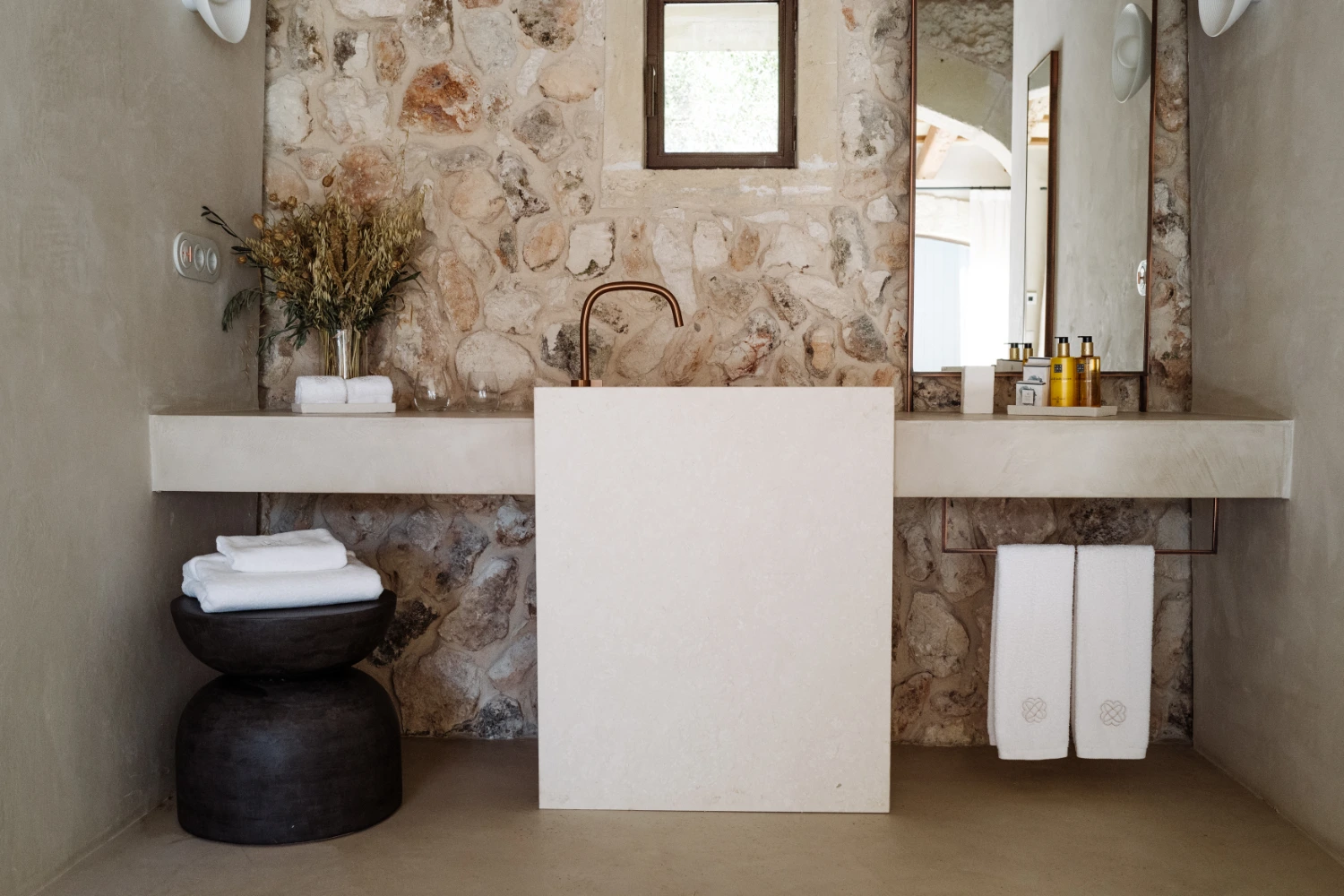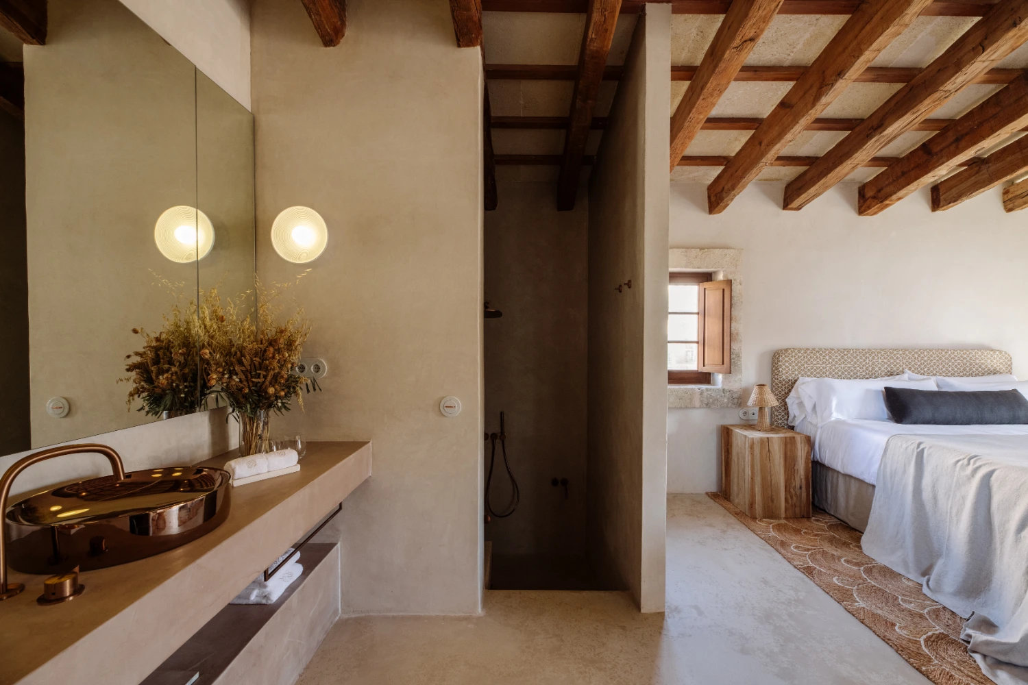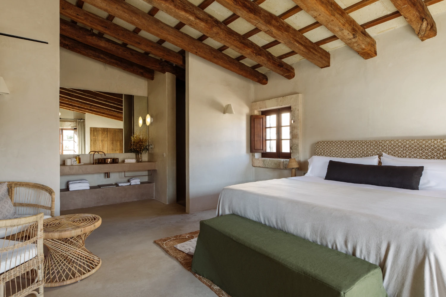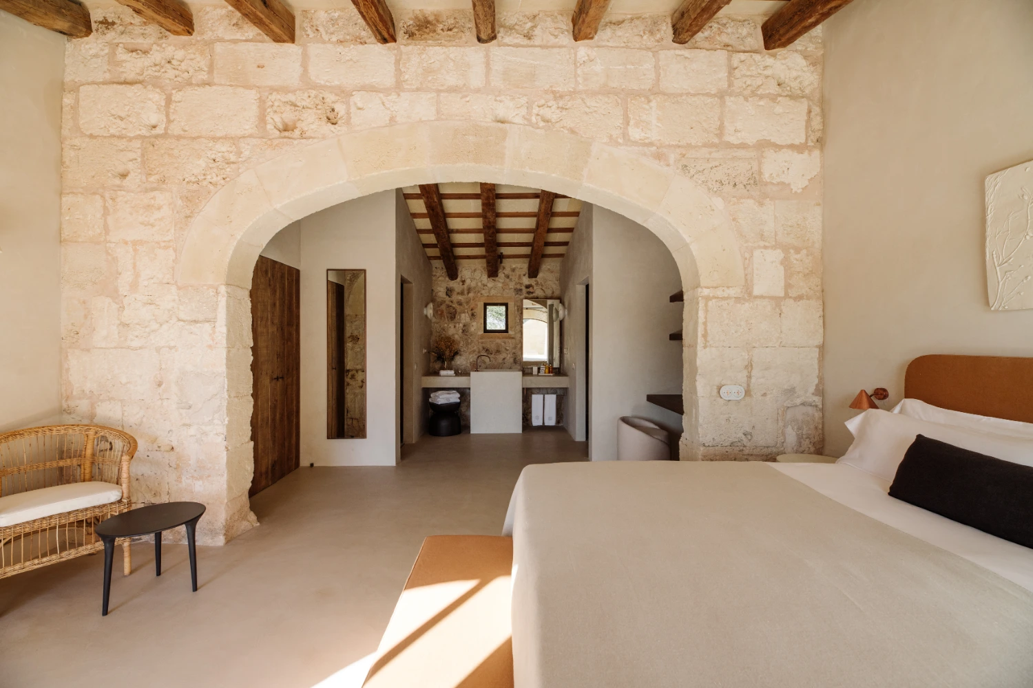 Villa Santa Ana is a fully restored luxury farmhouse in Menorca showcasing proximity to a white-sand beach and an array of high-end amenities, including a pool, gym, fire pit, beach access, airport transfers, fireplace, daily breakfast, daily housekeeping, and a villa manager on call.