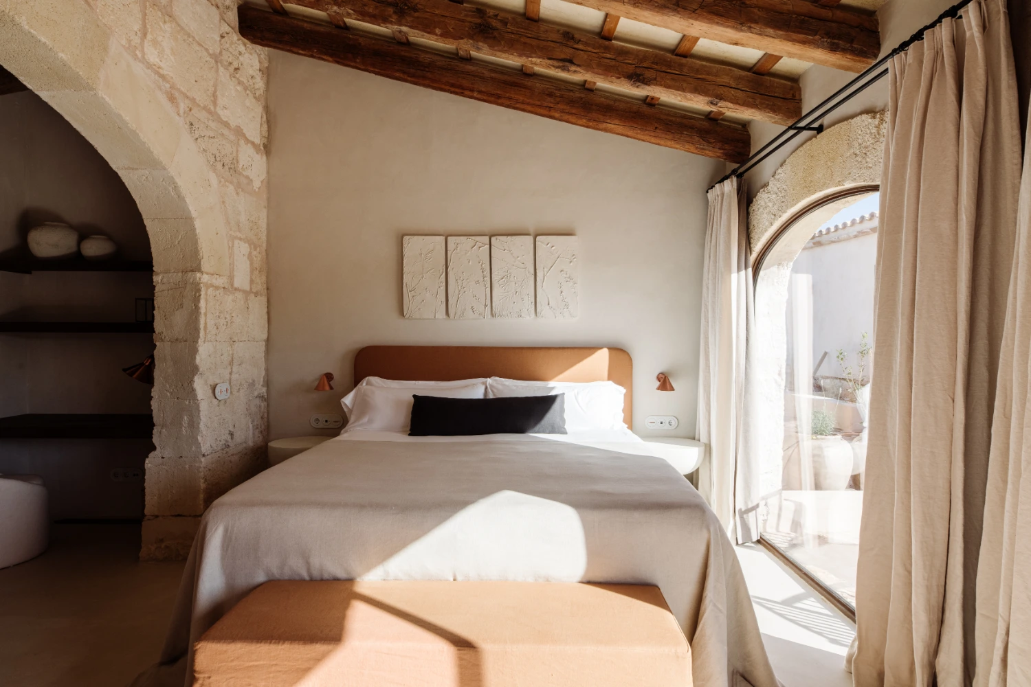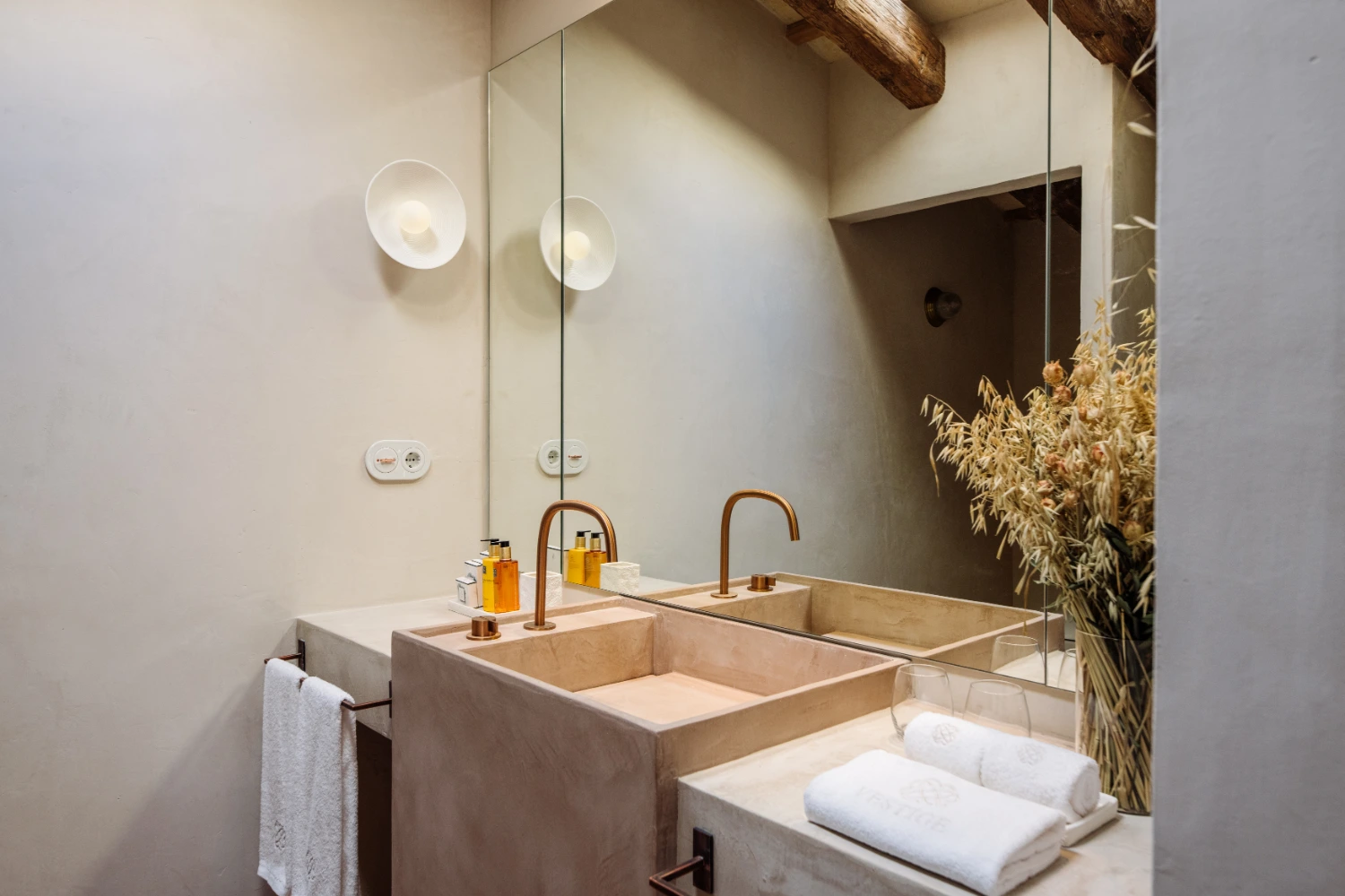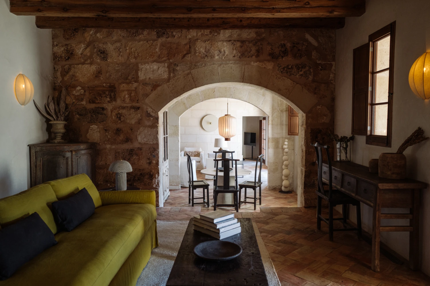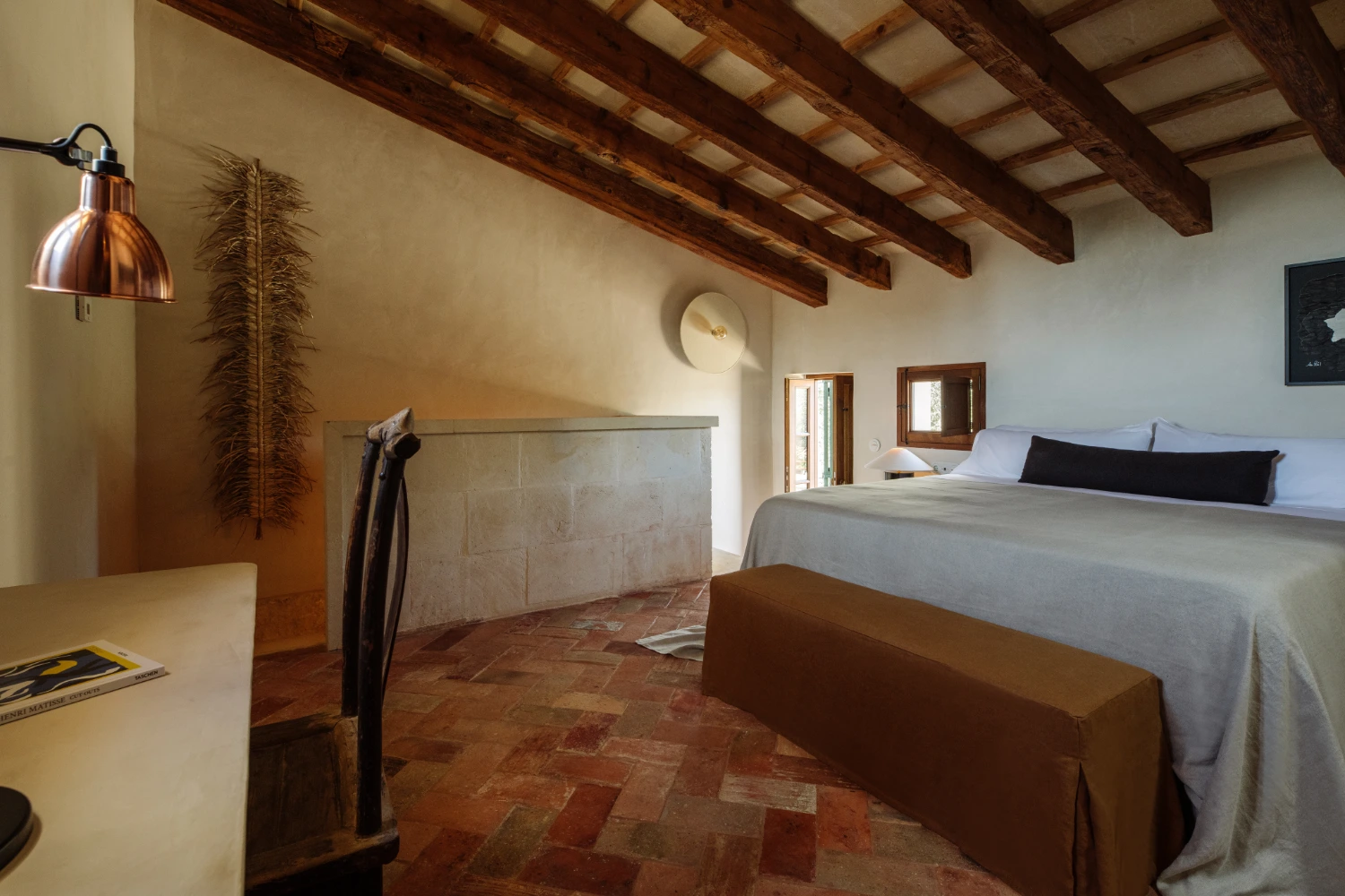 Villa Santa Ana is a fully restored luxury farmhouse in Menorca showcasing proximity to a white-sand beach and an array of high-end amenities, including a pool, gym, fire pit, beach access, airport transfers, fireplace, daily breakfast, daily housekeeping, and a villa manager on call.