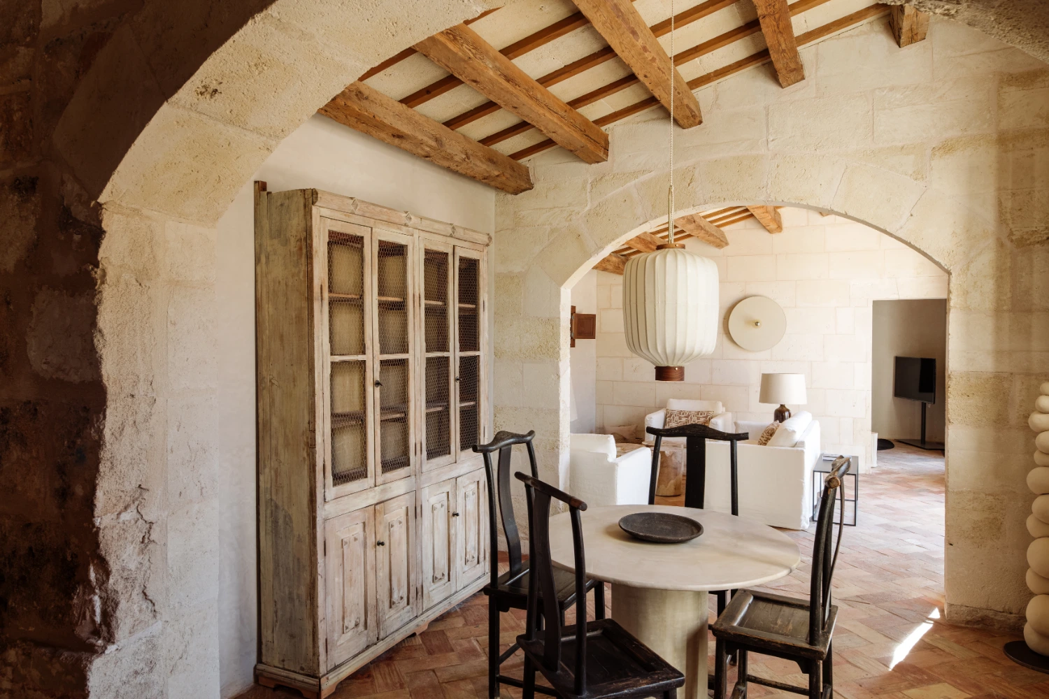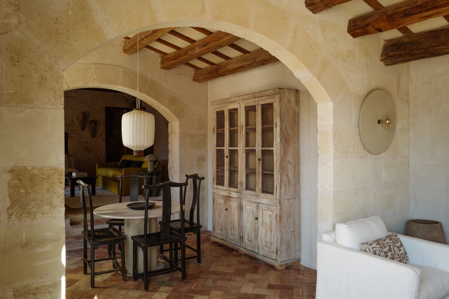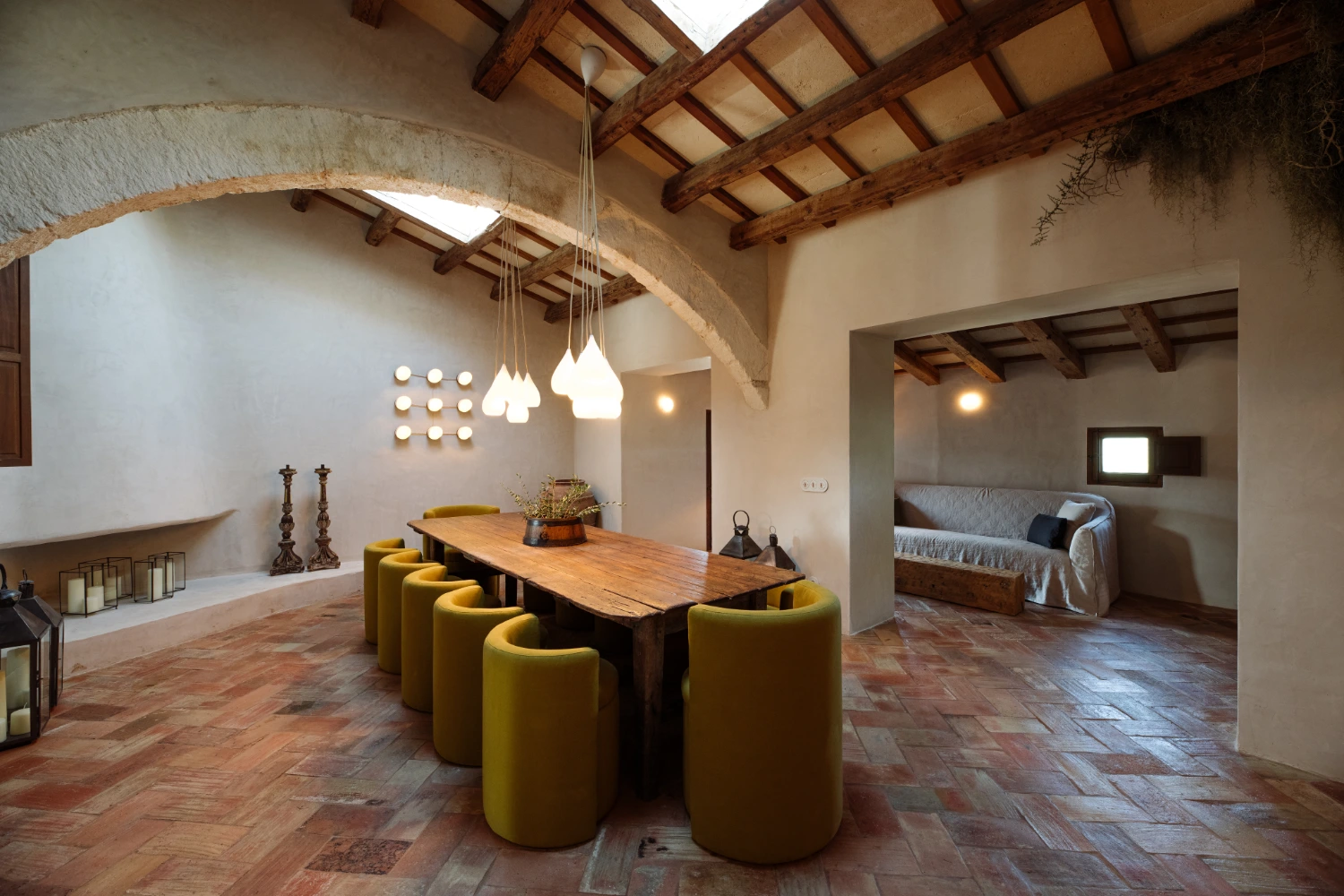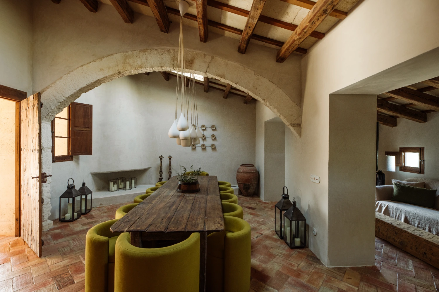 Villa Santa Ana is a fully restored luxury farmhouse in Menorca showcasing proximity to a white-sand beach and an array of high-end amenities, including a pool, gym, fire pit, beach access, airport transfers, fireplace, daily breakfast, daily housekeeping, and a villa manager on call.