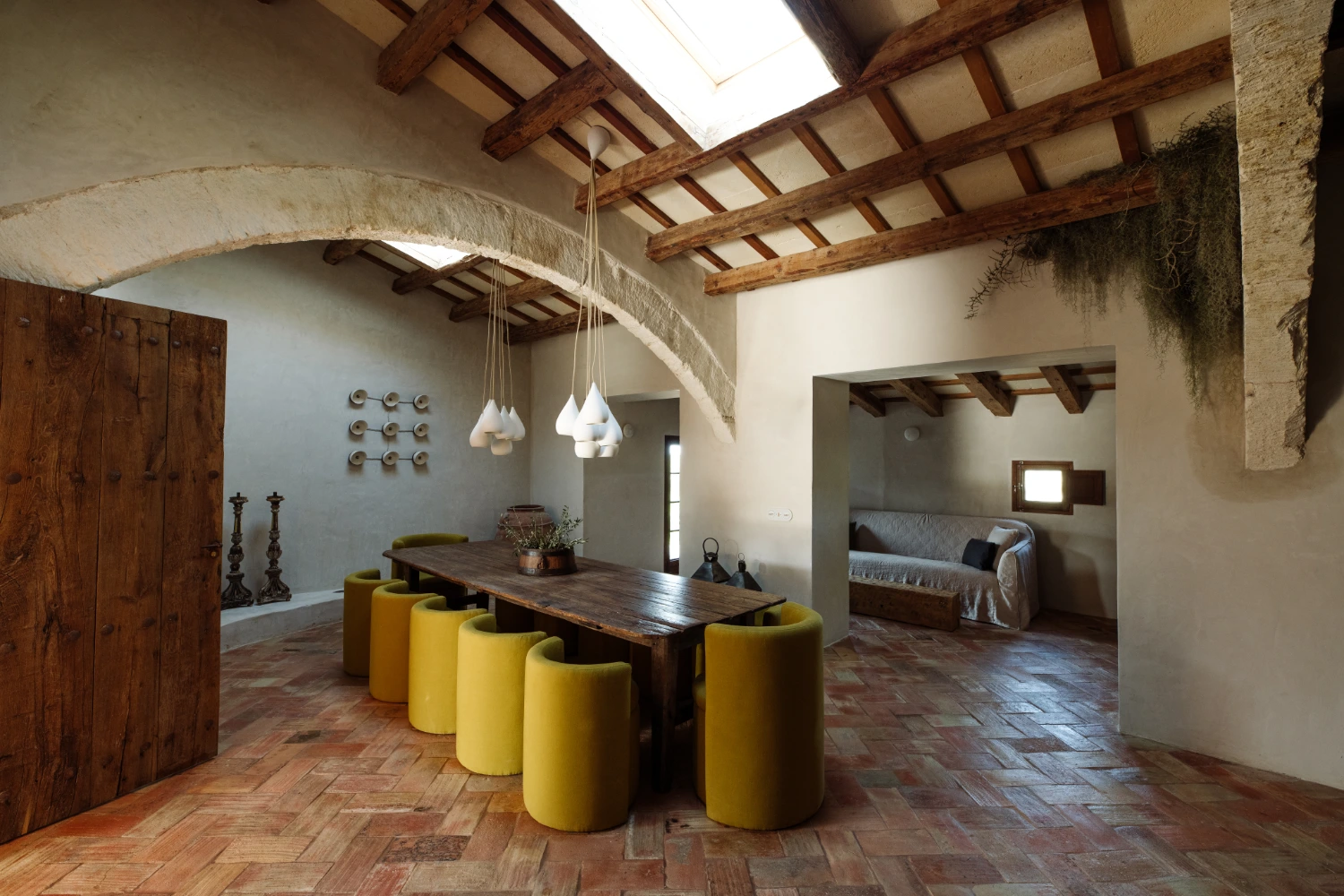 The open-plan kitchen, with a large center island featuring bar seating and Smeg refrigerators, leads into a dining room equipped with a long wooden table and pendant lights. Enjoy a daily breakfast at the villa, either indoors or al fresco on the terrace. An outdoor kitchen with bar seating allows for effortless meals in the open air.