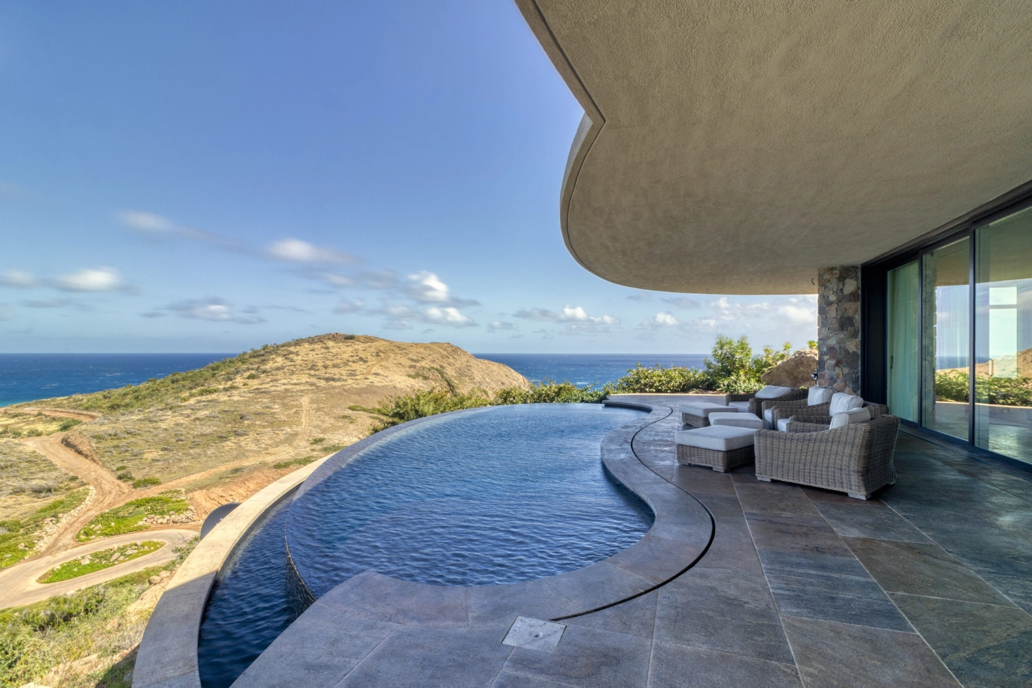 The curving outdoor terrace features more seating options via cushioned armchairs and ottomans. Sitting in the state-of-the-art infinity pool, guests can take in the rich natural terrain and surrounding sea. After a dip in the pool or an hour in the onsite exercise room, guests can rinse off at the outdoor shower.