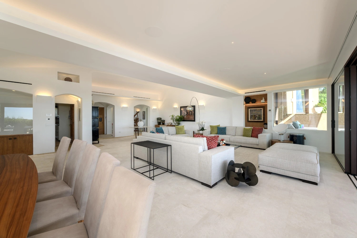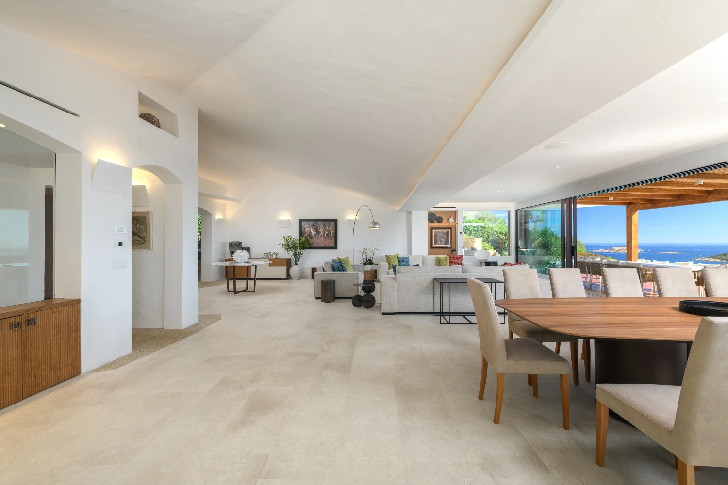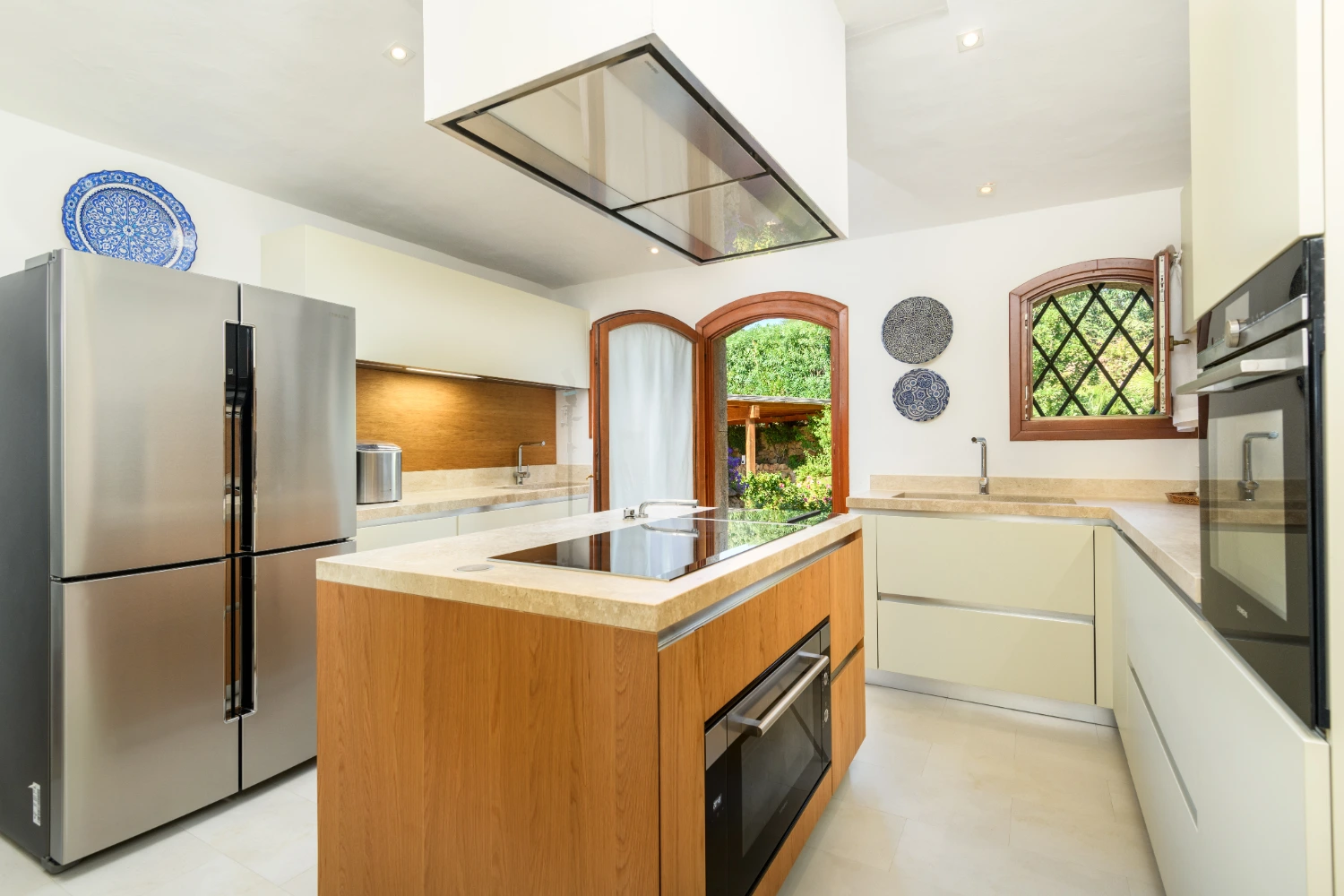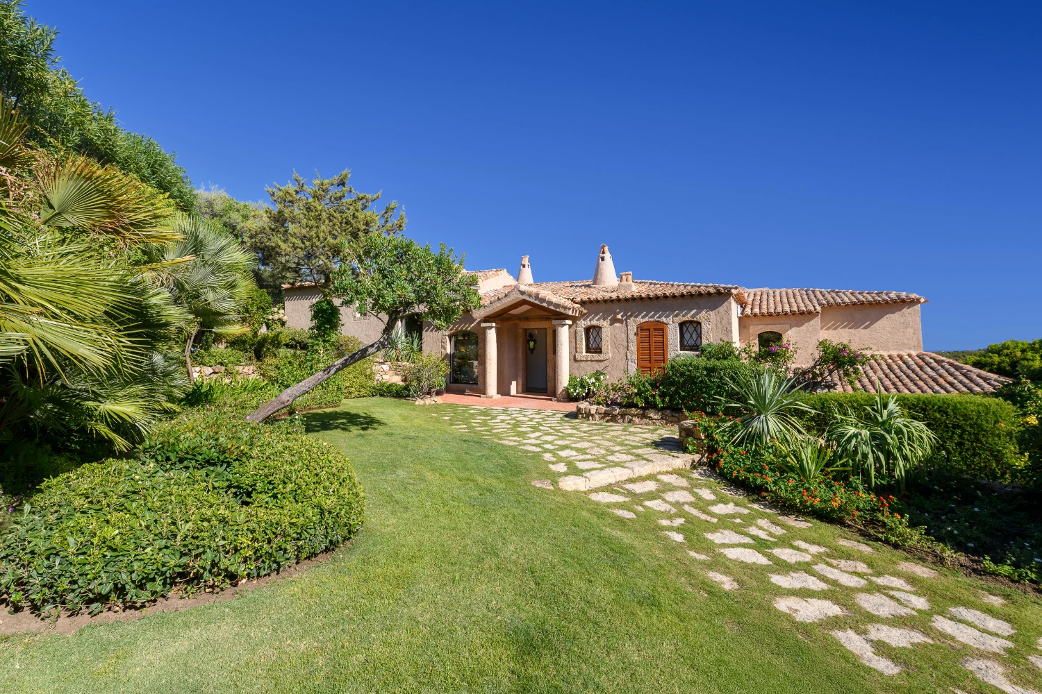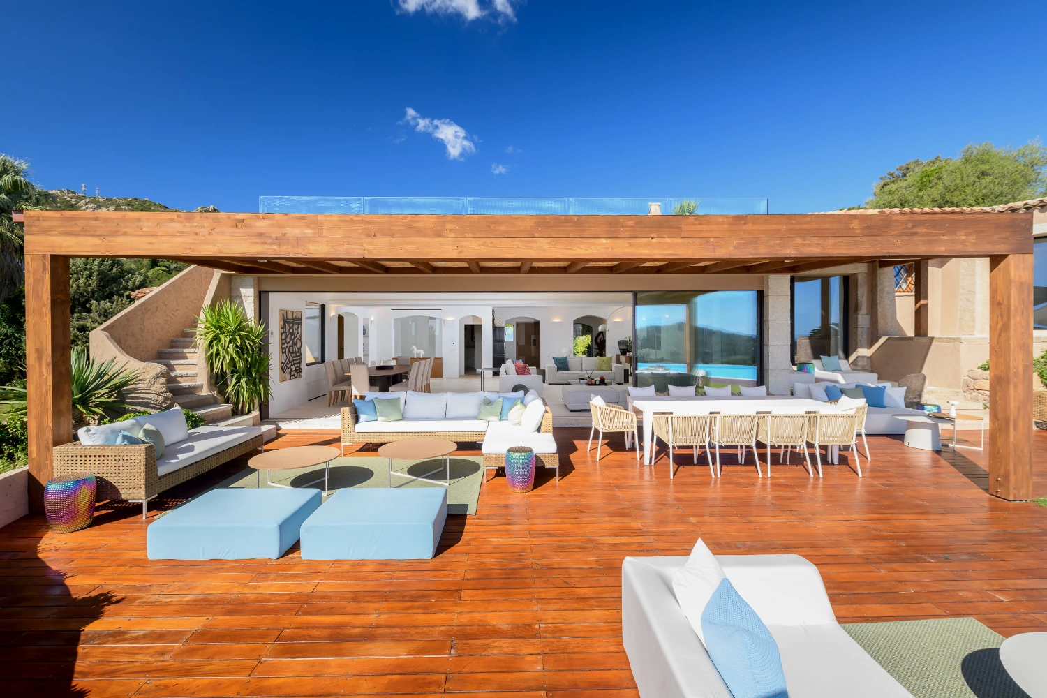 Terracotta roofs and white stone walls create a traditional Mediterranean-style exterior complemented by luxurious modern design details. Sleek marble flooring, along with classic parquet floors in the bedrooms, create an elegant interior that guarantees a restorative stay. Underfloor heating and air conditioning add a touch of luxury, ensuring comfort throughout the year.