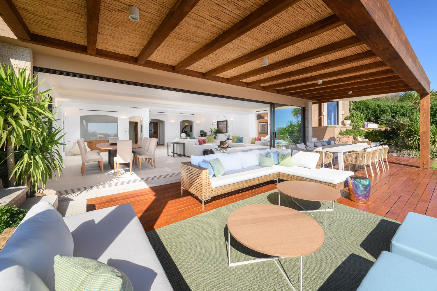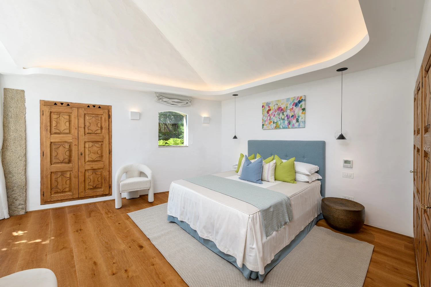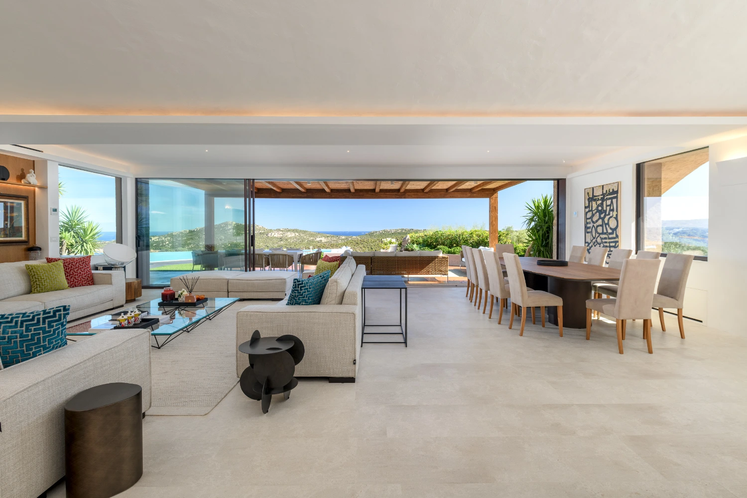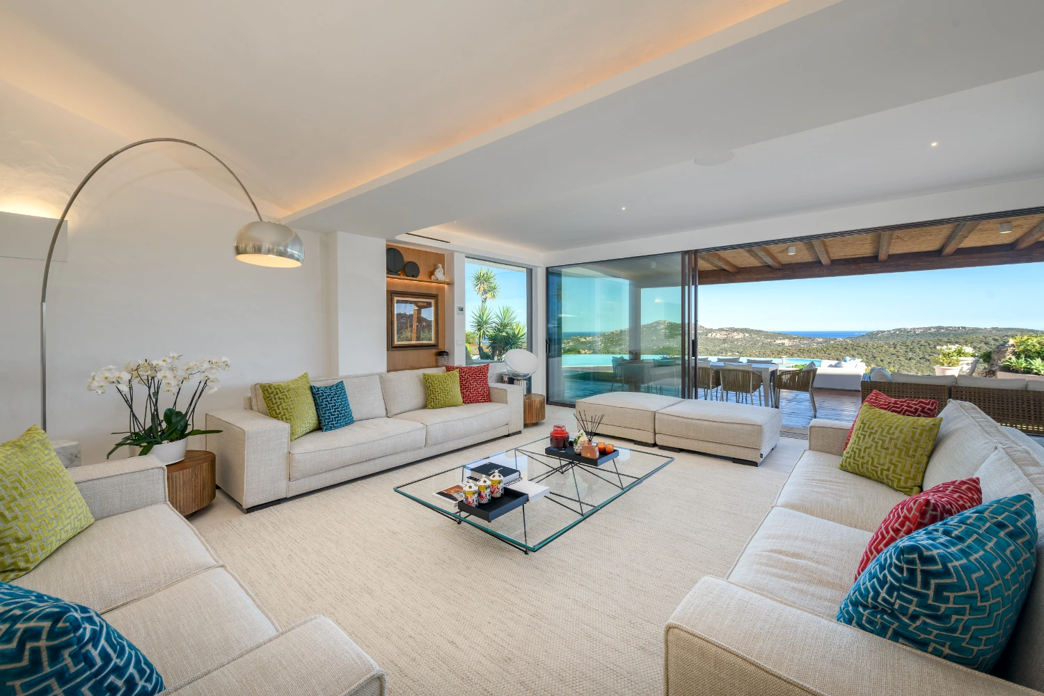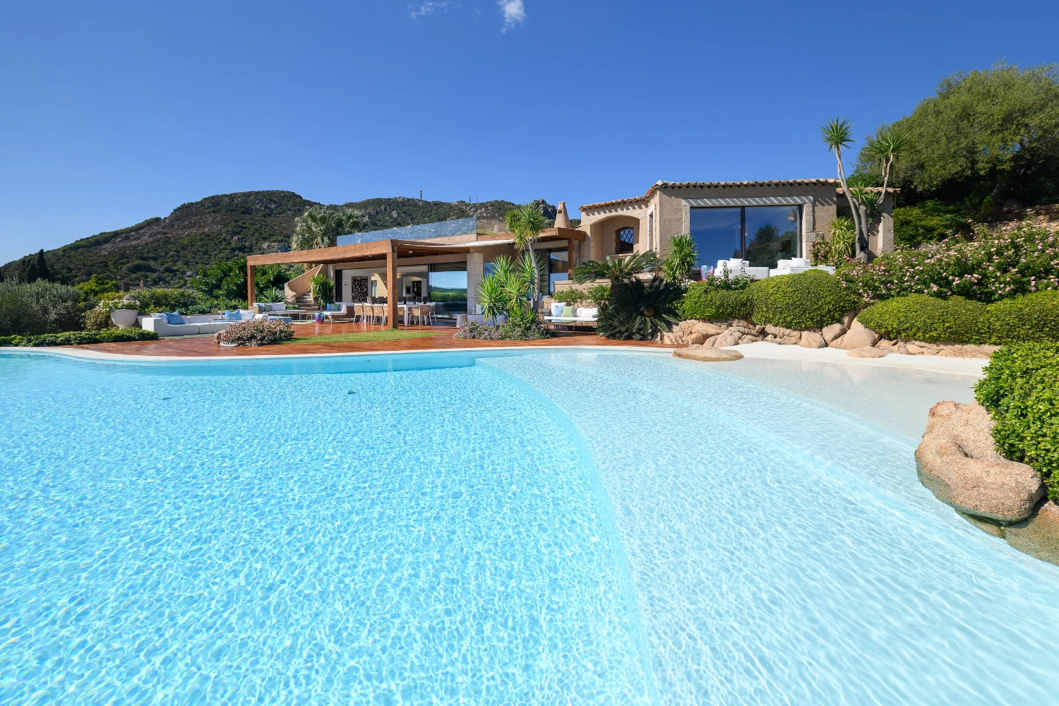 Set on a picturesque hilltop in the sun-soaked area of Pantogia, Villa Carmen is a modern luxury villa promising a peaceful retreat in one of Sardinia’s most beautiful corners. The villa’s high-end amenities include a heated pool, terrace, panoramic views, daily maid service six days a week, a wine cellar, a garden with a wellness trail, a gym, a Finnish sauna, an indoor and outdoor sound system, underfloor heating and air conditioning, electric vehicle charging stations, covered parking spaces, and a video surveillance system.