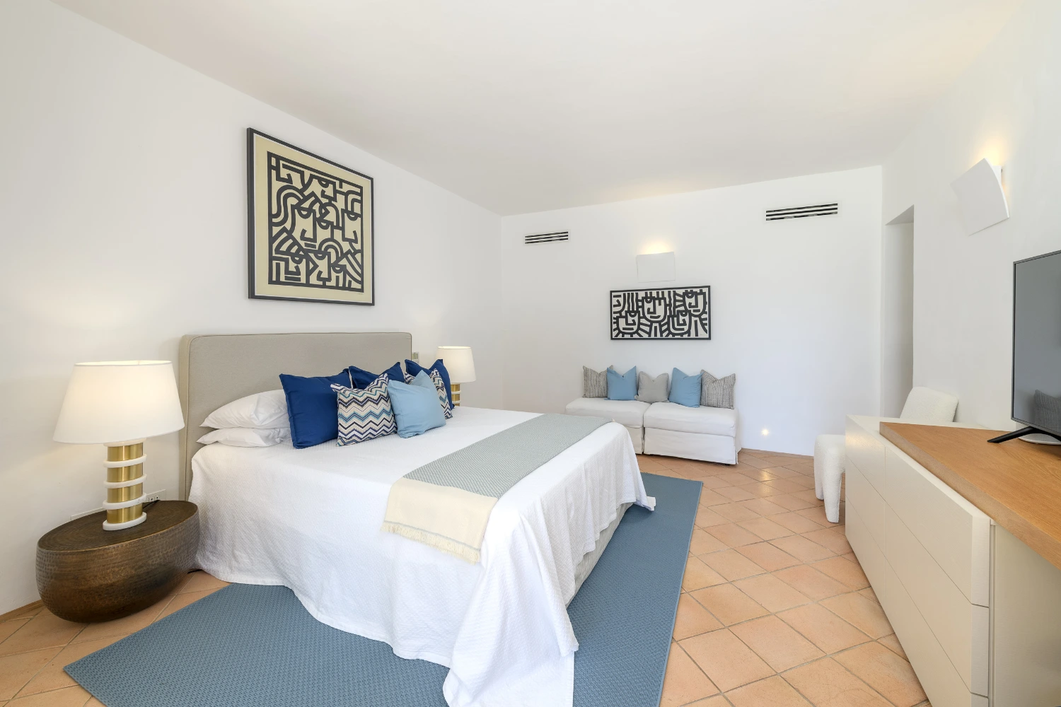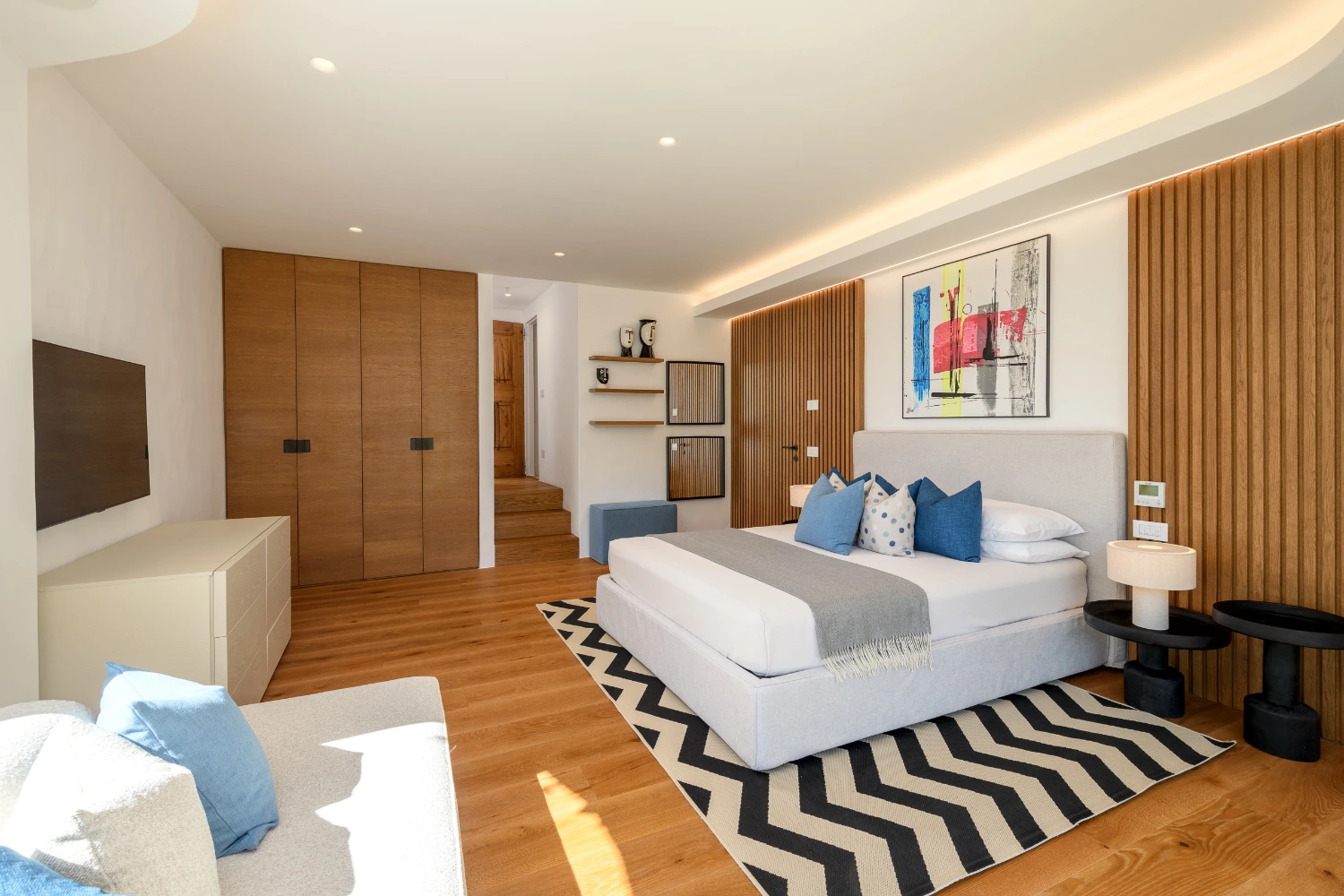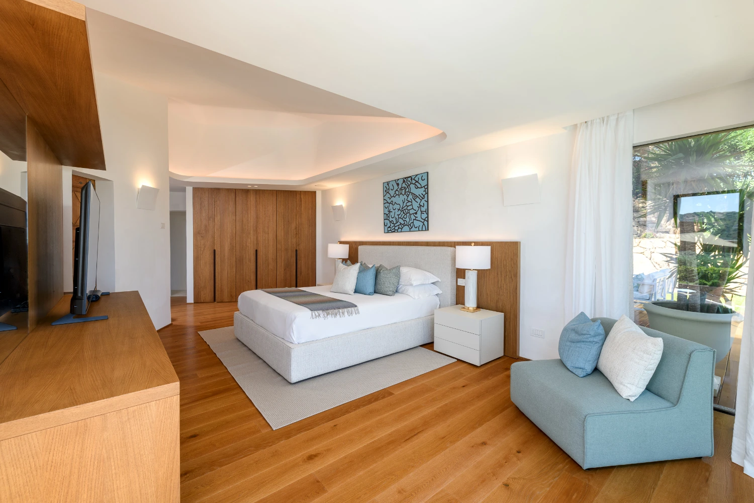 The villa features 7 bedrooms and 7 en-suite bathrooms, along with 2 staff bedrooms and 2 extra bathrooms. The villa can accommodate up to 14 guests plus 5 staff members. Each master suite boasts an expansive wardrobe, a large, flat-screen TV, and a private outdoor terrace. Daily maid service is provided six days a week.