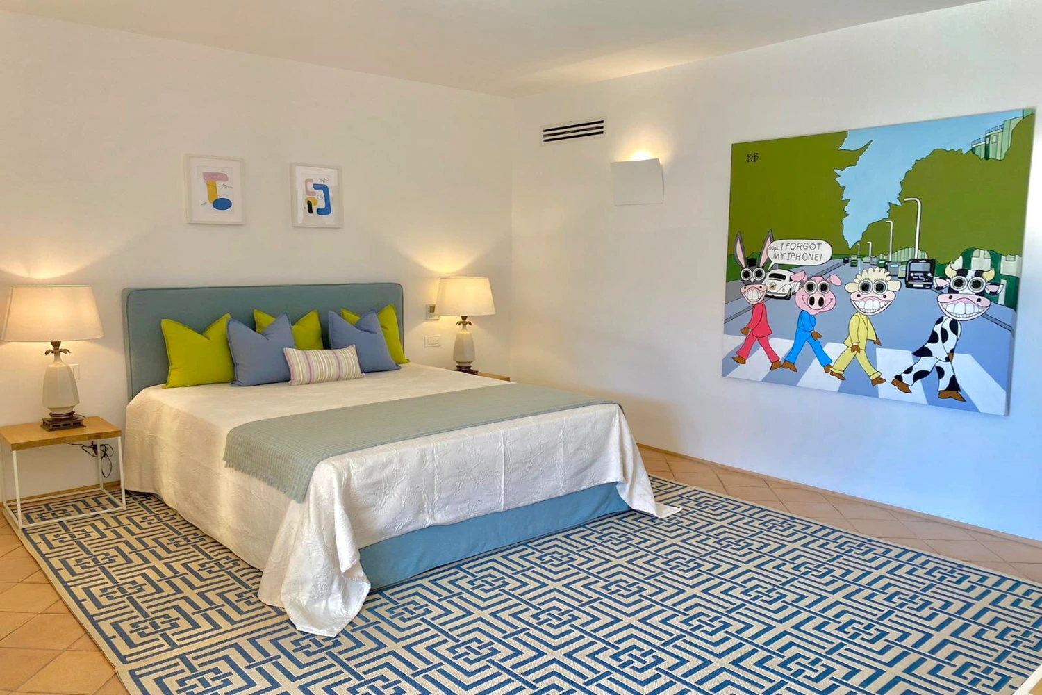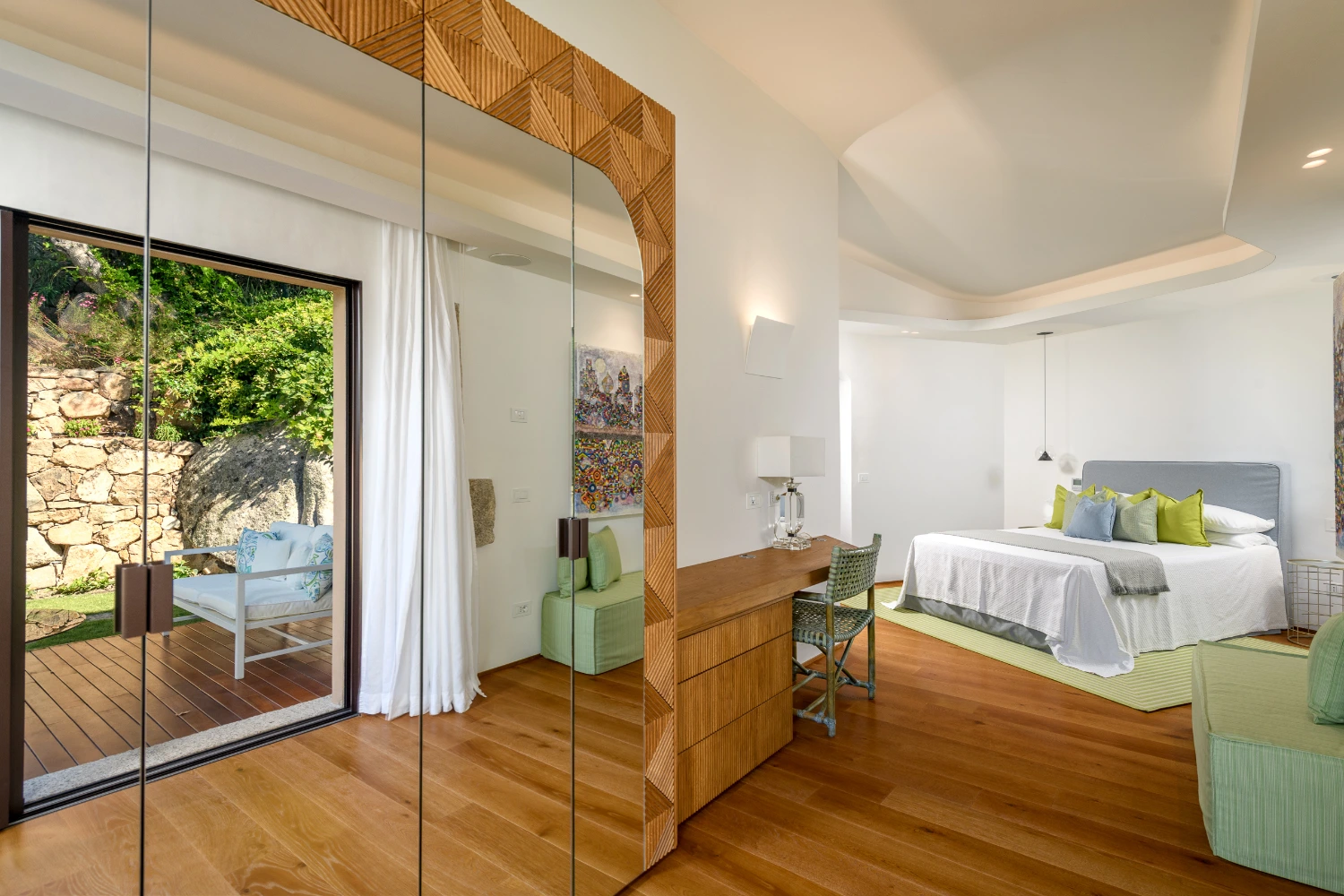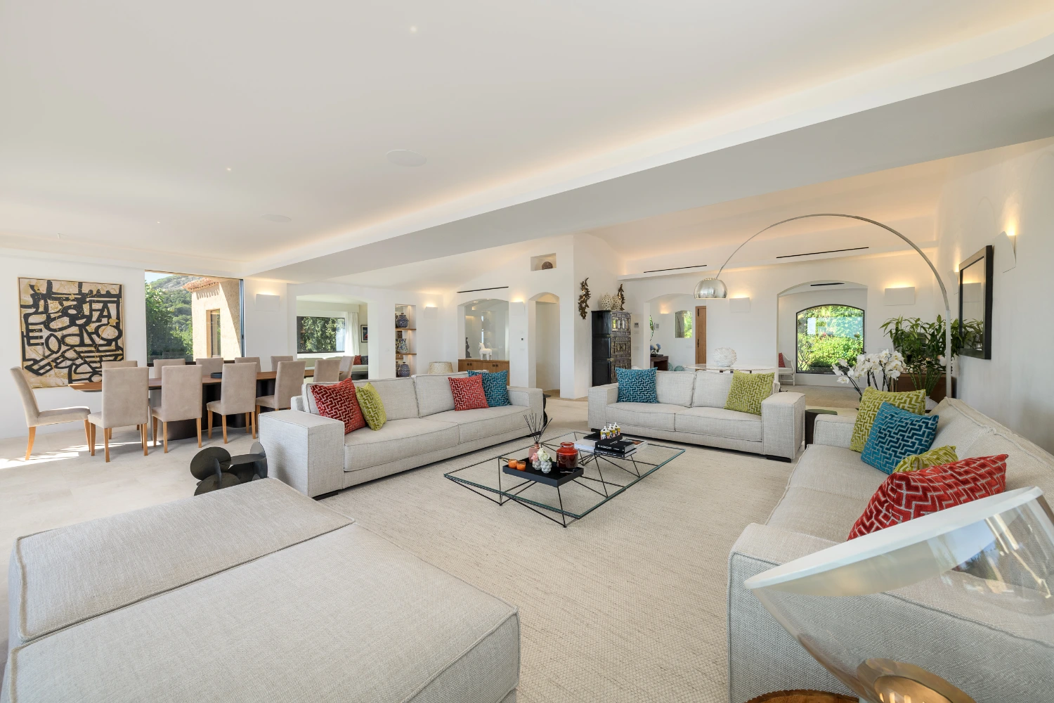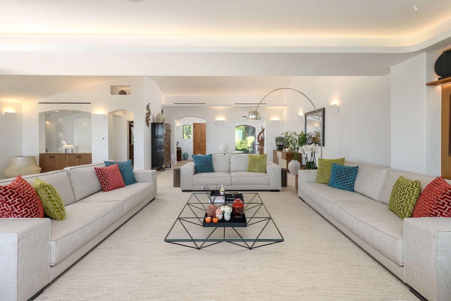 The villa features 7 bedrooms and 7 en-suite bathrooms, along with 2 staff bedrooms and 2 extra bathrooms. The villa can accommodate up to 14 guests plus 5 staff members. Each master suite boasts an expansive wardrobe, a large, flat-screen TV, and a private outdoor terrace. Daily maid service is provided six days a week.