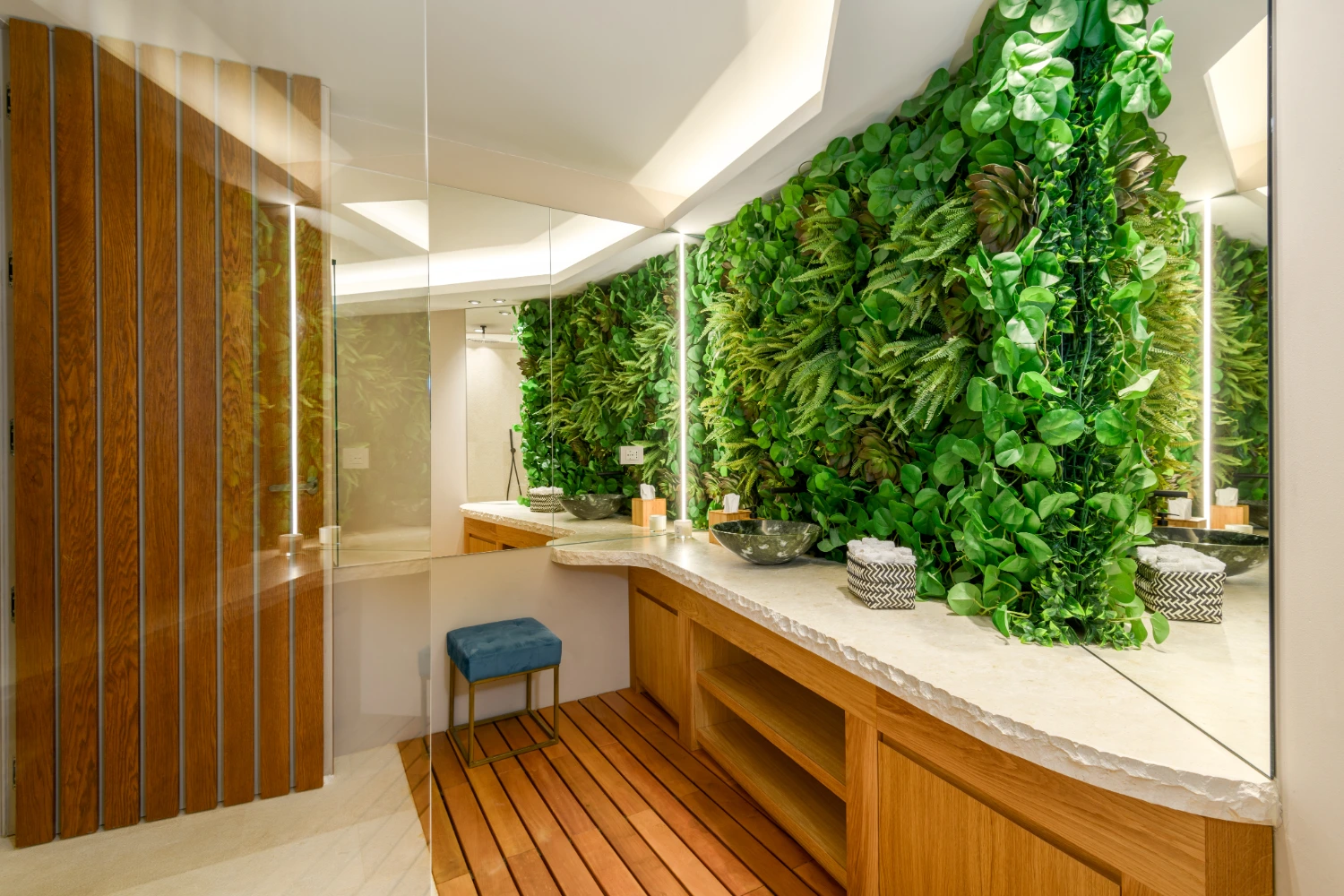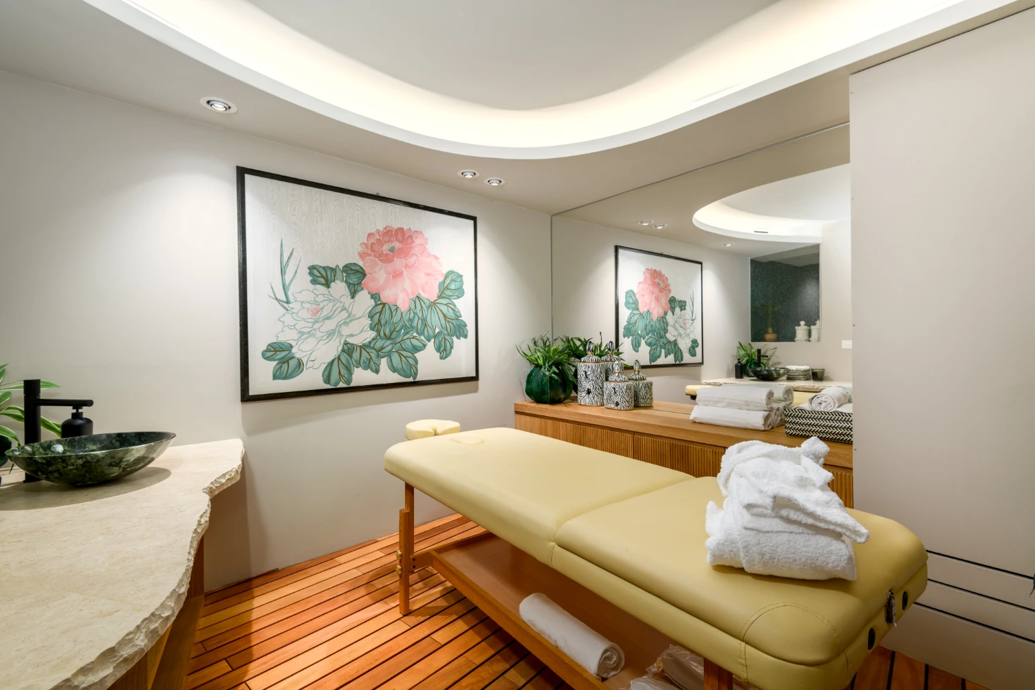 The fully equipped kitchen includes double ovens, a teppanyaki hot plate, an ice maker, and a coffee machine. Prepare a delicious dinner in the kitchen and pair it with the perfect bottle plucked from the nearby wine cellar featuring a dedicated refrigerator. A separate staff kitchen provides extra privacy for both guests and staff members.
