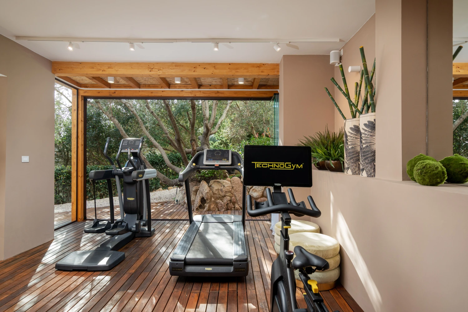 The gym at Villa Carmen features Technogym equipment and a glass wall that opens up to allow cool sea breezes to enter. Guests can relax in the garden or hit the wellness trail for an invigorating walk under the sun. After an intense workout or a leisurely hike, relax in the Finnish sauna, complete with a steam room, massage room, and chillout area with a TV.