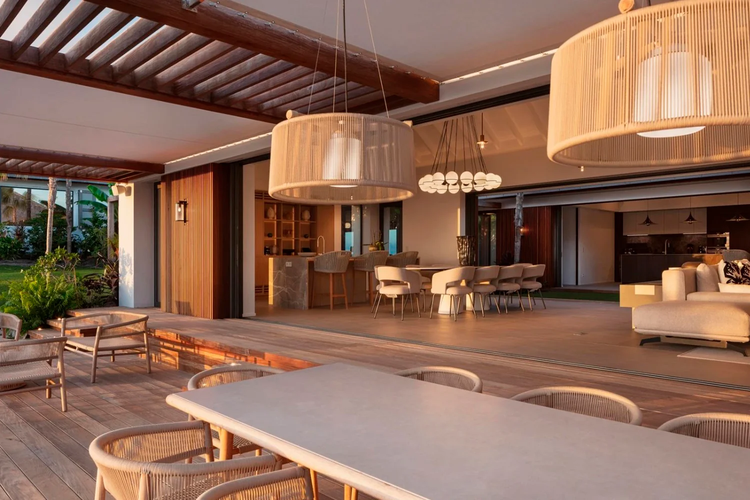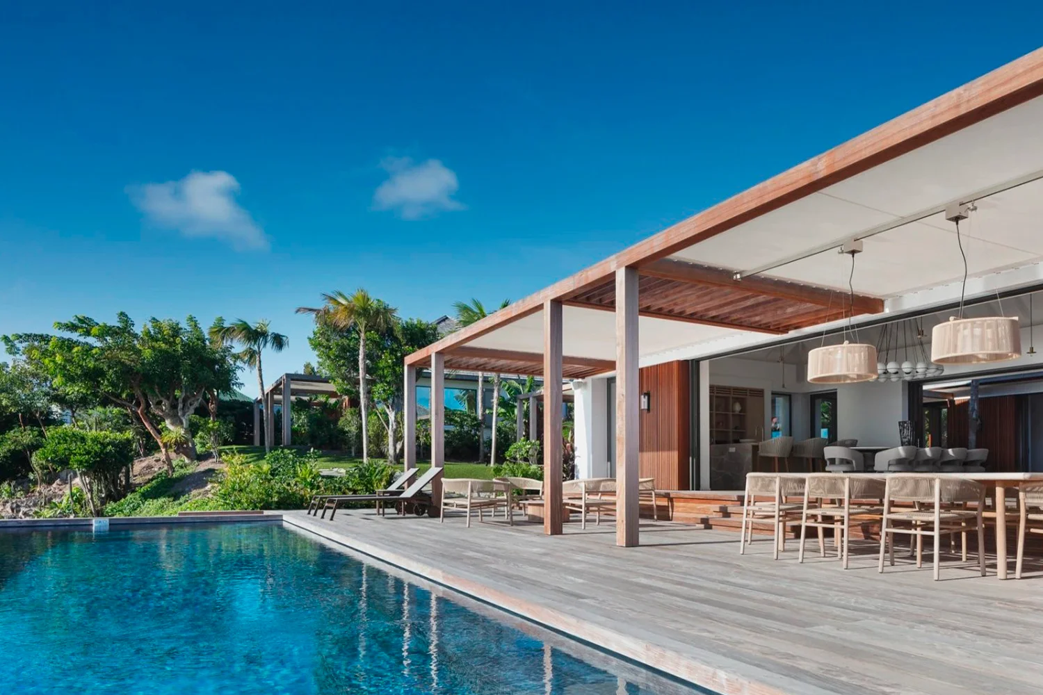 The open-plan living room and dining area features a large, flat-screen TV, a sectional sofa, and a sleek oval dining table set beneath elegant pendant lights. The terrace-facing wall opens up to let in sea breezes, allowing guests to glide to the pool and furnished outdoor areas. The heated pool invites a swim at any time of day. Here guests can relax poolside on sun loungers or dig into the latest beach read beneath a parasol.