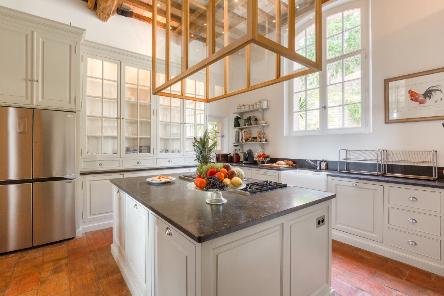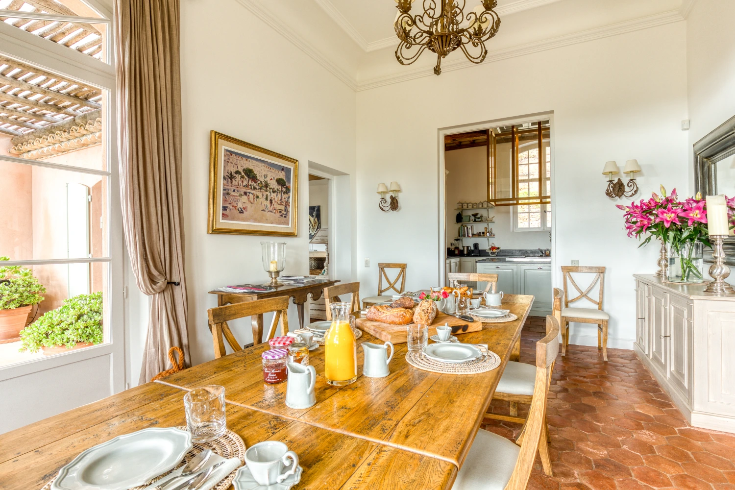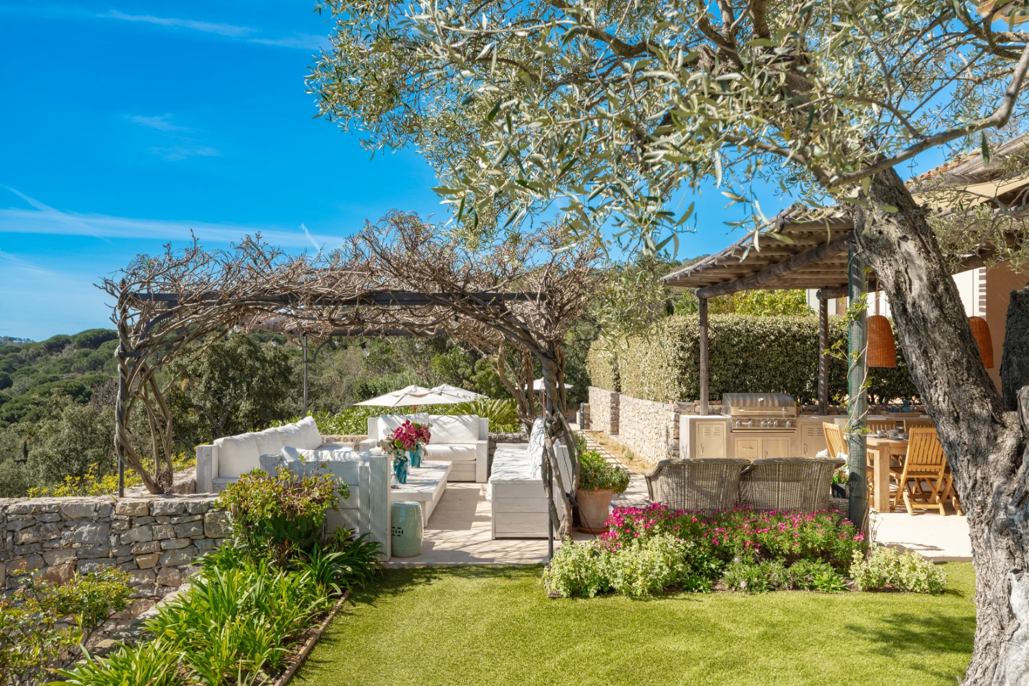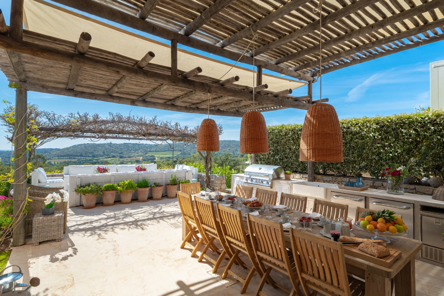 The fully equipped kitchen features a large center island, two extra-large ovens, a Senseo coffee maker, and other top-tier appliances. The dining room has seating for up to 10 guests and opens directly onto the terrace, an al fresco dining area, and garden. The summer kitchen has a covered outdoor dining area with stylish drop lighting and a gas BBQ, where guests can prepare delicious homemade meals during their stay.