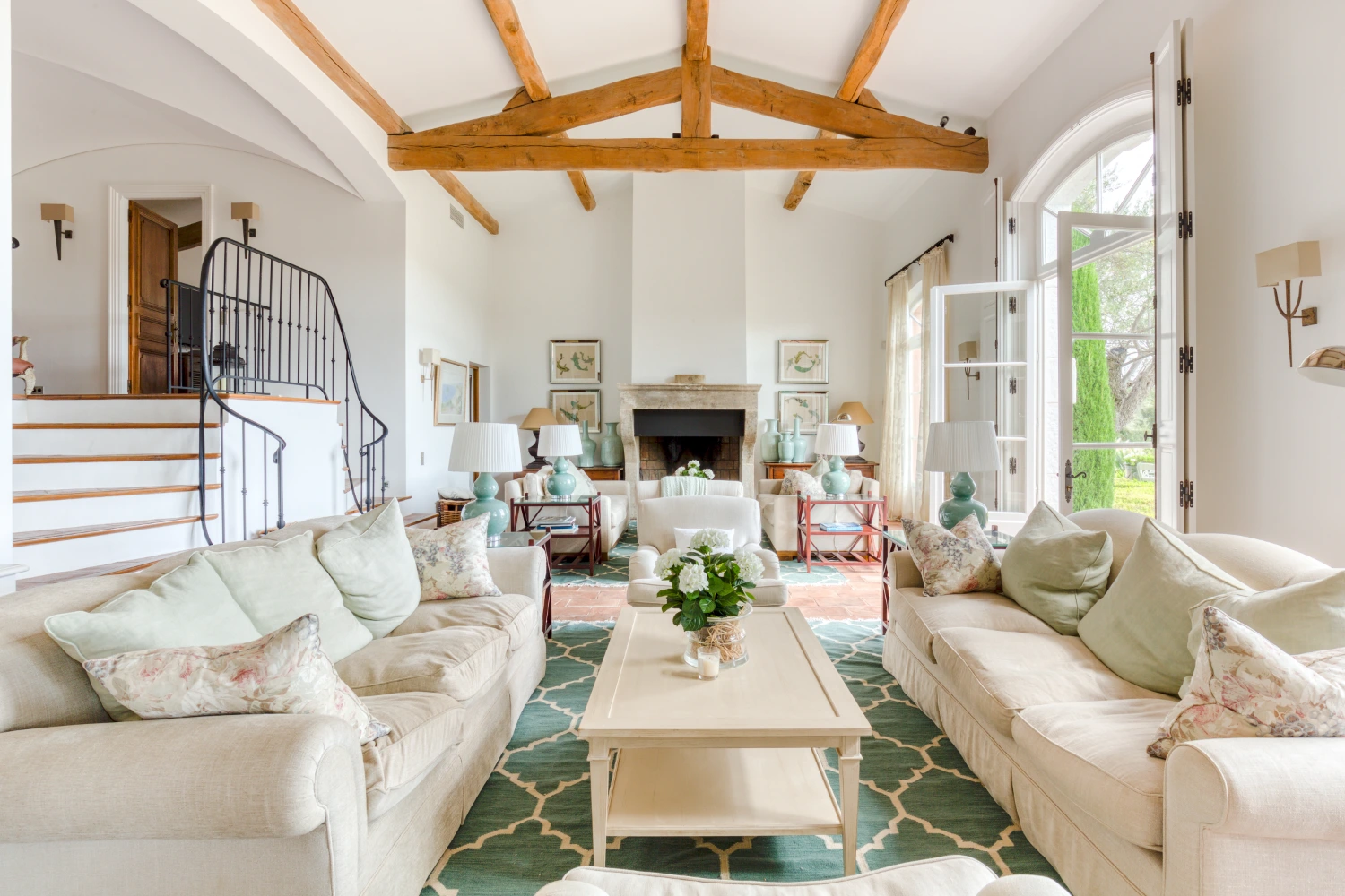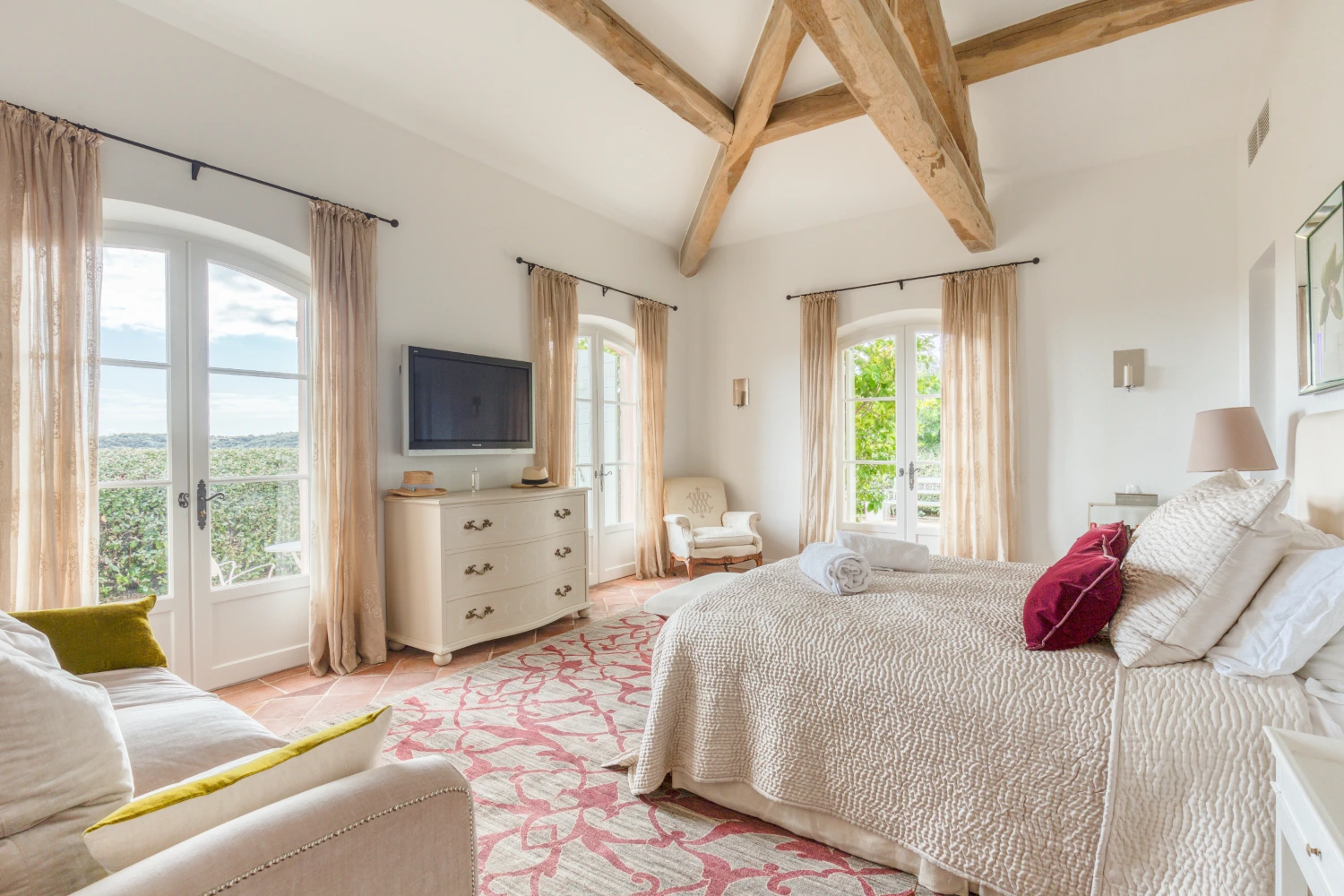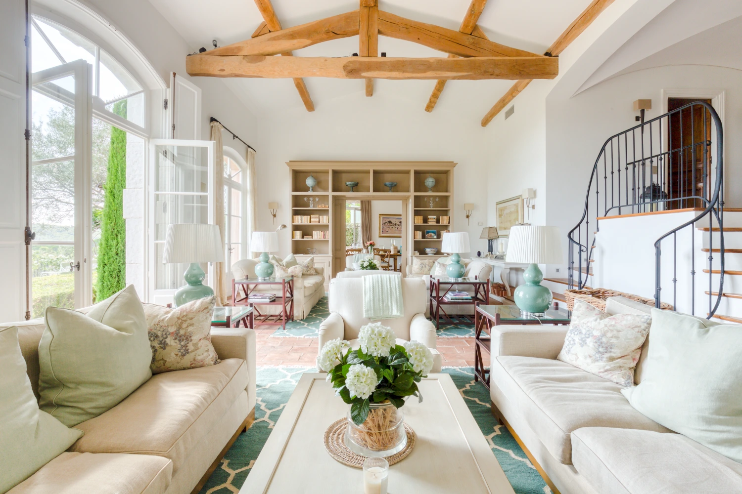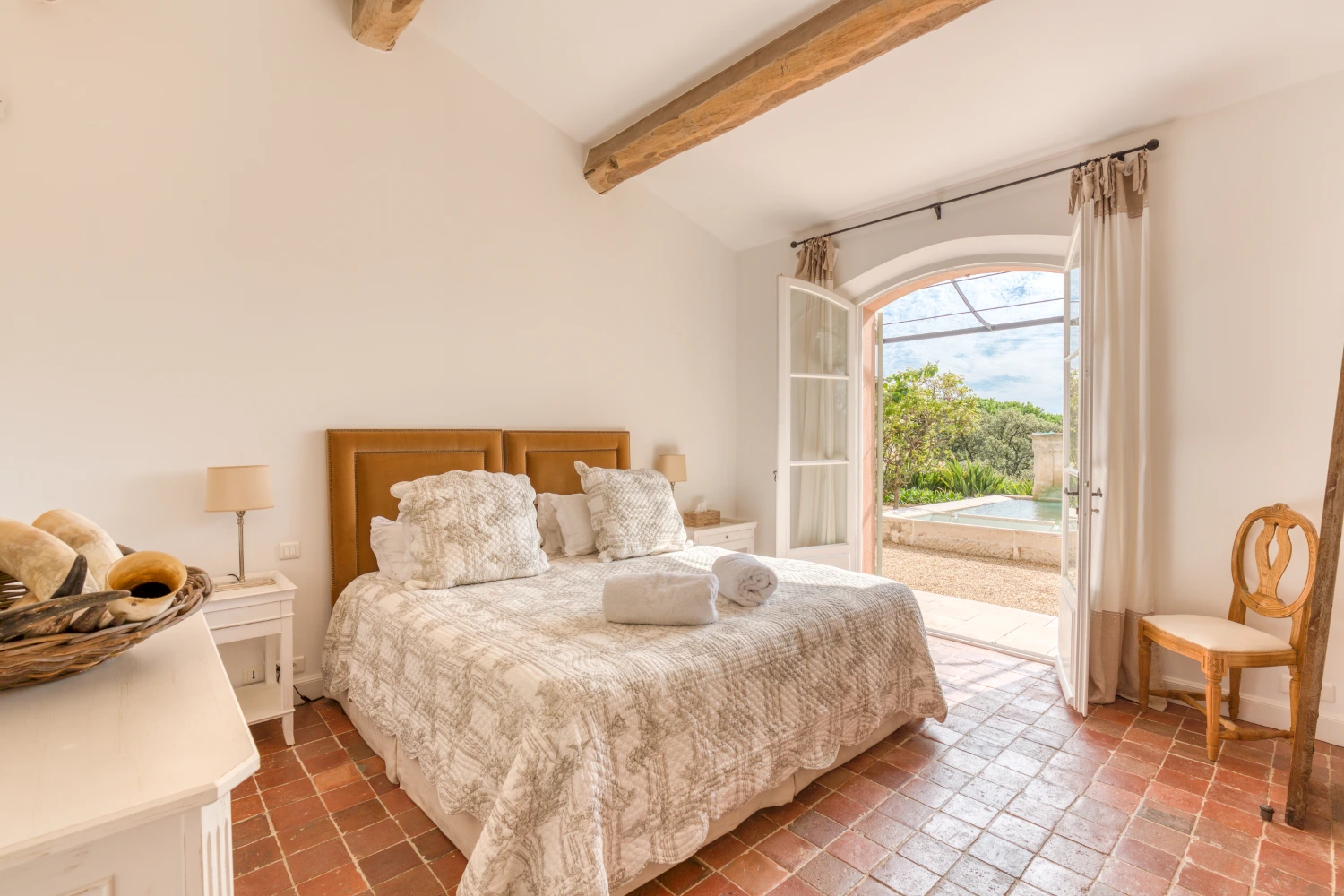 Cool tile floors, exposed beam ceilings, and elegant furnishings in neutral tones create a restorative environment in Villa Wisteria. The living room features two distinct seating areas, one with a large, flat-screen TV. From here, glide through glass French doors onto the spacious terrace. Take in stunning views of the sea and the beautiful Pampelonne beaches throughout Villa Wisteria’s open-air spaces. The library, with a fireplace and deep-cushioned sofa, serves as a peaceful retreat for reading a book or enjoying a cup of tea.