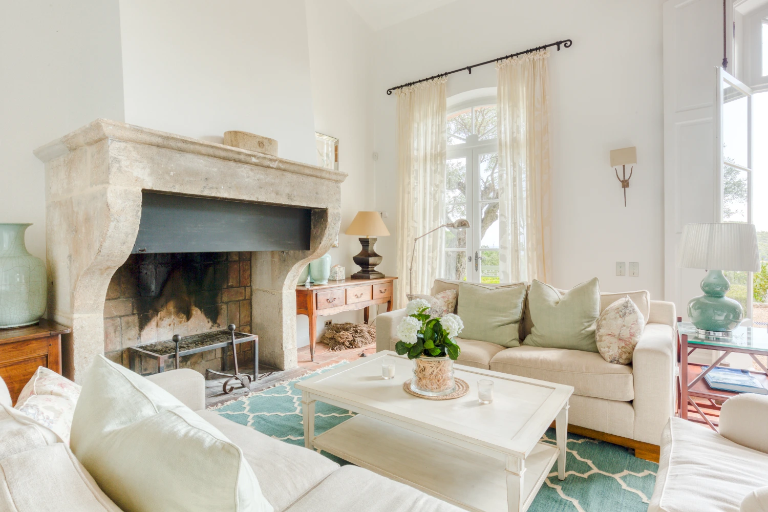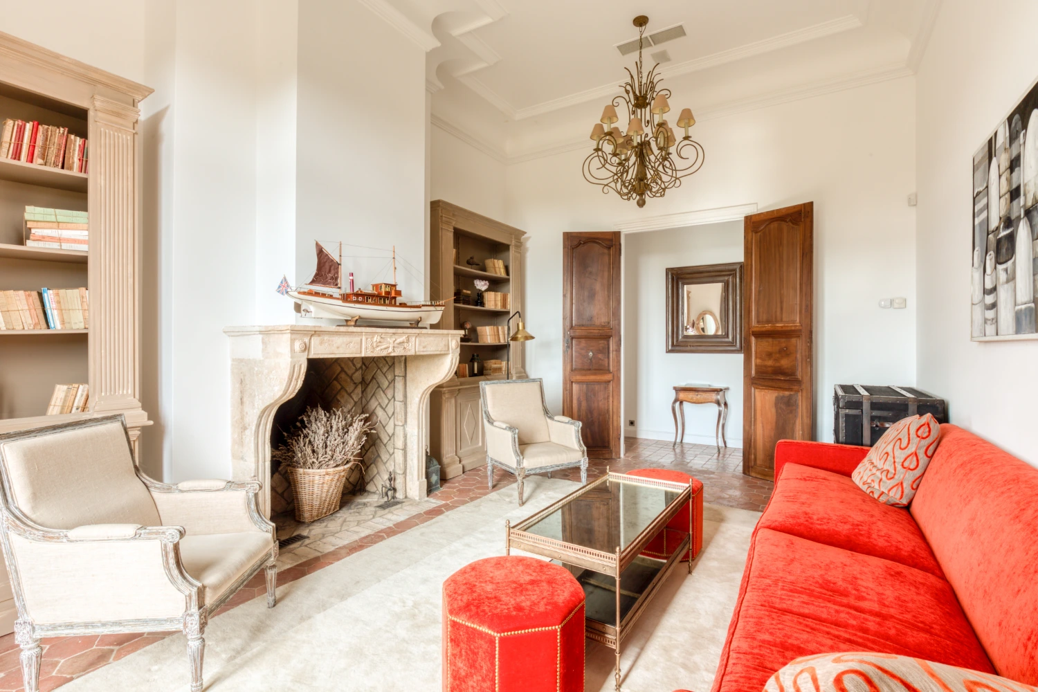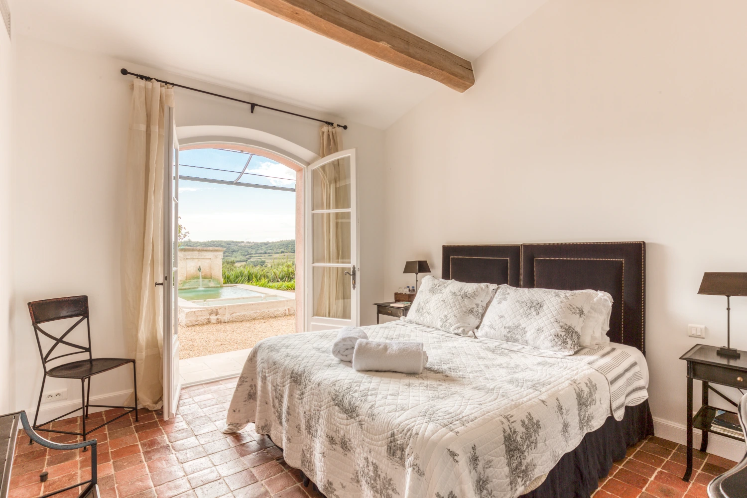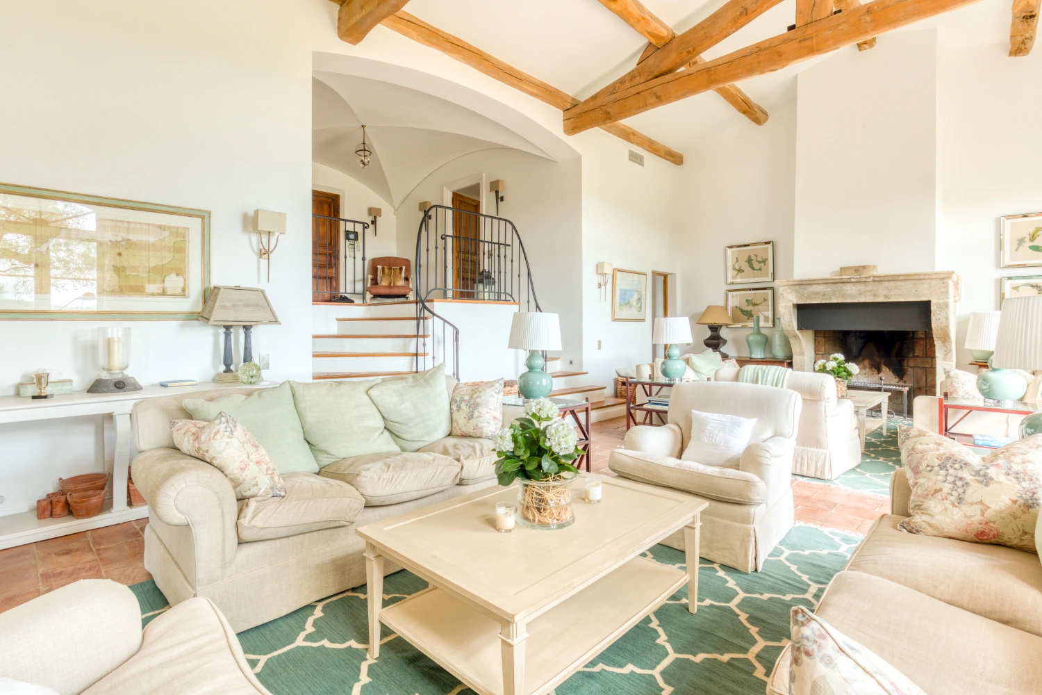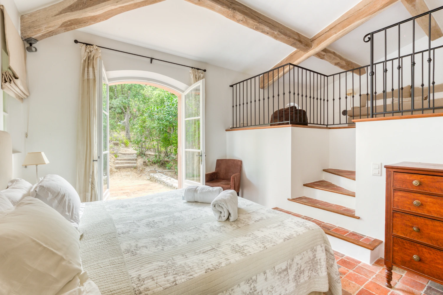 Cool tile floors, exposed beam ceilings, and elegant furnishings in neutral tones create a restorative environment in Villa Wisteria. The living room features two distinct seating areas, one with a large, flat-screen TV. From here, glide through glass French doors onto the spacious terrace. Take in stunning views of the sea and the beautiful Pampelonne beaches throughout Villa Wisteria’s open-air spaces. The library, with a fireplace and deep-cushioned sofa, serves as a peaceful retreat for reading a book or enjoying a cup of tea.