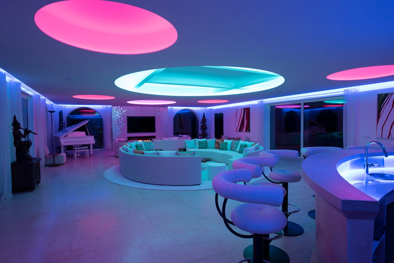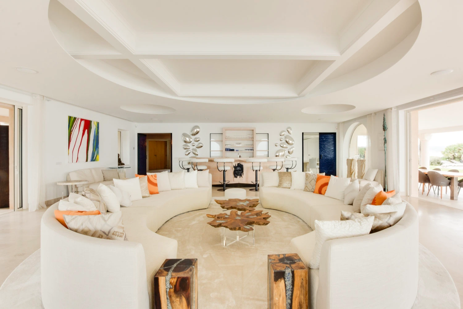 Prepare delicious meals in the fully equipped kitchen or gather in the stylish lounge furnished with two curved sofas facing each other, a piano, and a large, flat-screen TV. A sleek, curved bar rests at one end of the lounge, ideal for sharing a pre-dinner cocktail.