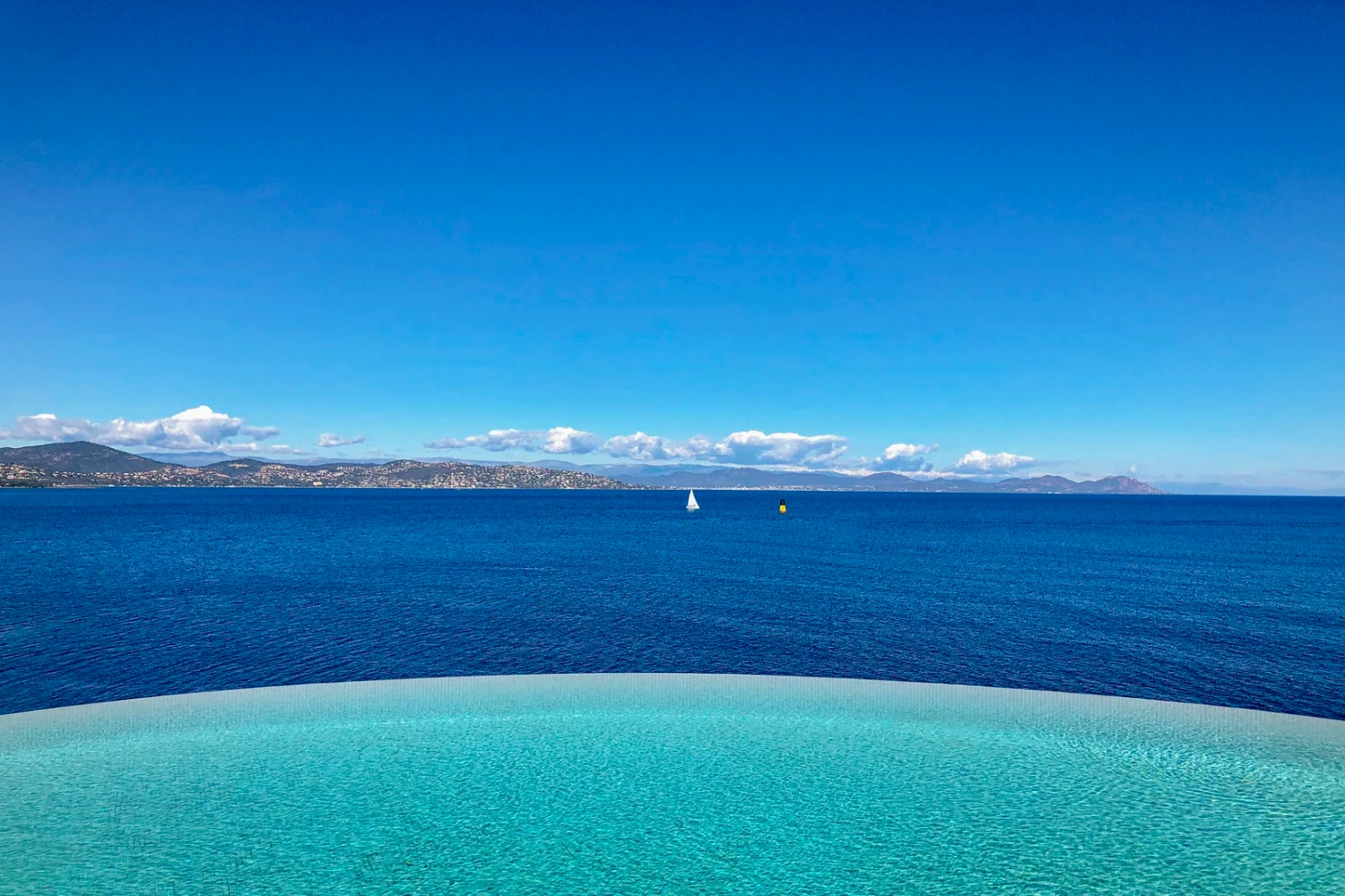 The lounge offers direct access to the pool and Jacuzzi, where guests can take in 270-degree views of the sparkling Canoubiers Bay. The elegant, curved infinity pool rests at the edge of the property, set against a breathtaking backdrop of turquoise water. Recline poolside on a sunbed or slip into the Jacuzzi for a restorative soak.