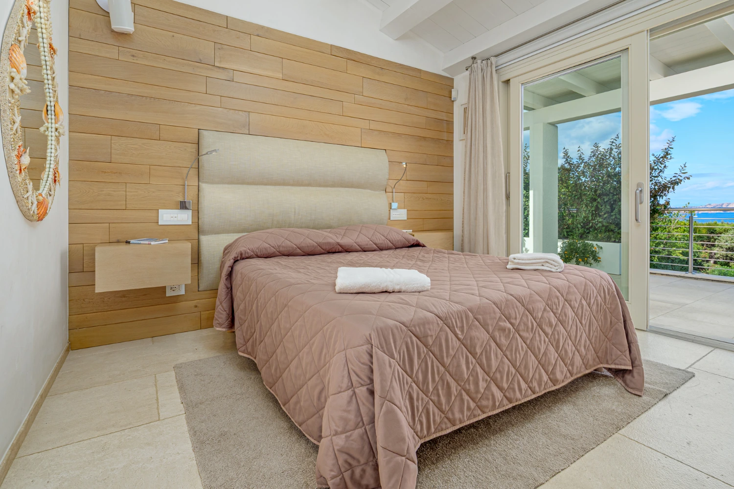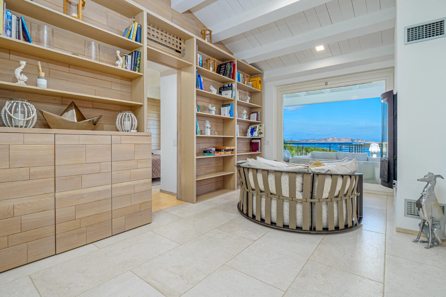 The kitchen showcases a marble-topped island with bar seating beneath elegant pendant lighting. Move with ease from the living room and the kitchen onto the spacious outdoor terrace. Prepare delicious Mediterranean dishes at the BBQ and dine al fresco against a backdrop of the pool and turquoise sea. Unwind in the solarium or relax at various furnished areas on the terrace, where you can sink into a cushioned sofa and take in gorgeous views of the sea.
