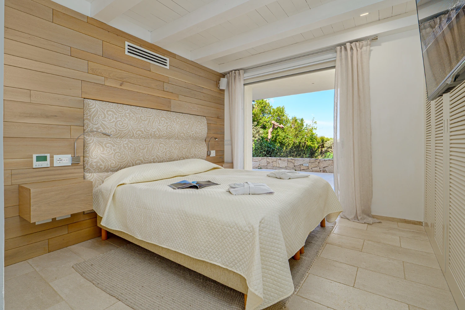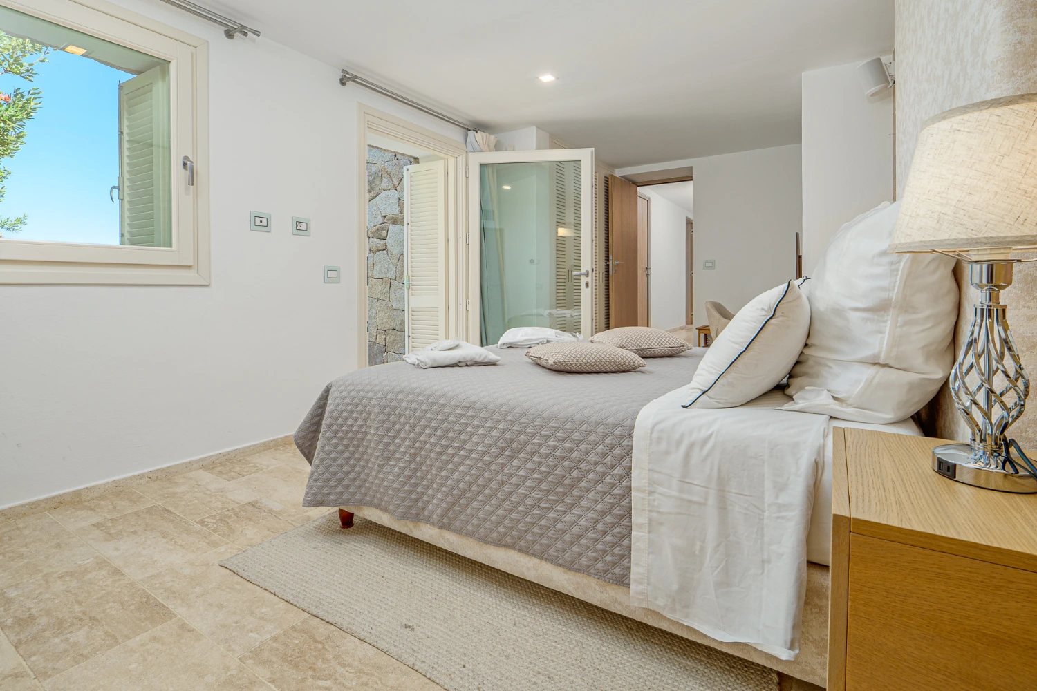 A rustic stone exterior and terracotta roofs lend this luxurious villa classic Mediterranean charm, while modern details like a gym and a BBQ enhance the vacation experience. The equipped gym is set apart from the rest of the villa and features sliding glass doors, which can be left open to provide the experience of working out in the open air.