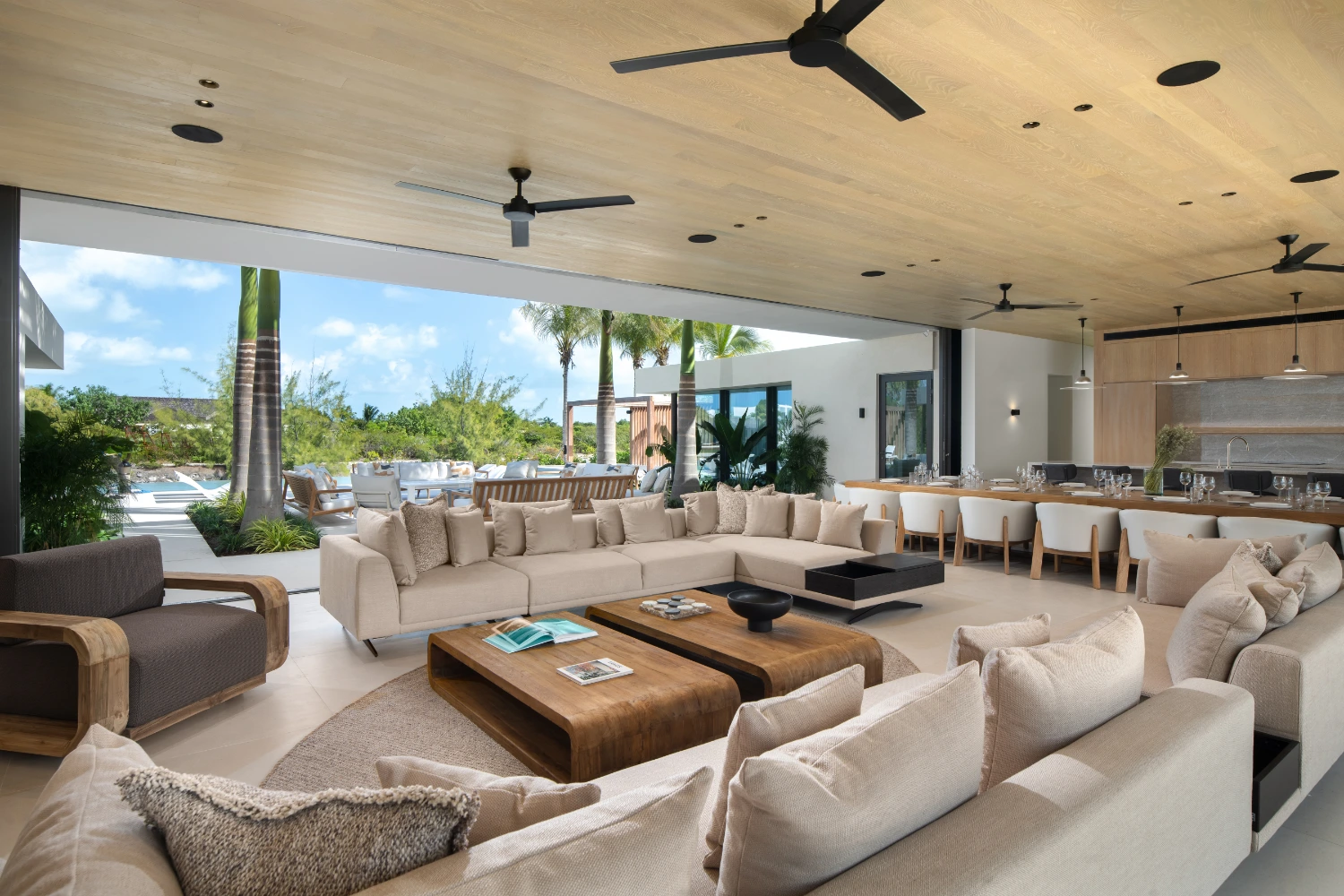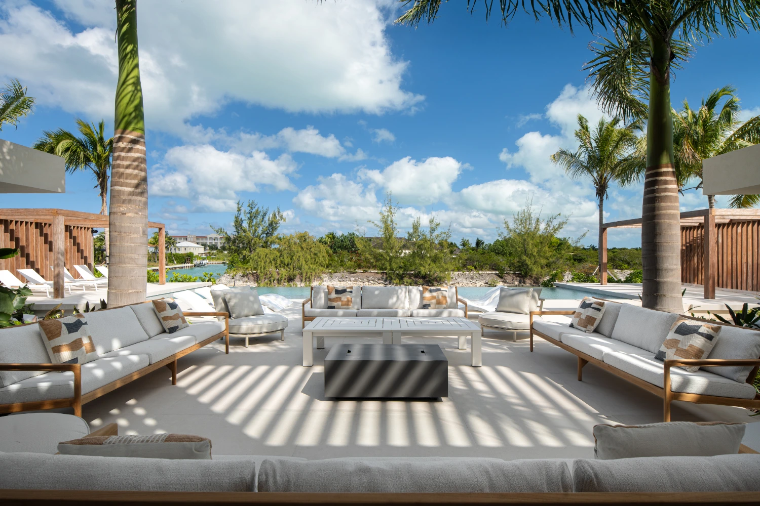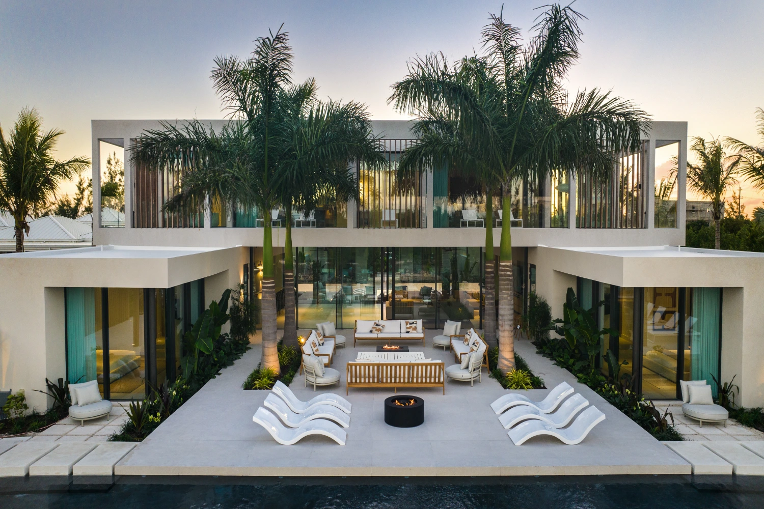 Experience luxurious indoor-outdoor living as you move from the main living space to the spacious terrace. Relax in furnished outdoor areas beneath the shade of towering palm trees. Once the sun goes down, cozy up around the fire pit to savor the last hours of the day.