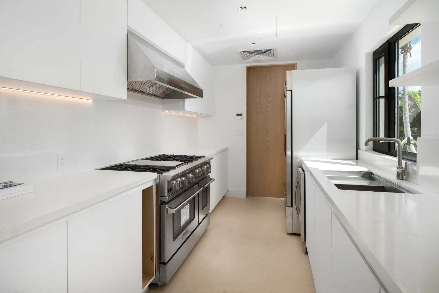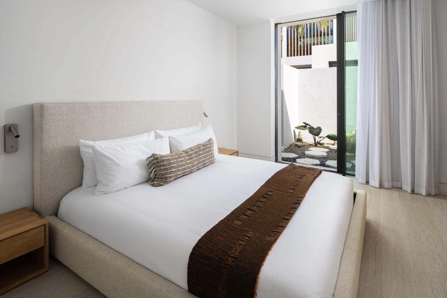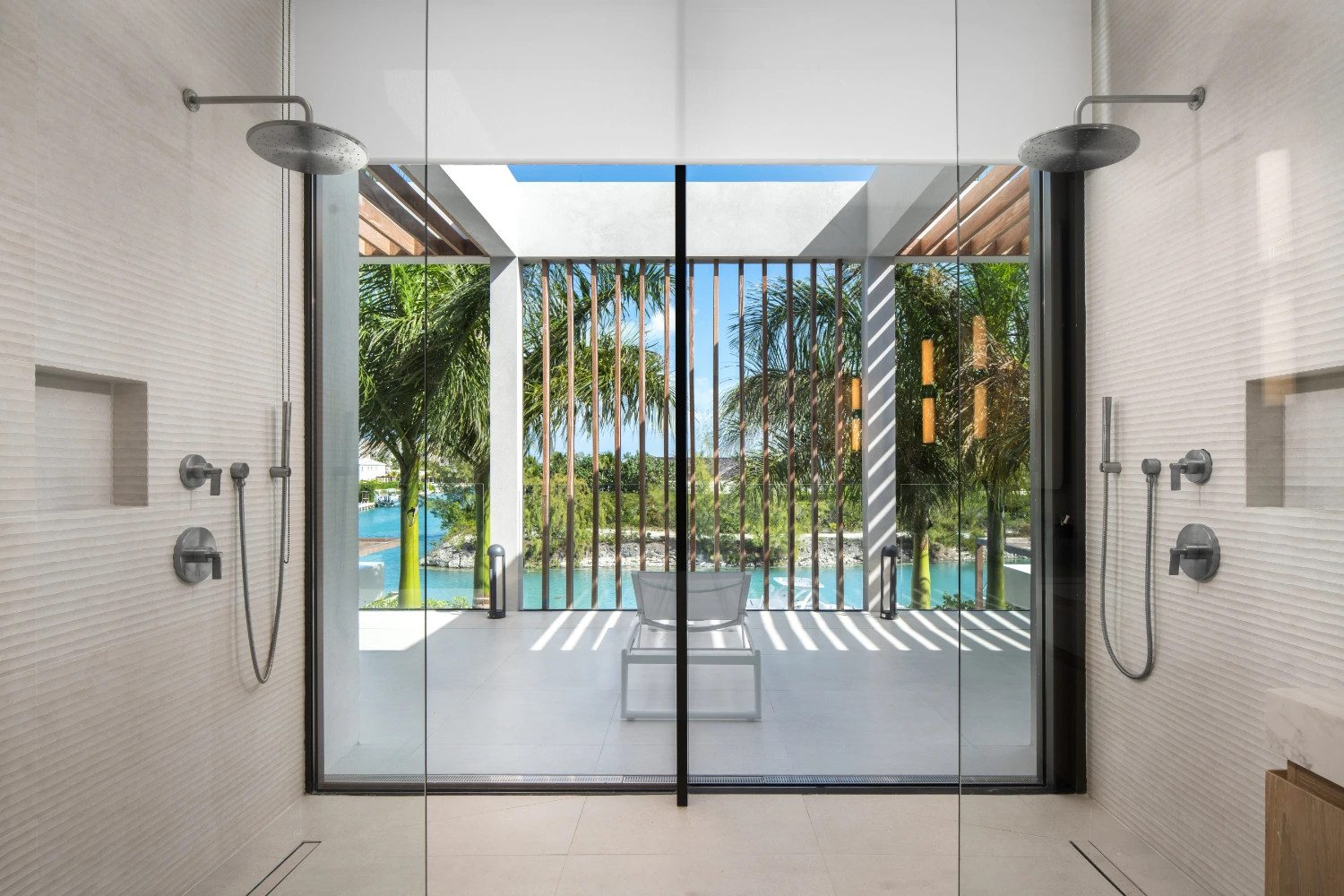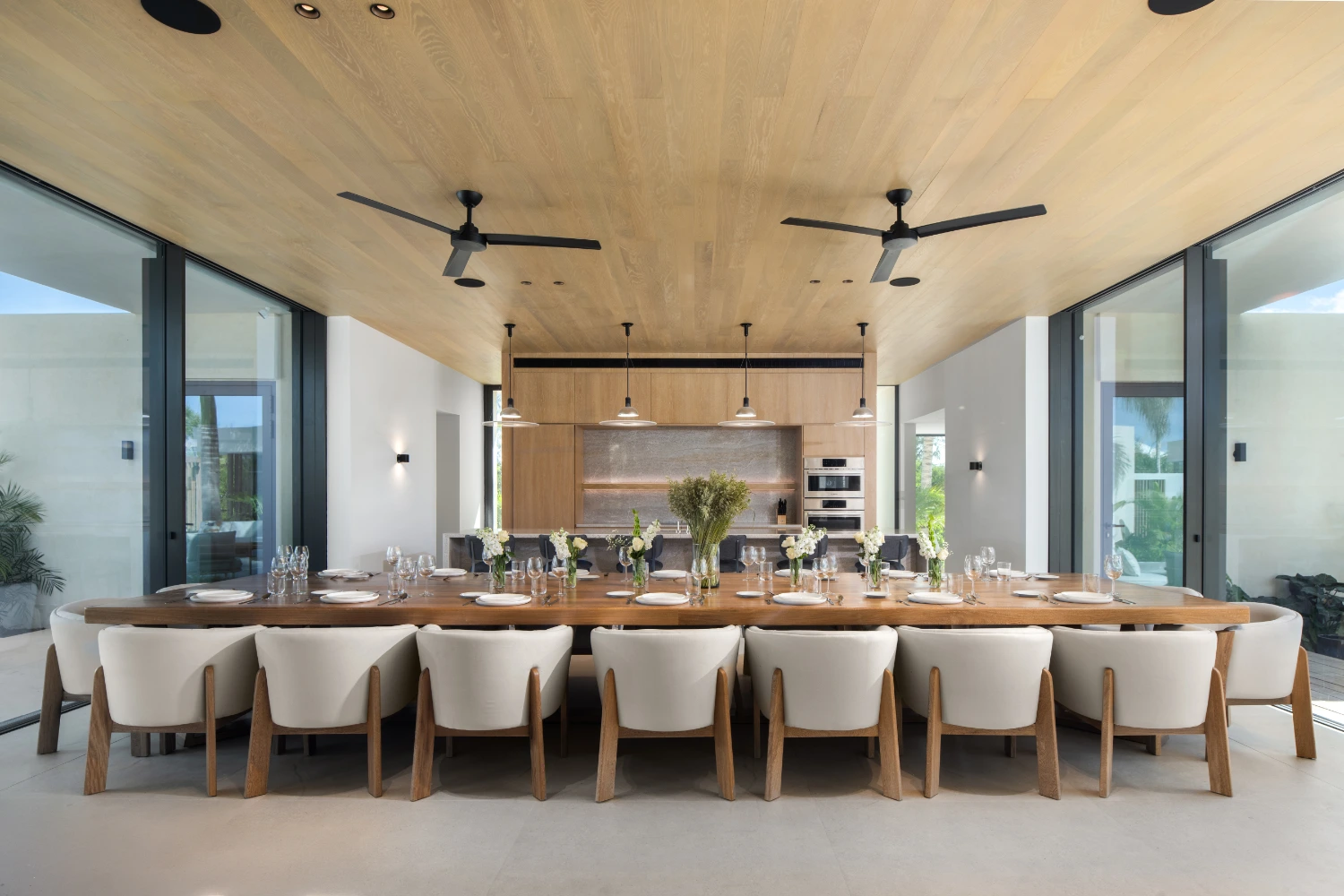 Experience luxurious indoor-outdoor living as you move from the main living space to the spacious terrace. Relax in furnished outdoor areas beneath the shade of towering palm trees. Once the sun goes down, cozy up around the fire pit to savor the last hours of the day.