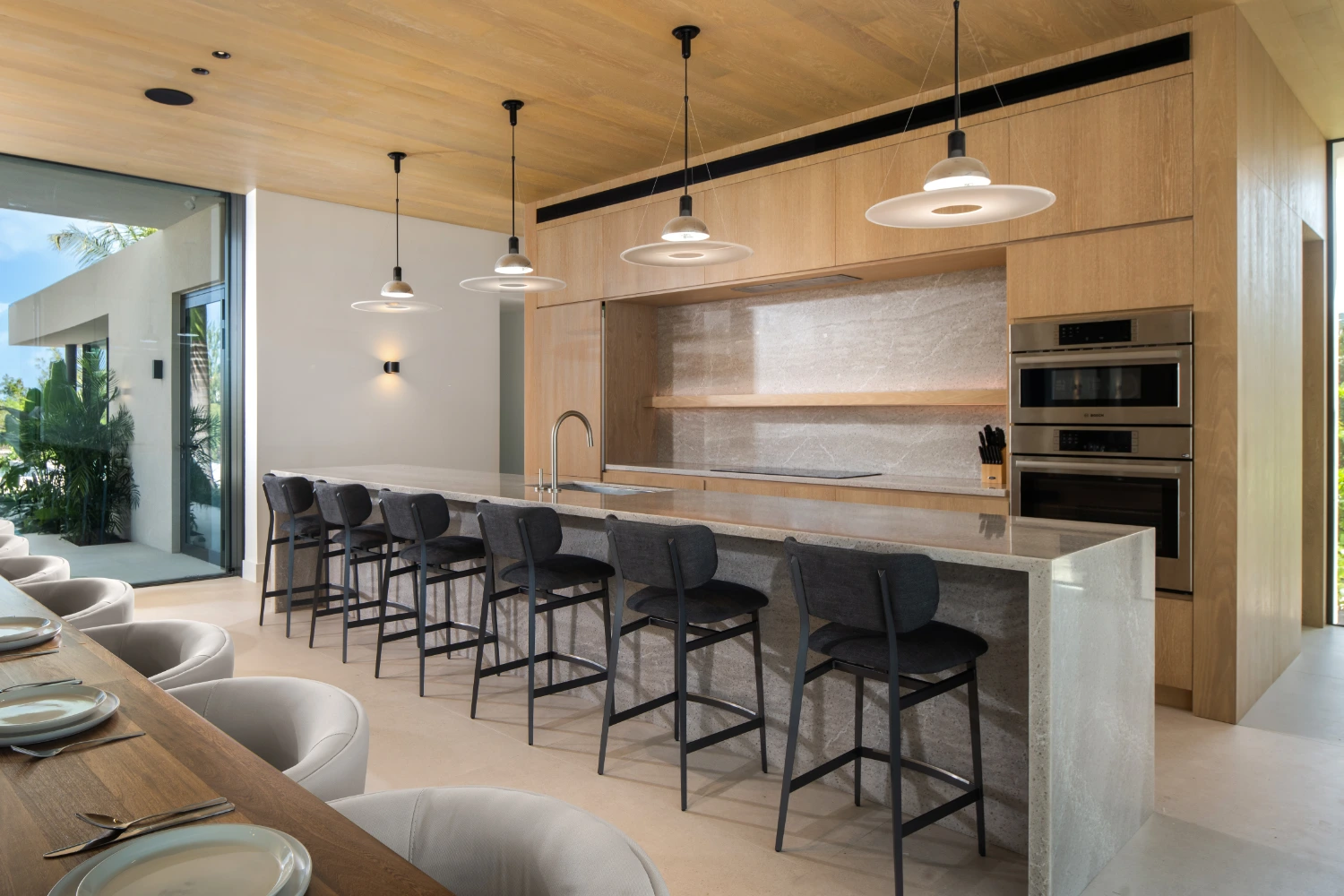 The expansive living space opens up on both sides to allow invigorating sea breezes to waft through the room. The living room, featuring deep-cushioned sofas and a large, flat-screen TV, blends seamlessly into the dining area and chef’s kitchen equipped with bar seating.