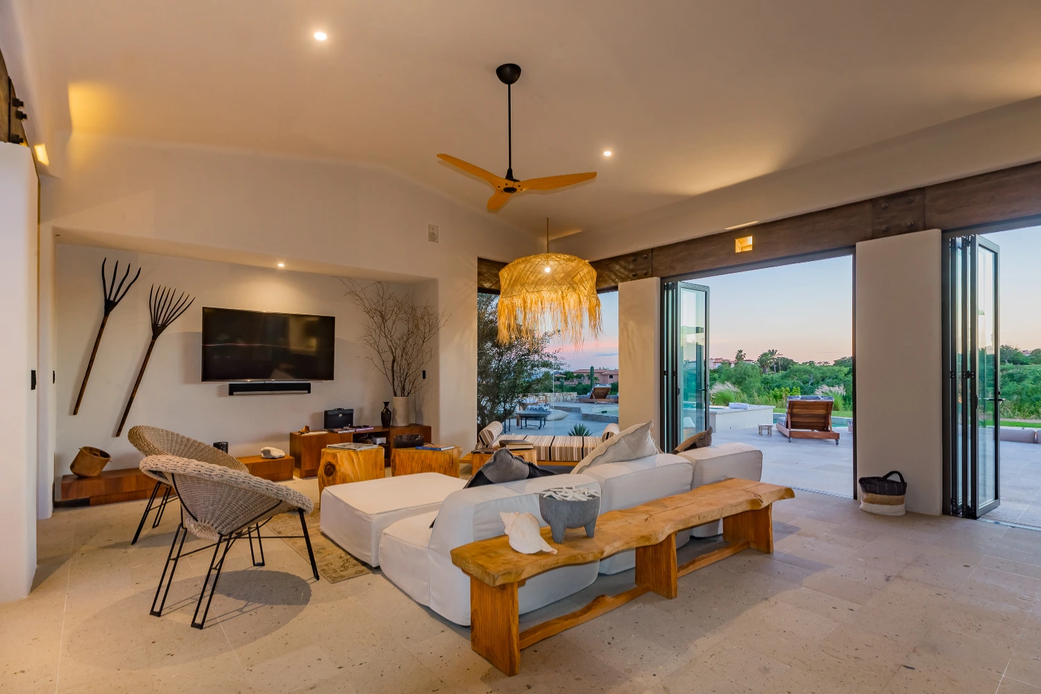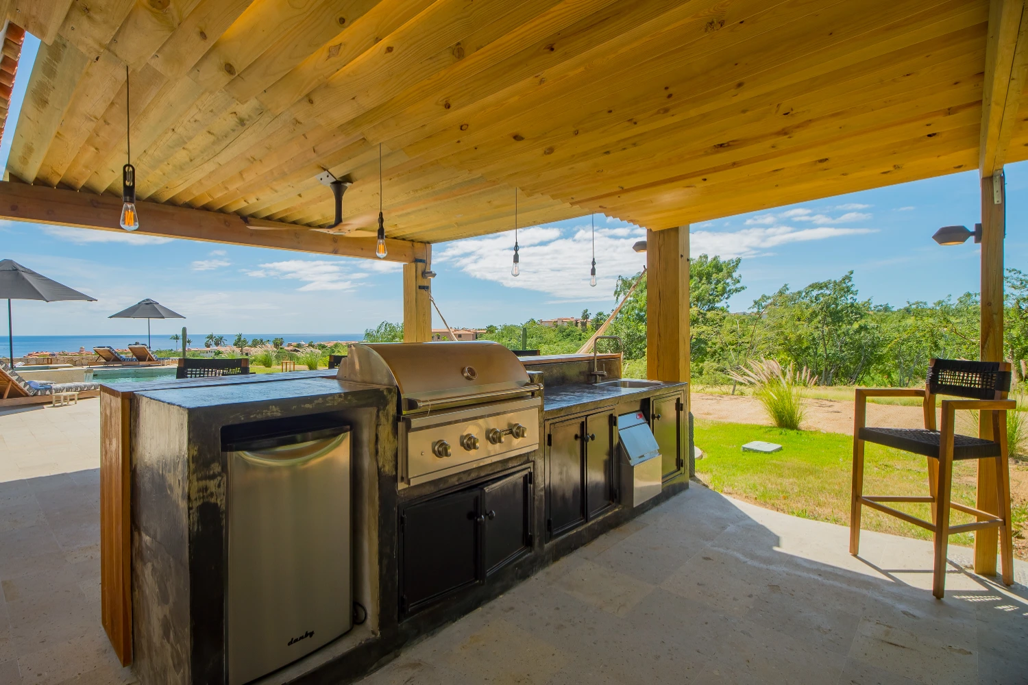 Guests can cook up delicious Mexican-inspired dishes at the outdoor kitchen and BBQ. Dine al fresco at the home’s outdoor dining table with space for up to 10 guests. The villa’s outdoor bar area and wine fridge rest beneath an attached pergola—the perfect spot for sipping an afternoon cocktail while breathing in the sweet ocean air. From the patio, take in gorgeous views of the surrounding golf course greens and the azure blue Sea of Cortez. To take in more of the beauty encompassing Naah Payil, consider booking a luxury yacht charter with EliteLyfe’s premium concierge services.