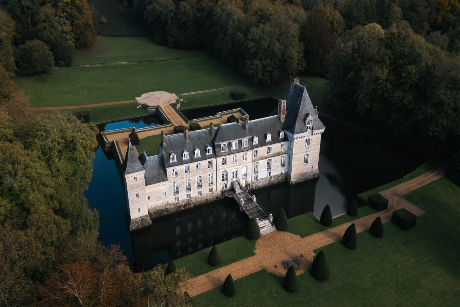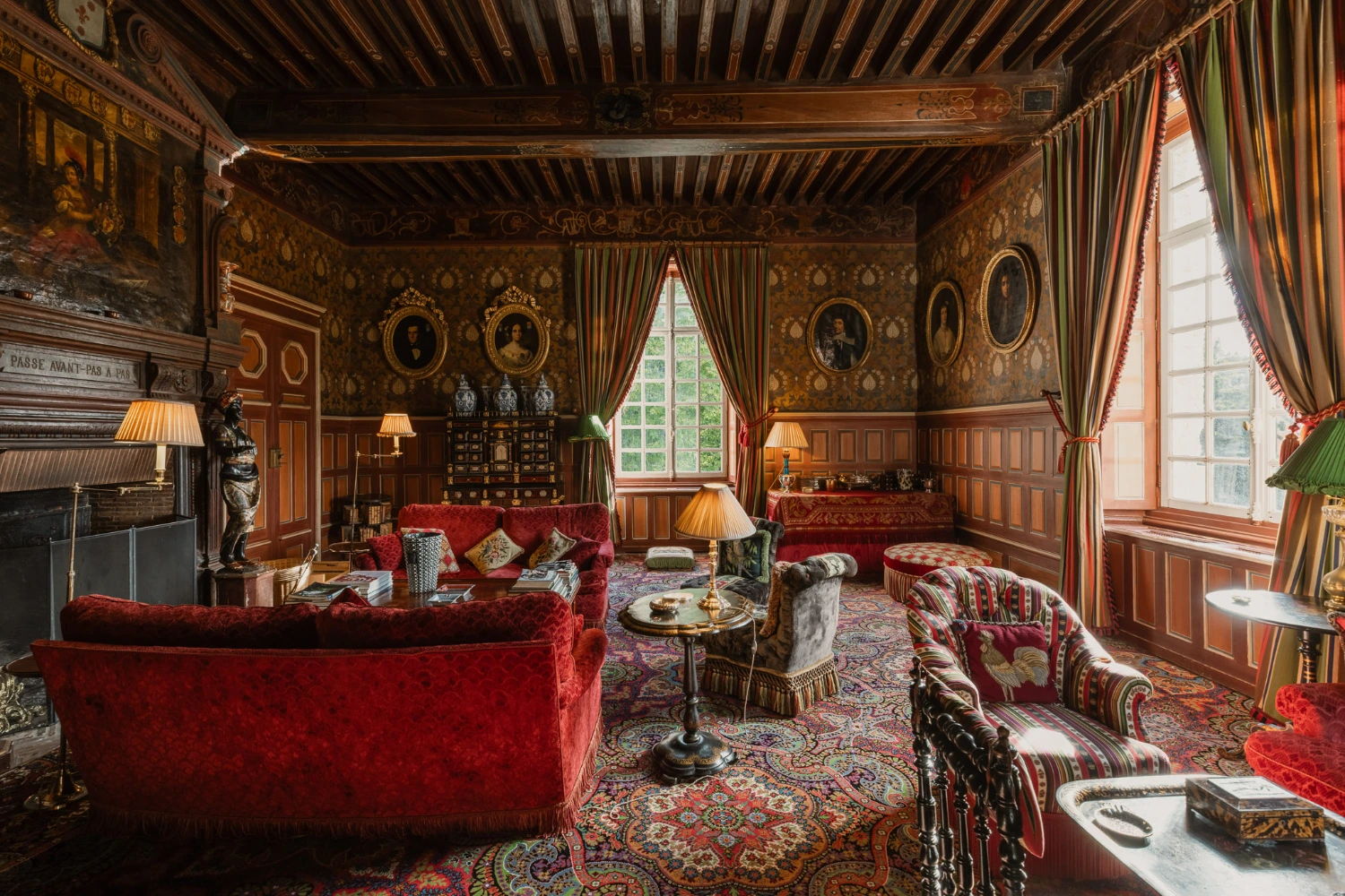 The secluded castle is set within a vast park with centuries-old avenues, sprawling lawns, and endless forests. The site was once home to a manor house that belonged to the Dukes of Normandy and hosted guests such as William the Conqueror, Henry I, Henry II, Richard the Lionhearted, and John Lackland. Inside the 11,840 SqFt property, guests can expect all the splendours of a great feudal residence as well as all the modern comforts. Highlights of the castle include a charming lobby room, a large country kitchen, a dining room for twenty-two, a sophisticated red lounge with a fireplace, an impressive library, a bar, an office, a games room, and a cinema room.