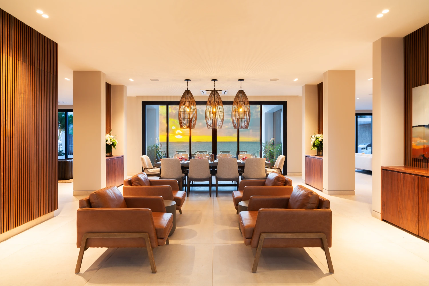 Modern architectural details combine with traditional Caribbean interiors to create a luxurious vacation property at Solara. The villa’s open-concept design encourages easy movement from room to room. The living room with a TV is the ideal gathering space throughout the day. Set the perfect mood with your favorite playlist on the Sonos sound system.