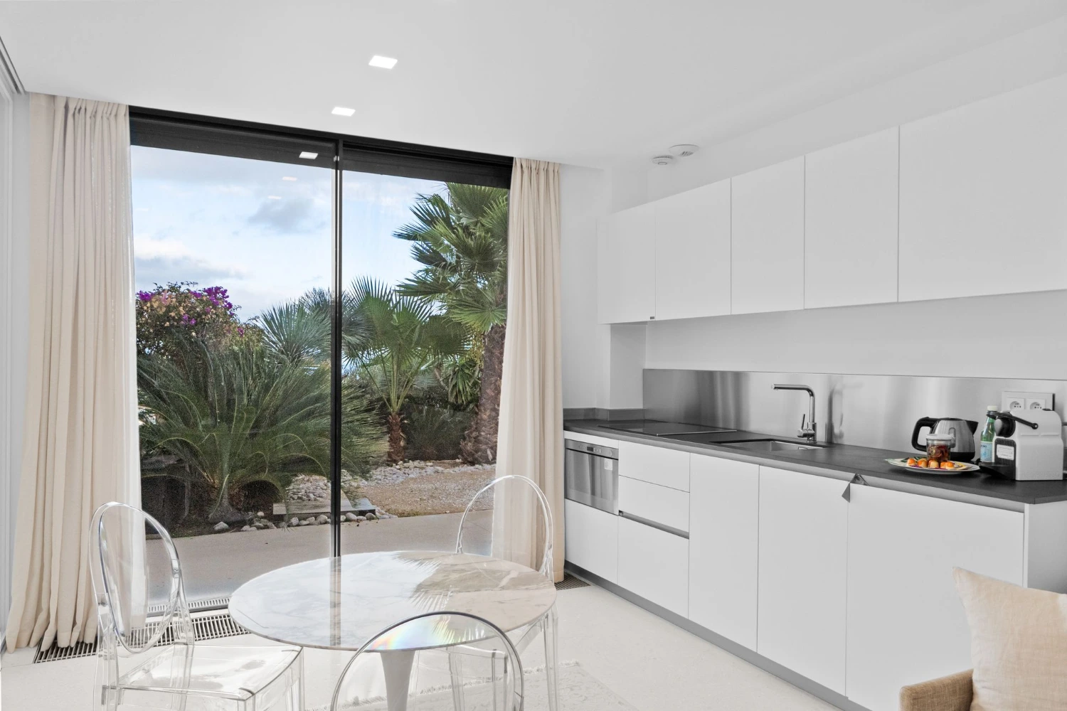 Minimalist architectural elements lend this villa a modern, sophisticated look and feel. With floor-to-ceiling windows, a large, flat-screen TV, and a Sonos sound system, the living room is the ideal gathering space. Terrazzo floors keep this area temperate throughout the year. From here, guests can take in panoramic sea views and access the pool and terrace with ease. Rest in the shade at the furnished terrace surrounded by a manicured green lawn. Slip into the infinity pool for an invigorating swim or recline poolside on comfortable sun loungers. The villa’s gym ensures you’ll never miss a daily workout.