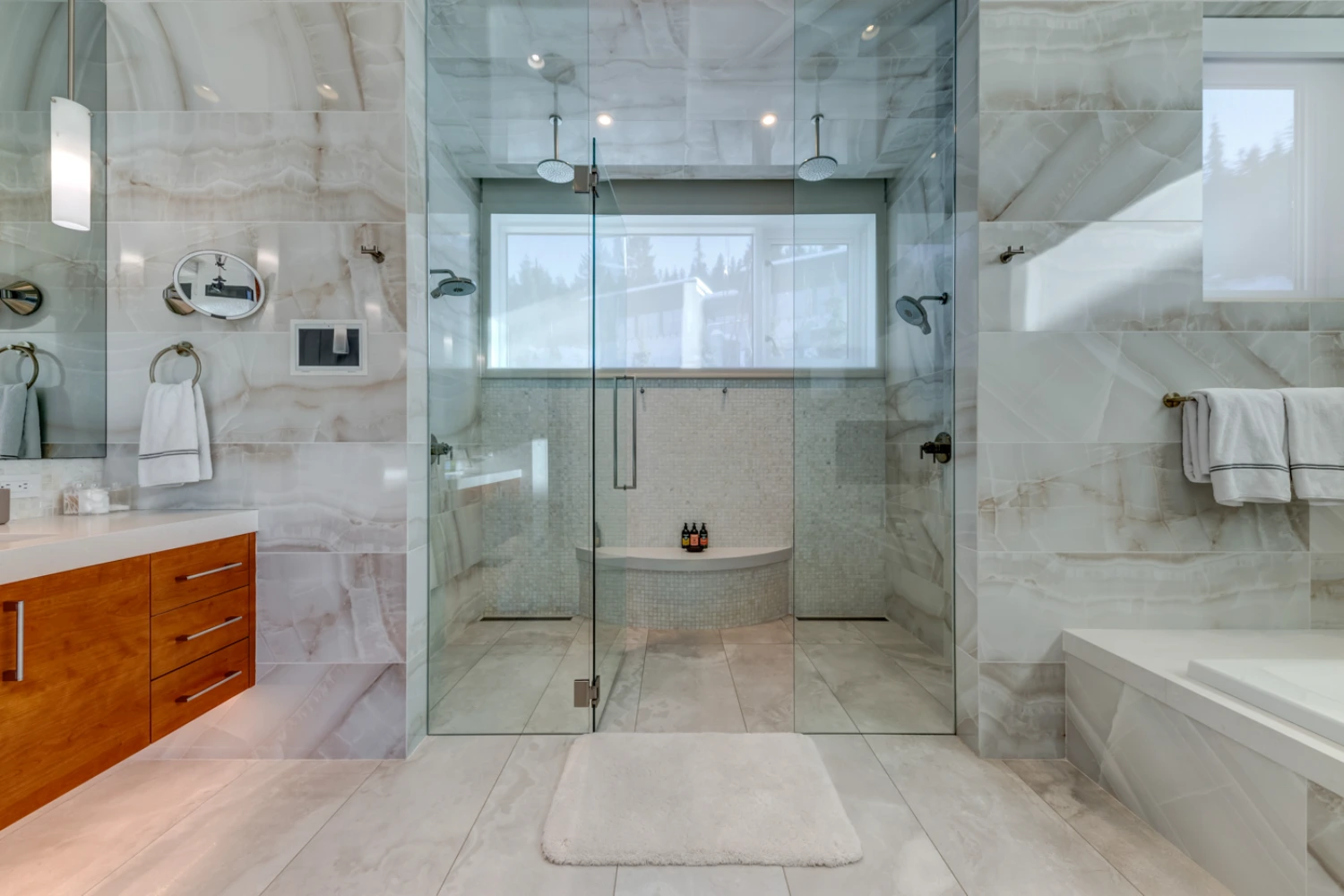 High-end features throughout the home include automated blinds and lighting, a heated driveway with space for up to three vehicles, a finished two-car garage, sound systems in all rooms, and heated floors.