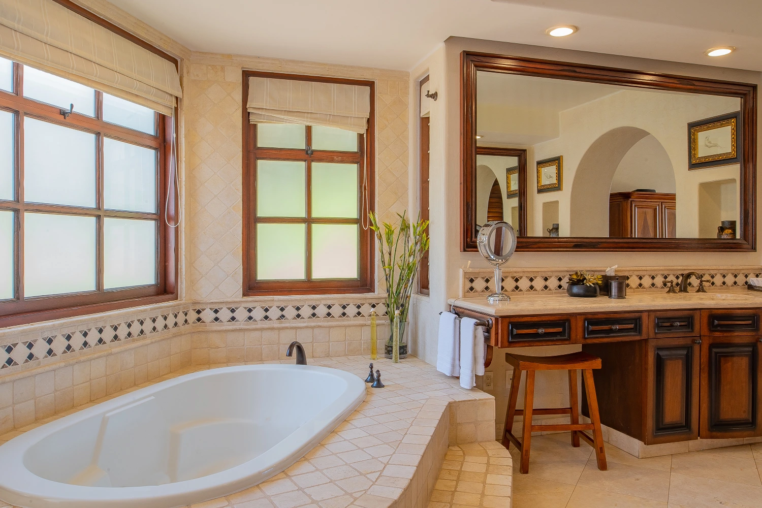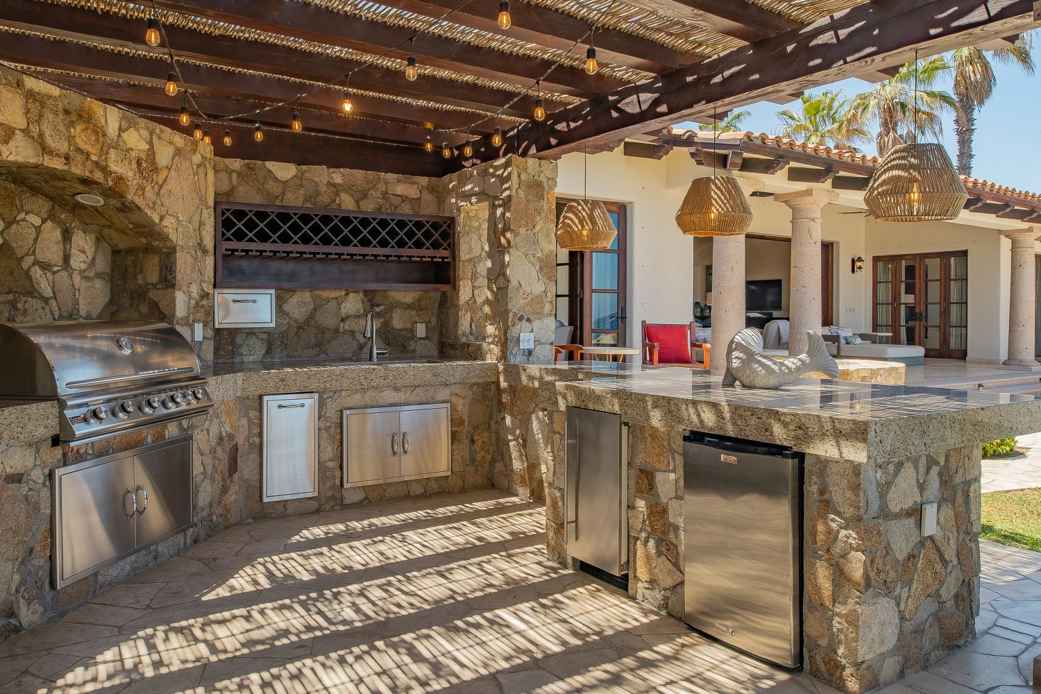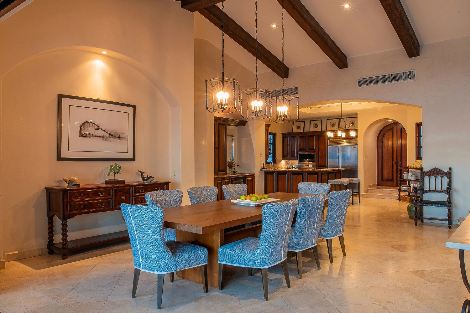 The villa’s fully equipped kitchen has a breakfast bar and a water purification system. Enjoy a continental breakfast every morning during your stay. The outdoor covered bar area has a wine cooler and a BBQ ideal for cooking up delicious Mexican dishes or international fare. Whether or not you enlist the help of a private chef, dine al fresco with other guests at the exterior dining area.
