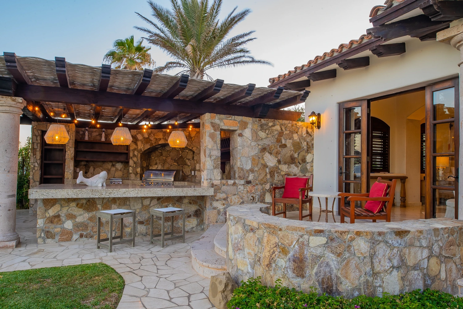 Experience the privacy of an island retreat combined with the luxurious amenities of a resort at Villa Las Arenas located in the vibrant Punta Bella Community of villas in Cabo San Lucas. Boasting a stone courtyard with a fountain and lounge chairs, a palapa, and an adobe-inspired exterior, this one-story villa is a beautiful example of modern Mexican architecture.