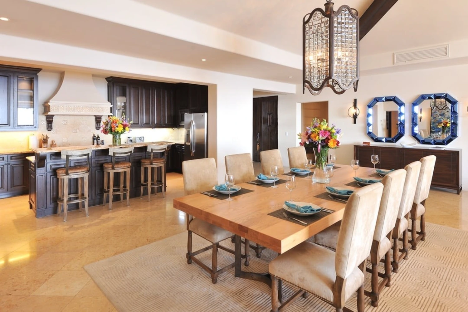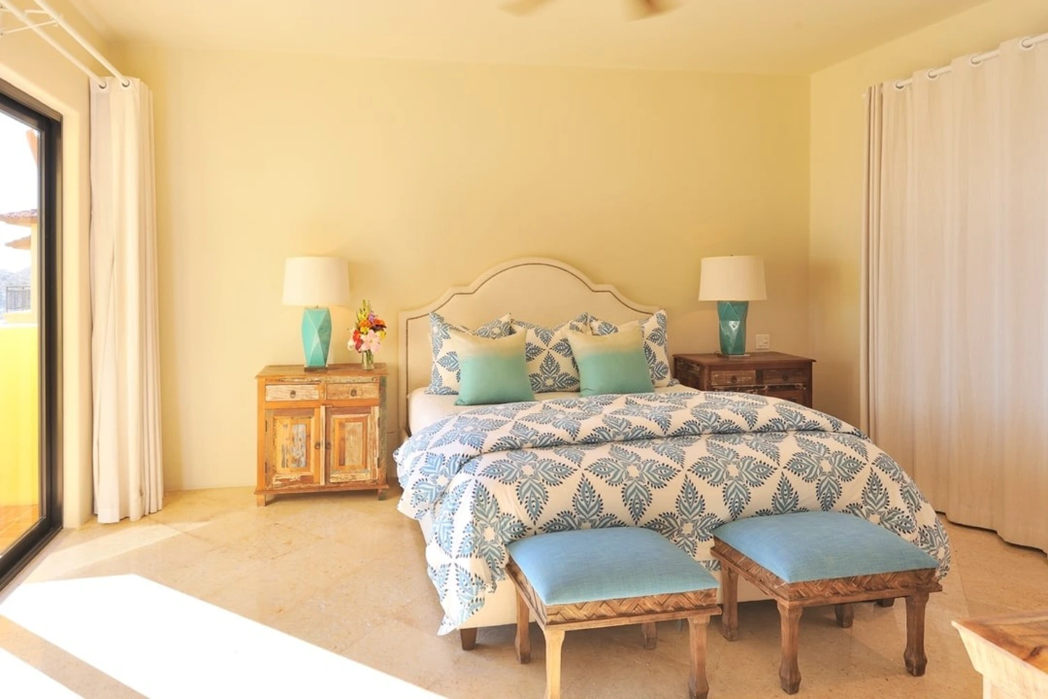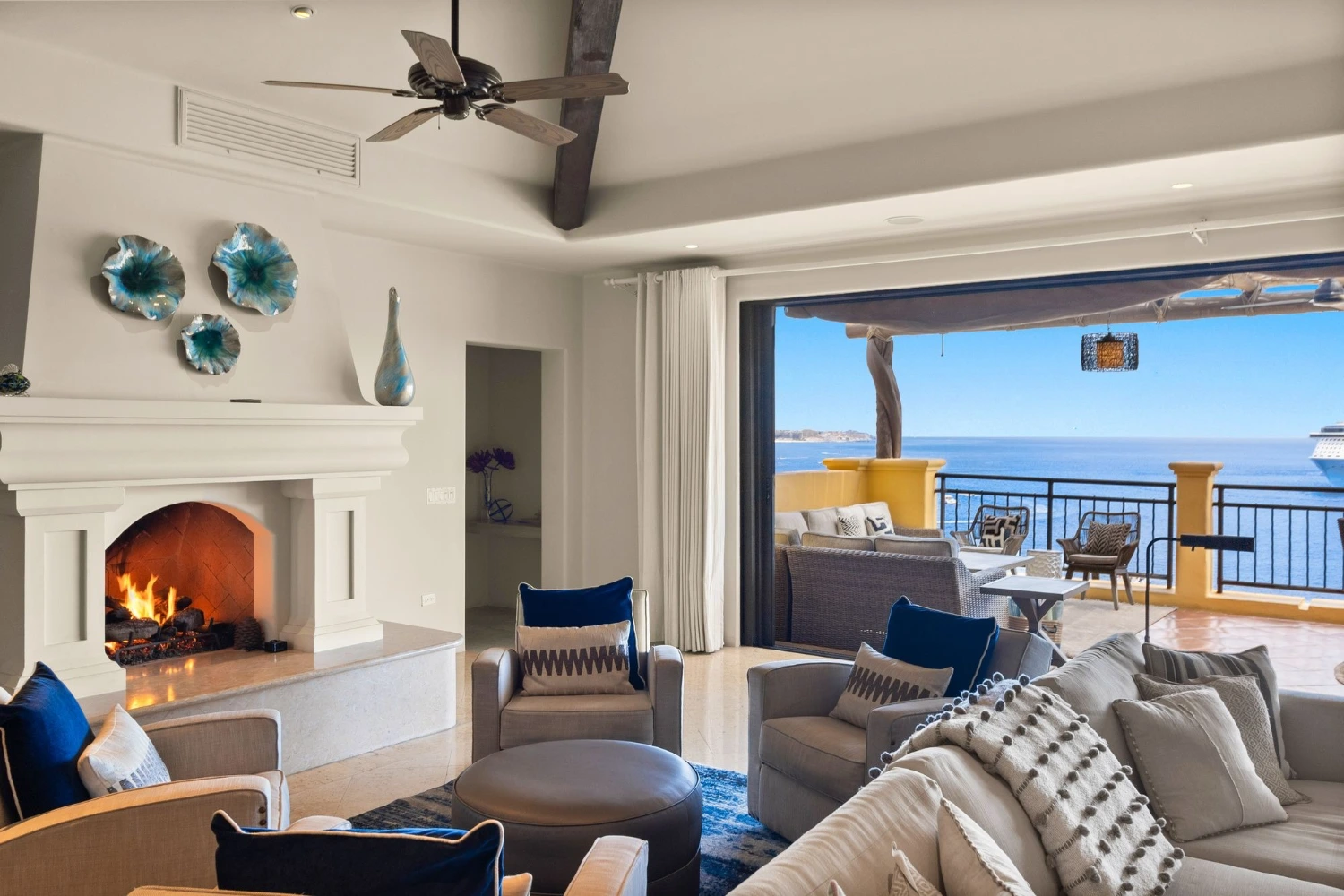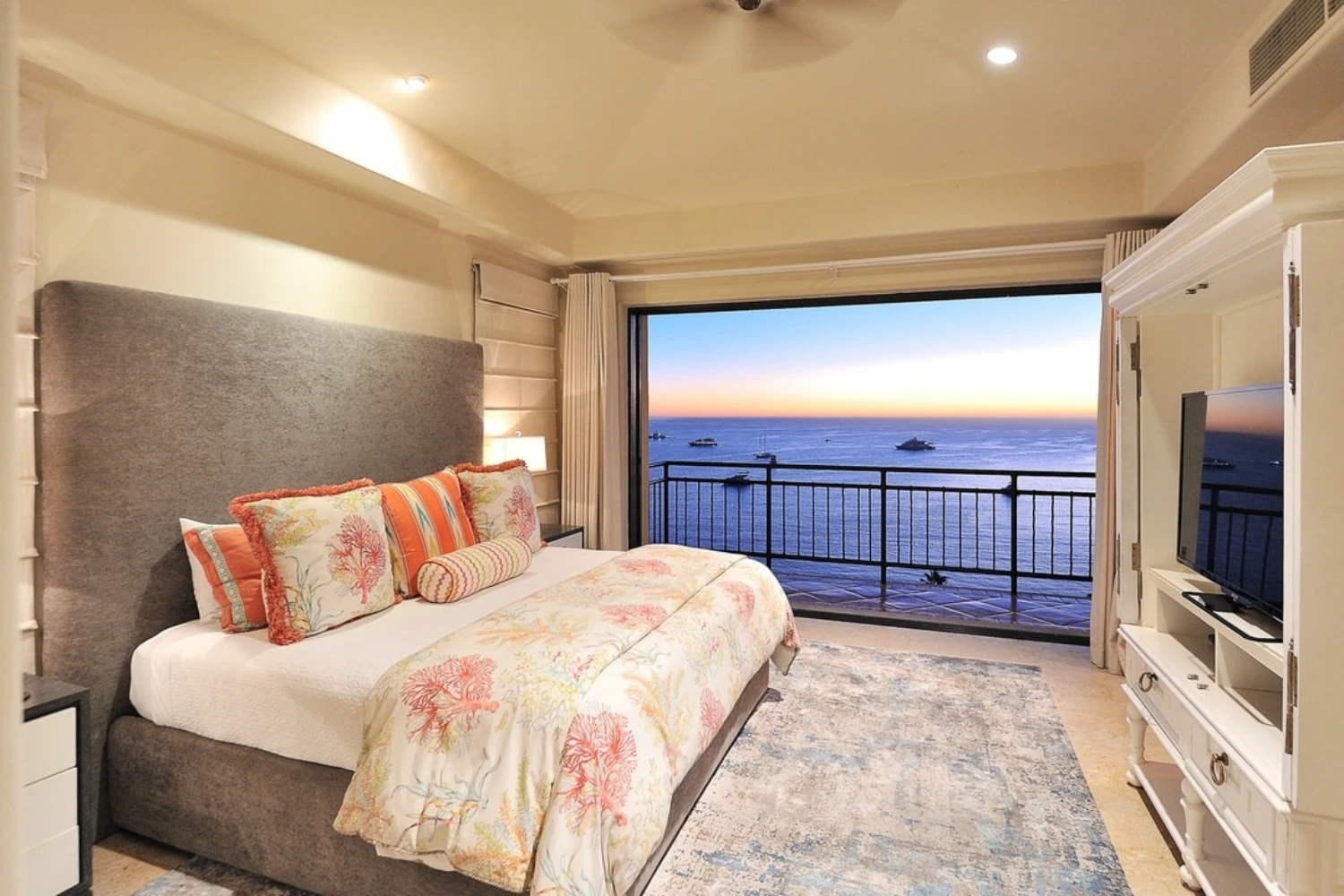 The 4 spacious bedrooms at this ocean view villa rental in Los Cabos are each complete with an en-suite bathroom and impressive ocean views. The 2 master bedrooms feature large en-suite bathrooms with jetted bathtubs and dual vanities. This stately property is located in Hacienda, a private 22-acre gated community with a gym, yoga classes, and spa.