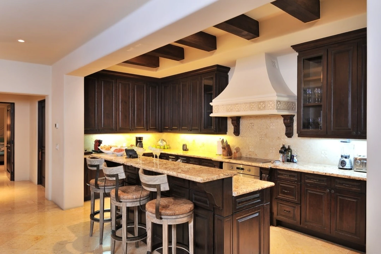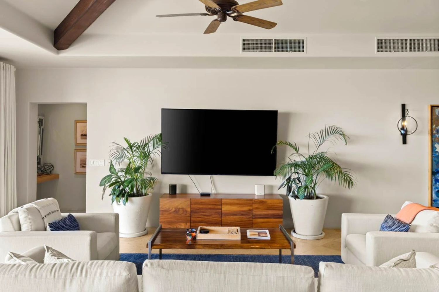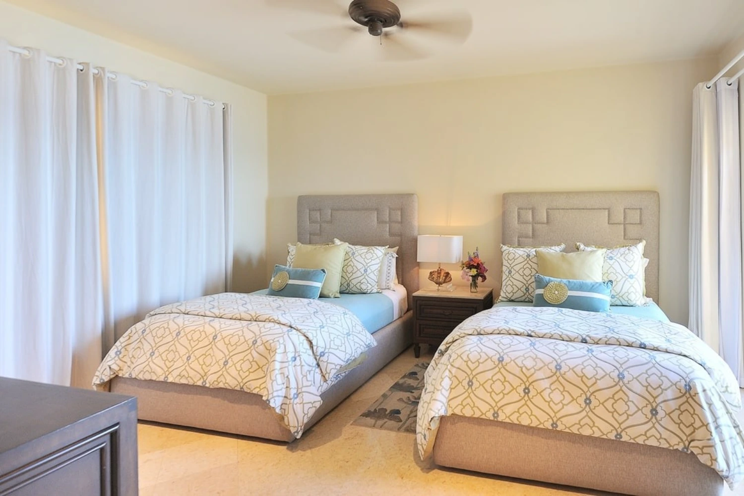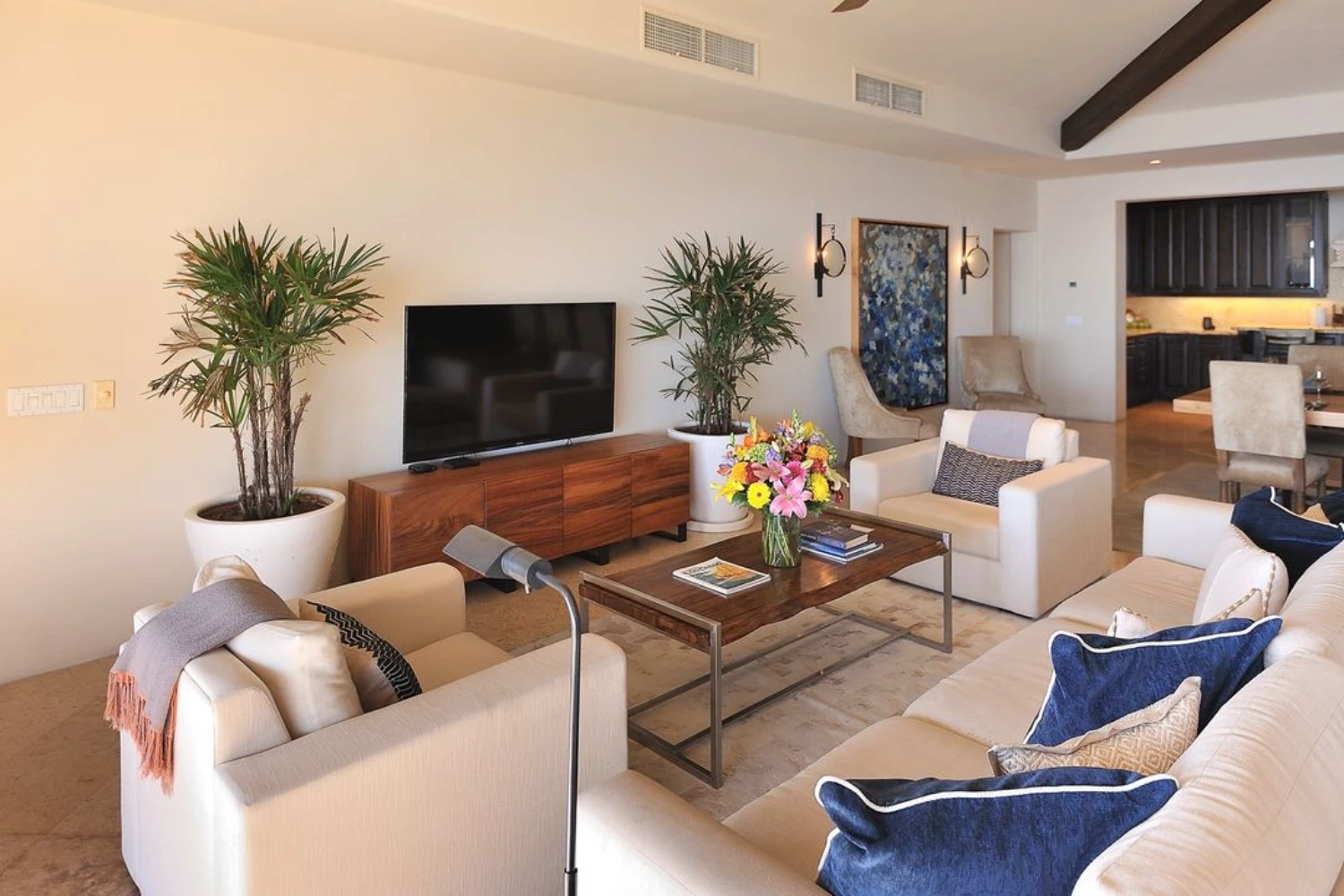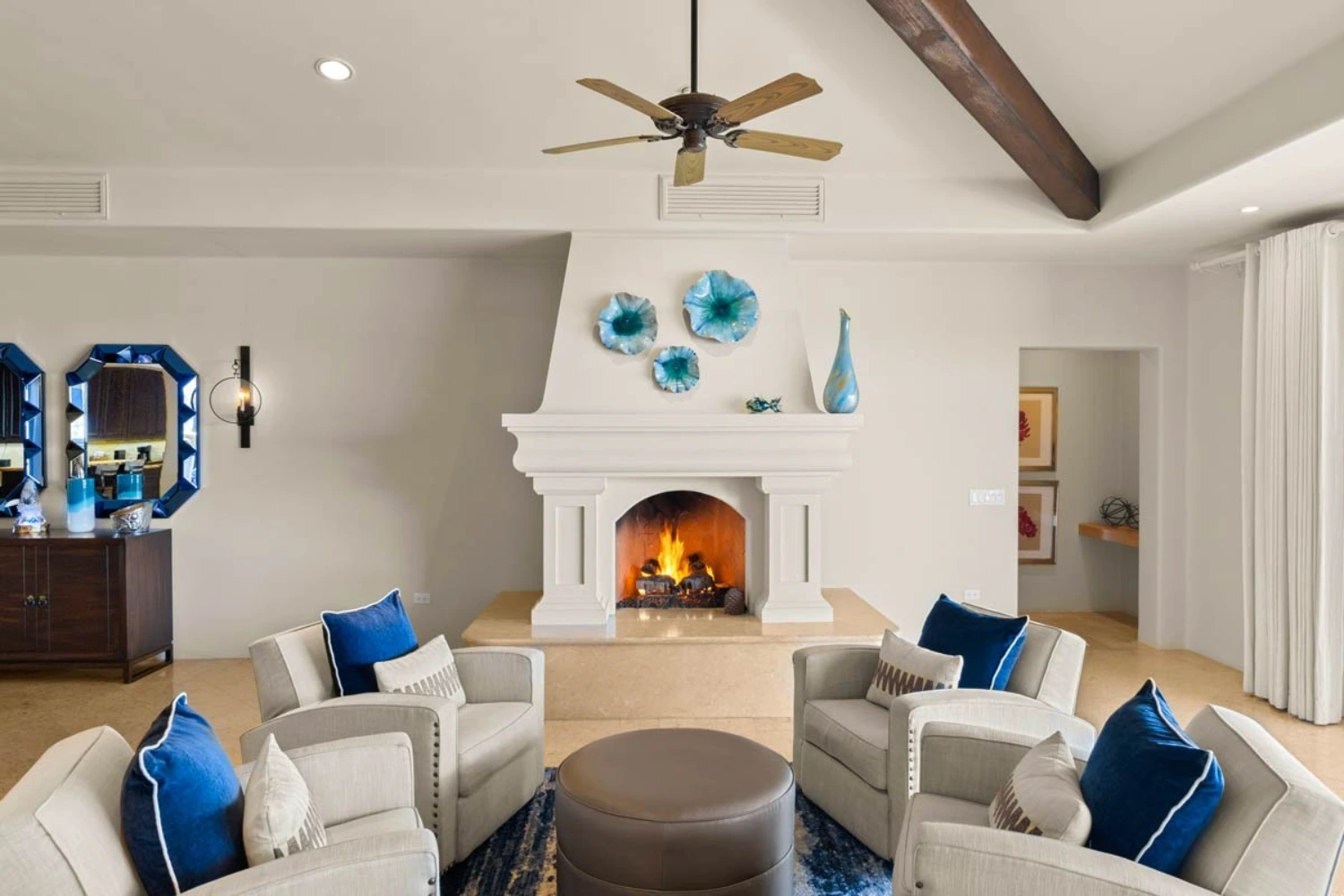 The 4 spacious bedrooms at this ocean view villa rental in Los Cabos are each complete with an en-suite bathroom and impressive ocean views. The 2 master bedrooms feature large en-suite bathrooms with jetted bathtubs and dual vanities. This stately property is located in Hacienda, a private 22-acre gated community with a gym, yoga classes, and spa.