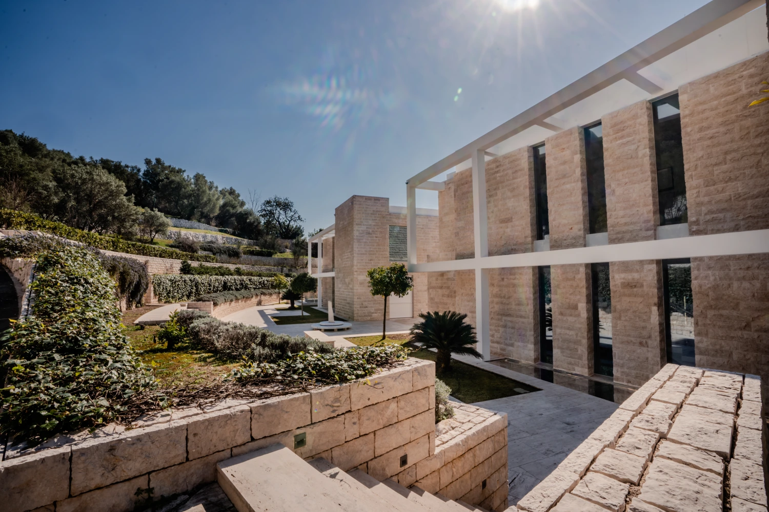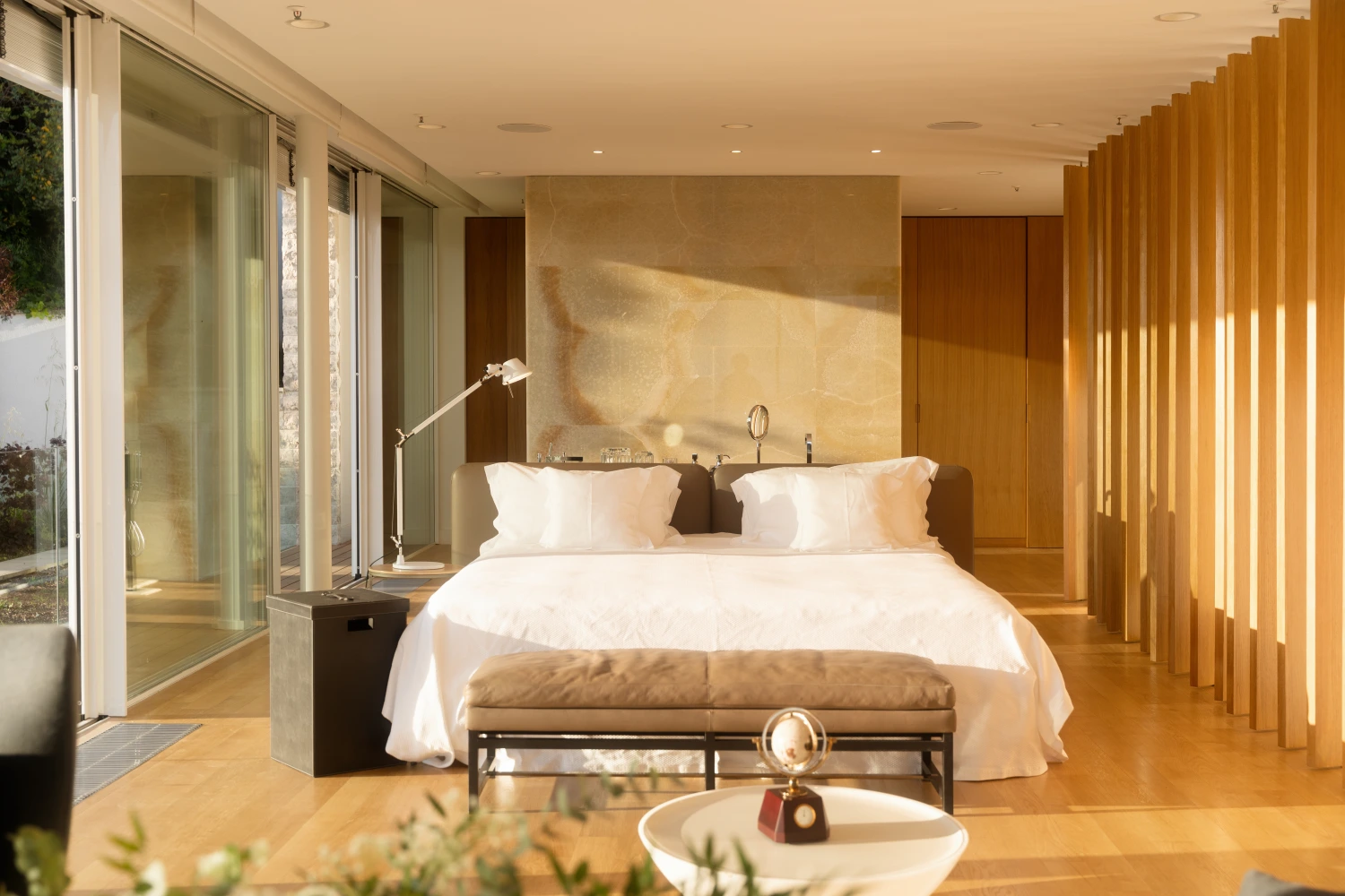 The estate comprises four idyllic villas: a hilltop villa, a waterfront villa, and two adjacent modern villas. The estate features 9 bedrooms and 9 en-suite bathrooms, accommodating up to 18 guests. Each bedroom offers a king-size bed, a balcony, a TV, and sea views, while each bathroom boasts a tub and a rain shower. Daily housekeeping is provided at the estate, and an elevator in each villa ensures that guests with limited mobility can easily navigate the property.