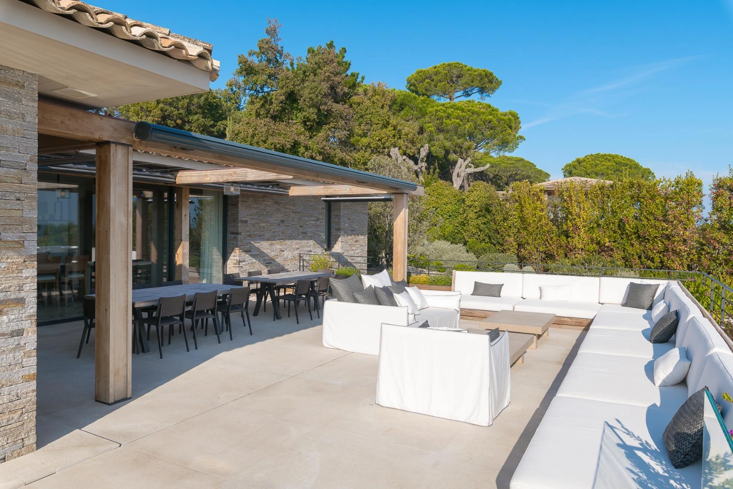The fully equipped kitchen has a large central island opening onto one of two expansive terraces connected by a glass bridge. Enjoy al fresco meals on this furnished terrace featuring a dining table seating up to 20 guests. Personal chef services are provided.