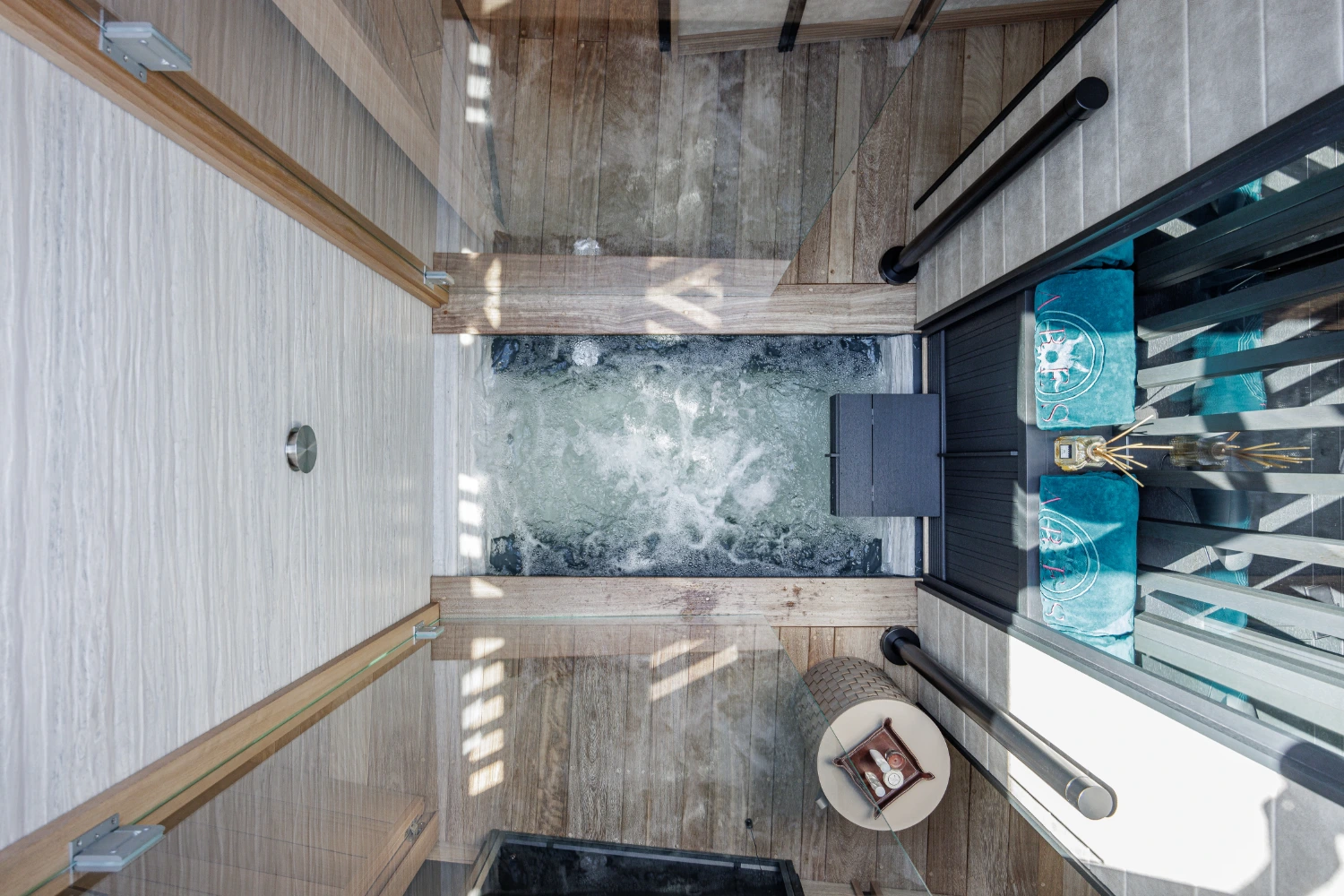 Go for a swim in Villa Aaliyah’s heated saltwater pool. Relax in the hot freshwater whirlpool tub, expertly carved into rocks. Enjoy direct sea access from this idyllic villa.
