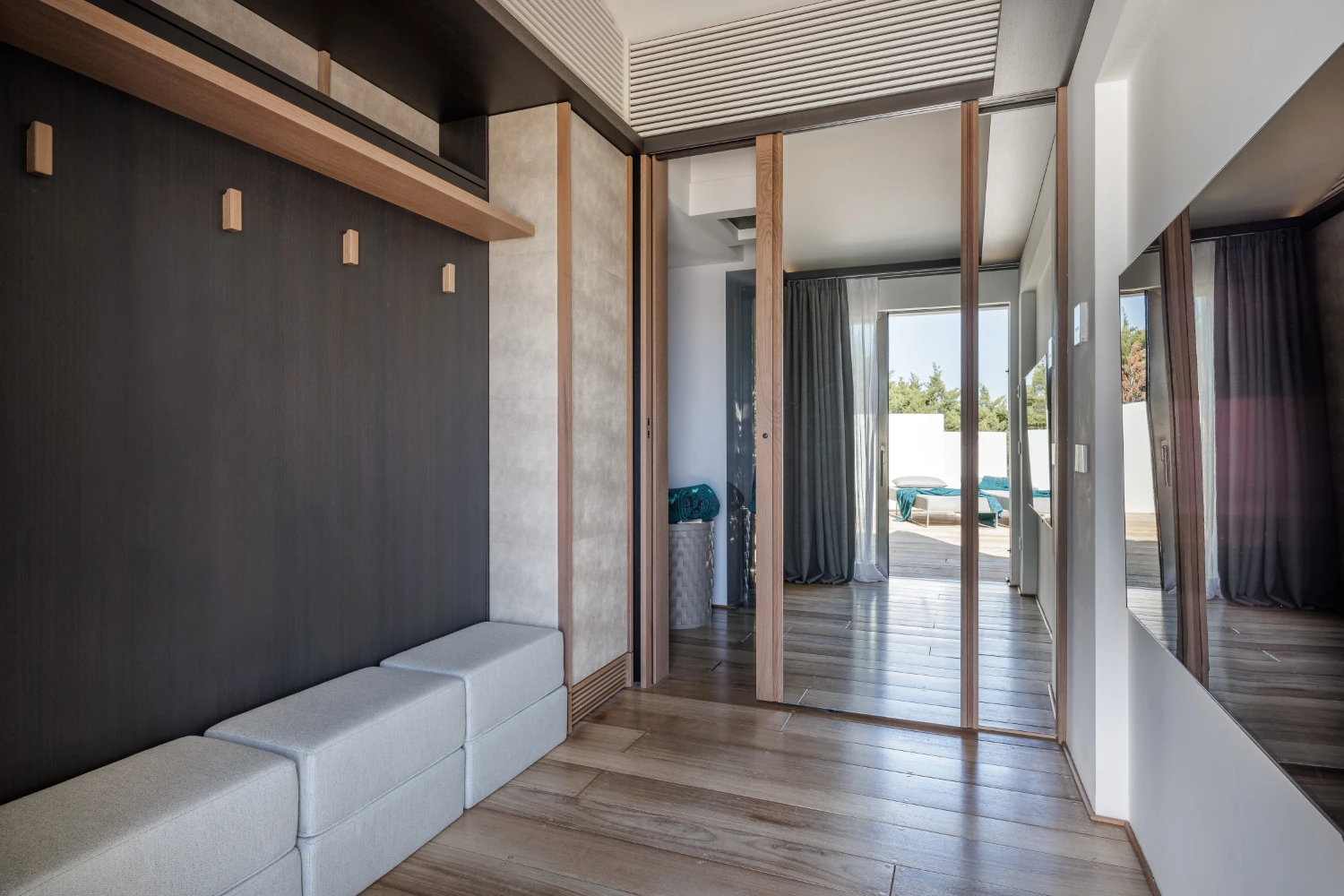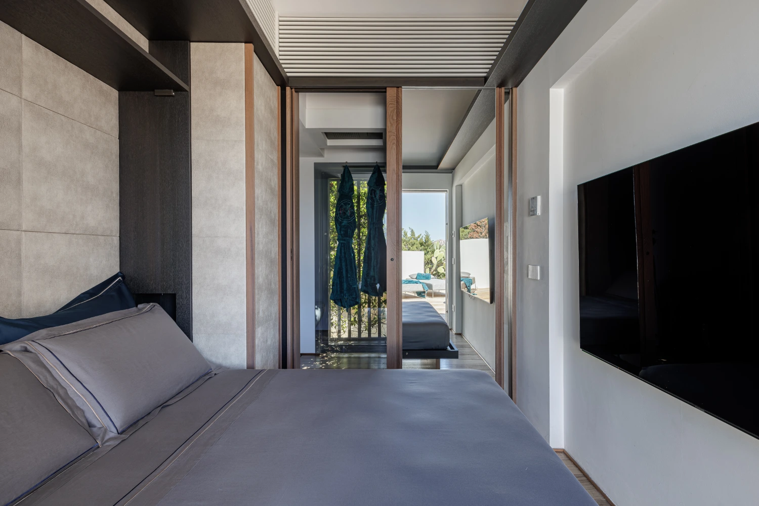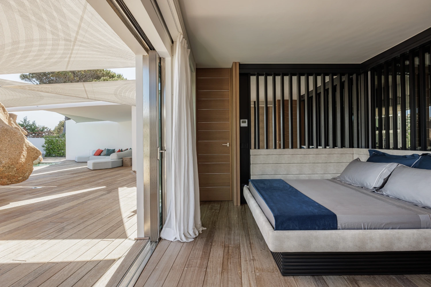 Electric sliding glass doors off the main living space allow for seamless movement from furnished indoor areas to covered outdoor spaces. Take in breathtaking views of the beach along with the picturesque Porto Rafael square from the wooden deck, a perfect spot for a morning yoga session.