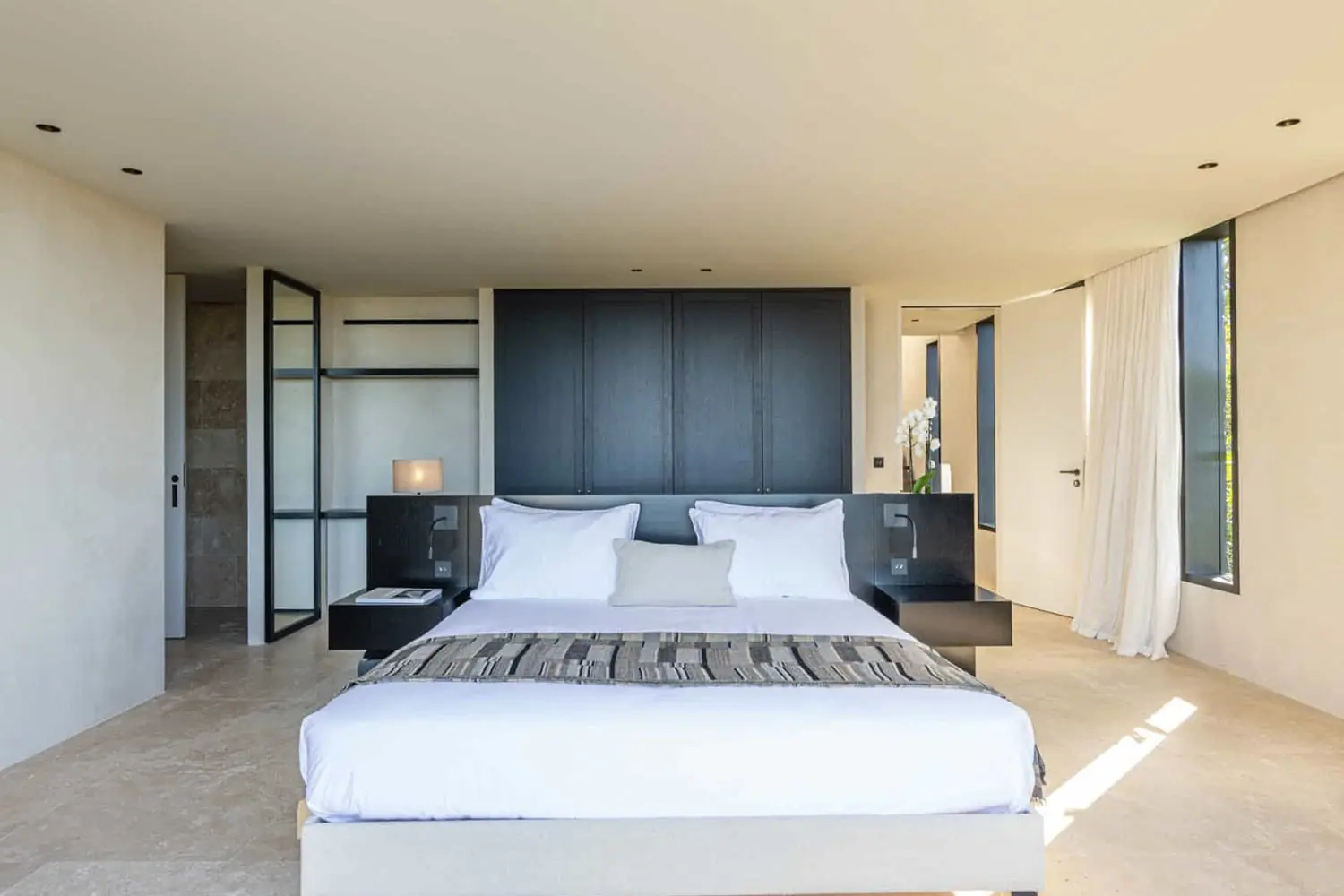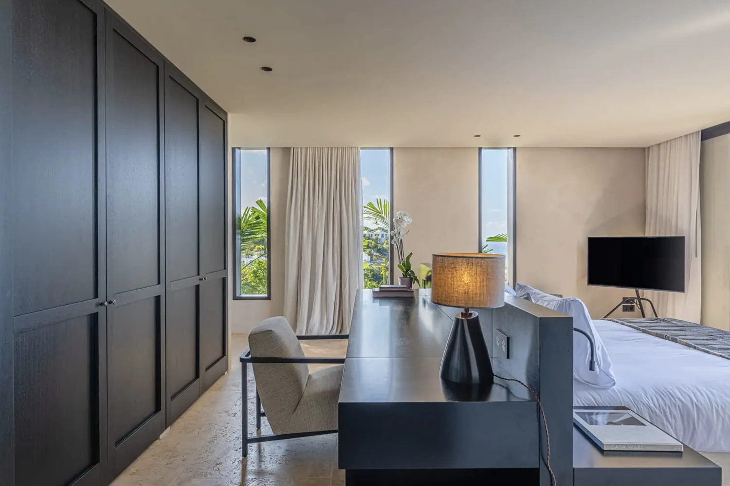 Never Say Never features 4 bedrooms and 4 en-suite bathrooms, accommodating up to 8 guests. Each bedroom features lots of windows and a Smart TV, making for bright rooms perfect for cozying up for a fun movie night. Two bedrooms are located on the upper floor, one featuring a work desk, and a large mirror. On the lower level of the villa lies a bedroom with a private terrace and a work desk. The fourth bedroom is found on the main level, along with the main living space, and opens onto the terrace and pool area. Daily maid service is provided at the villa.