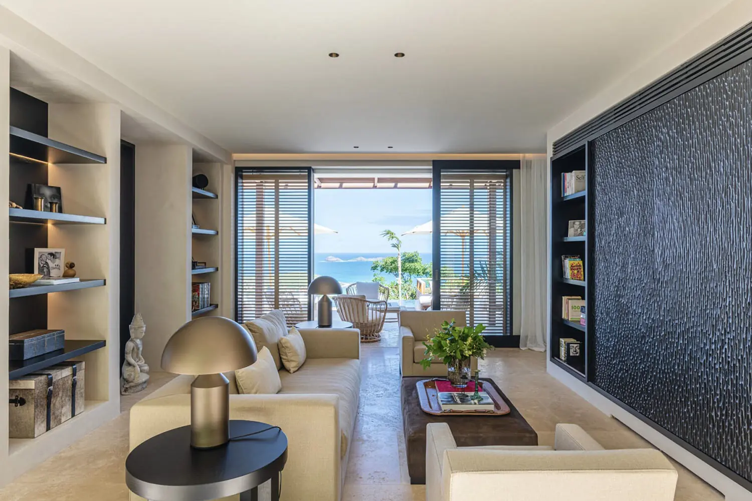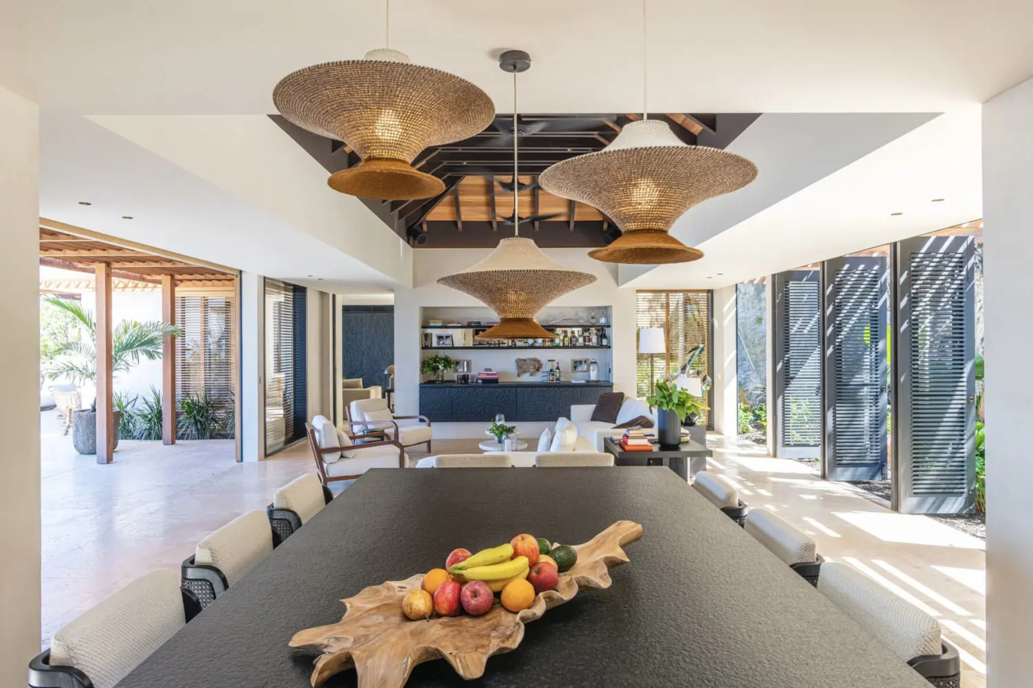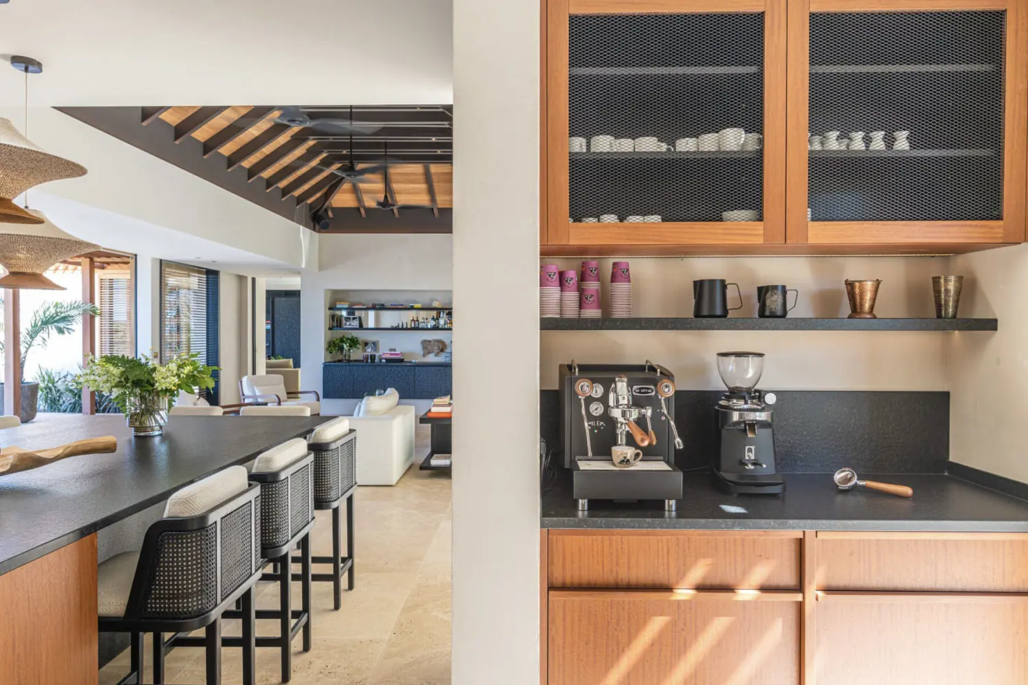 The fully equipped kitchen boasts an espresso machine and a large breakfast bar beneath modern pendant lights. The kitchen opens onto the living room, furnished with built-in bookshelves, a sofa, armchairs, a chaise longue, and elegant louver doors opening on both sides to let Caribbean breezes waft through the room. A built-in bar opposite the kitchen invites guests to indulge in a cold beverage any time of day.