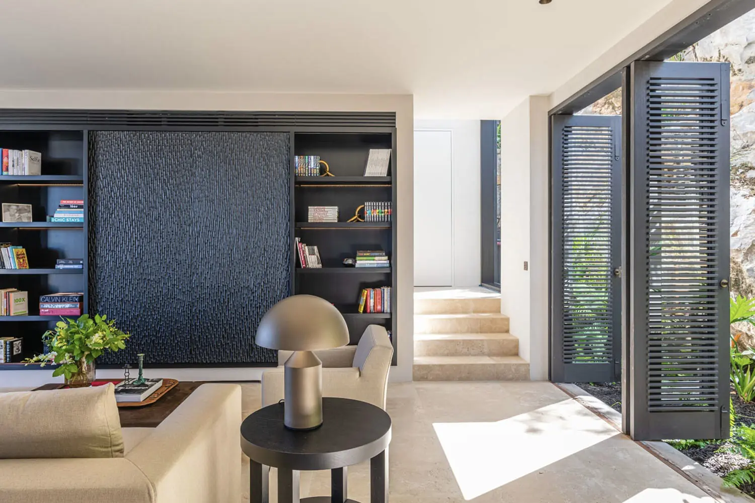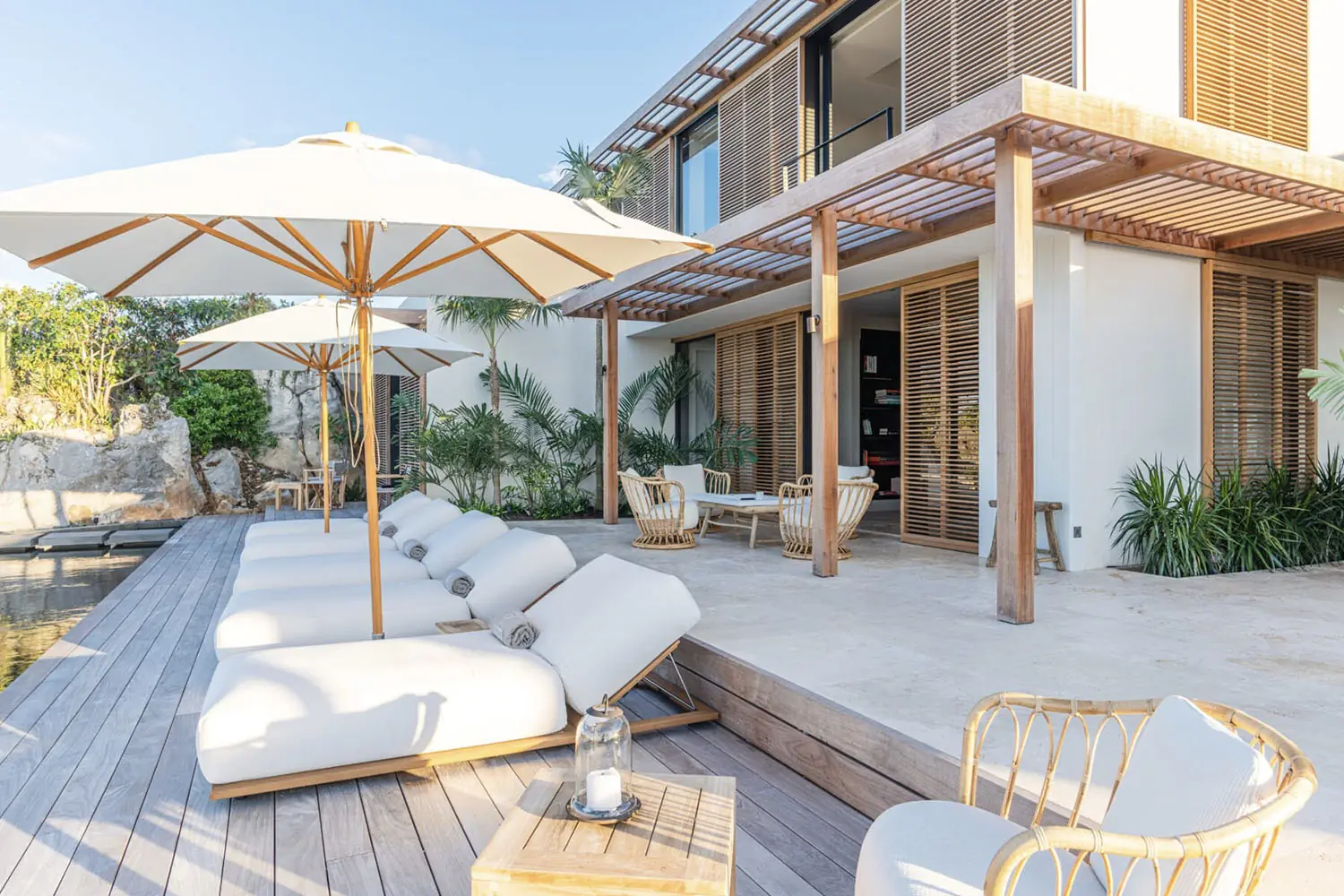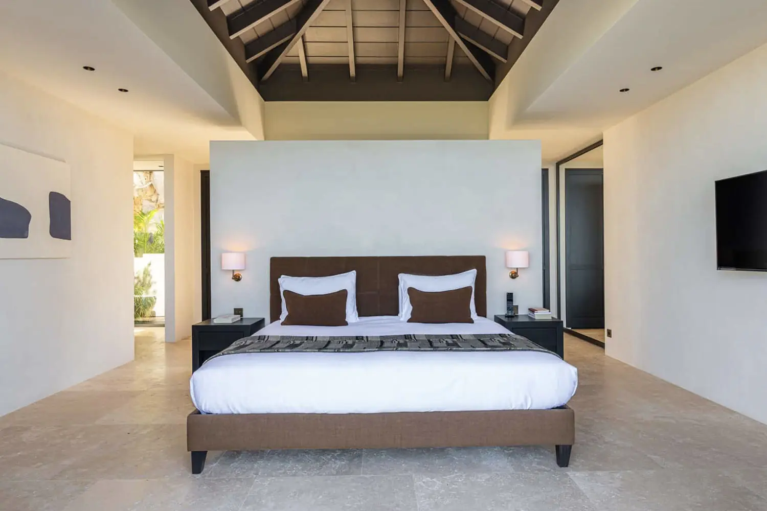 The fully equipped kitchen boasts an espresso machine and a large breakfast bar beneath modern pendant lights. The kitchen opens onto the living room, furnished with built-in bookshelves, a sofa, armchairs, a chaise longue, and elegant louver doors opening on both sides to let Caribbean breezes waft through the room. A built-in bar opposite the kitchen invites guests to indulge in a cold beverage any time of day.