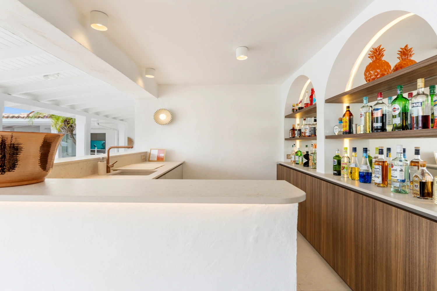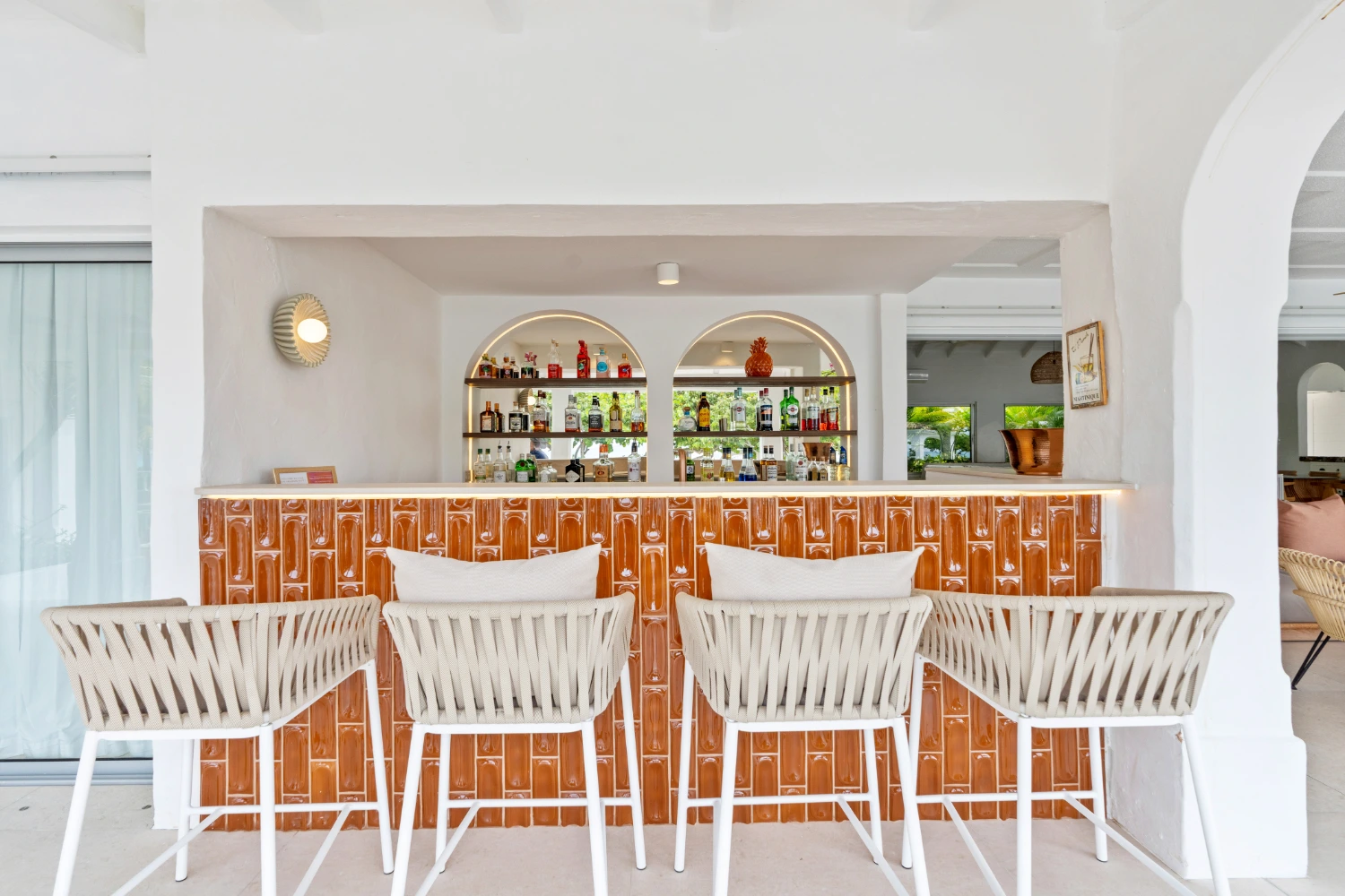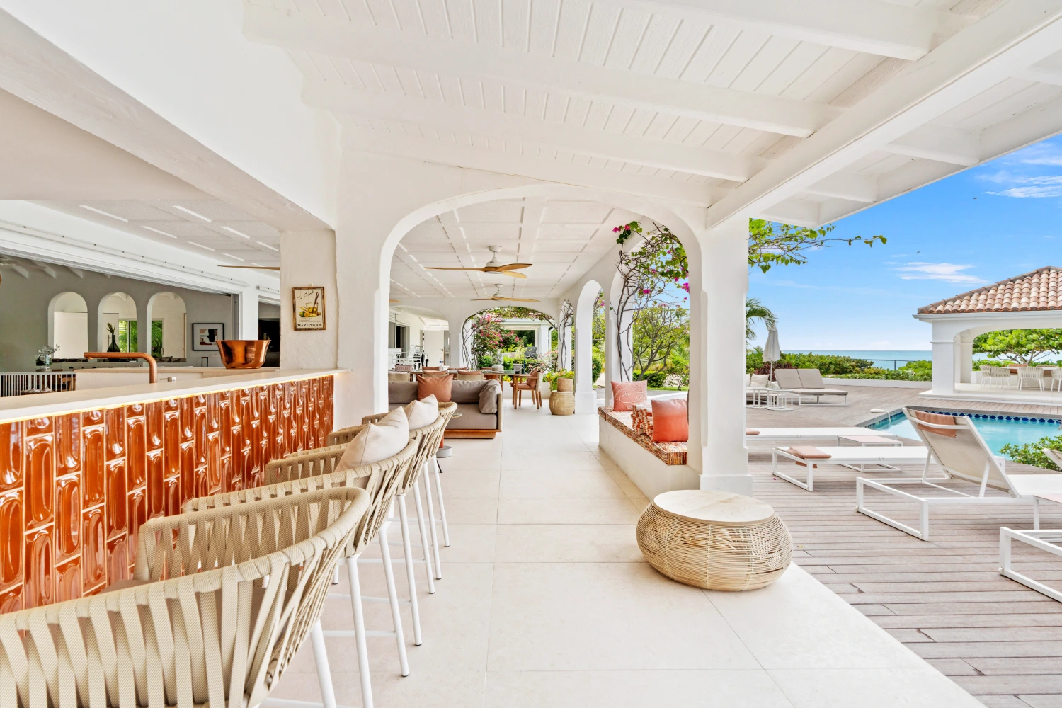 The gourmet kitchen has a large marble island and bar seating—the perfect place to have breakfast or sip a morning cup of coffee. From here, move through sliding glass doors to the outdoor terrace, where guests can dine al fresco or gather at the adjoining lounge area on another sectional sofa. Prepare fresh meats and veggies on the BBQ and enjoy them at a second outdoor dining area.