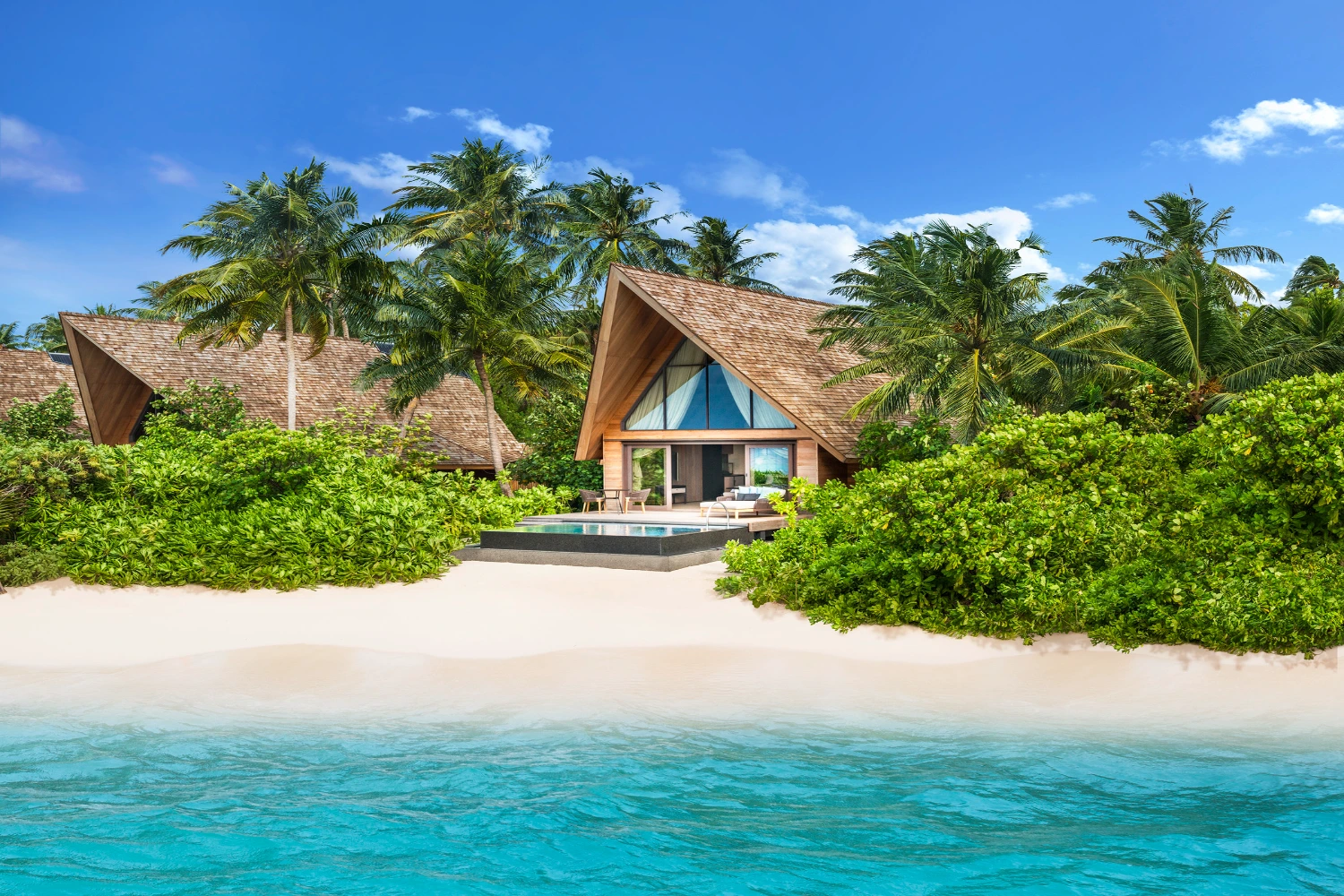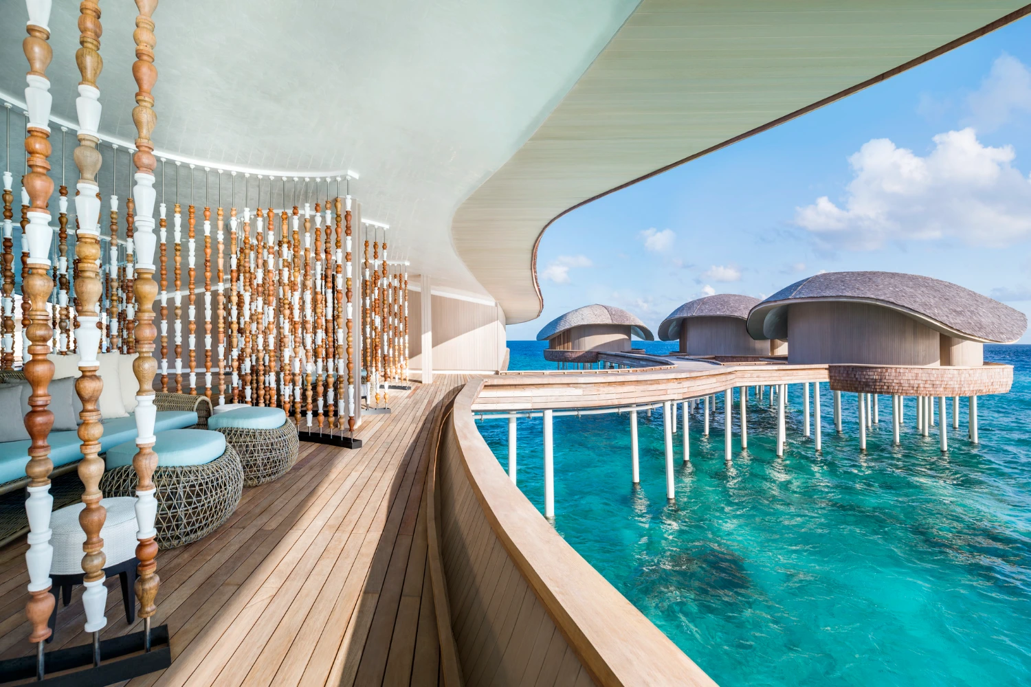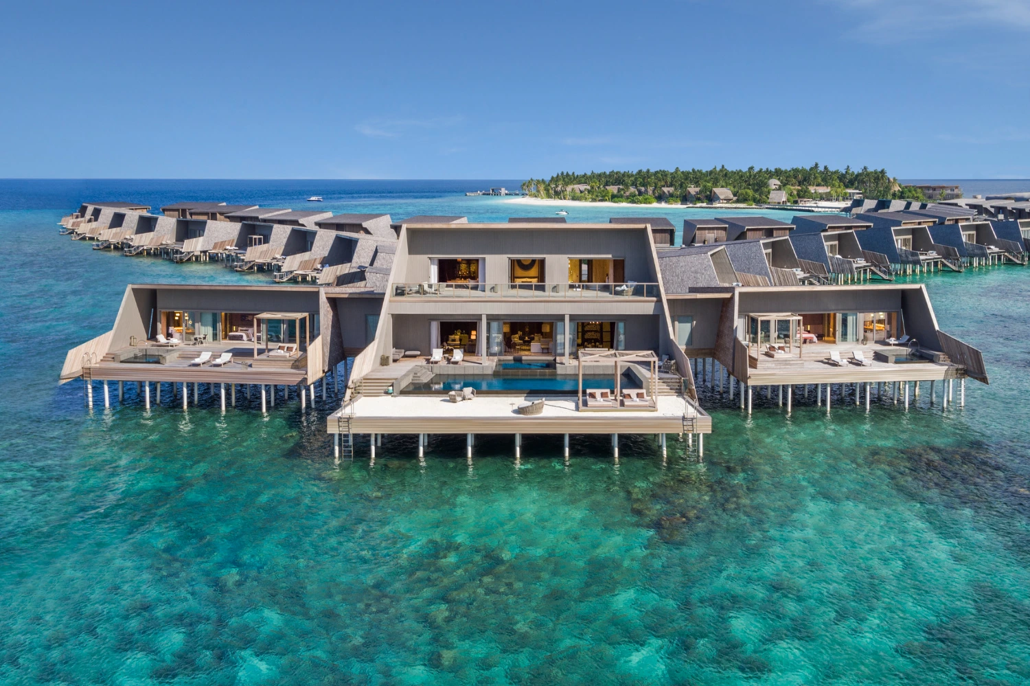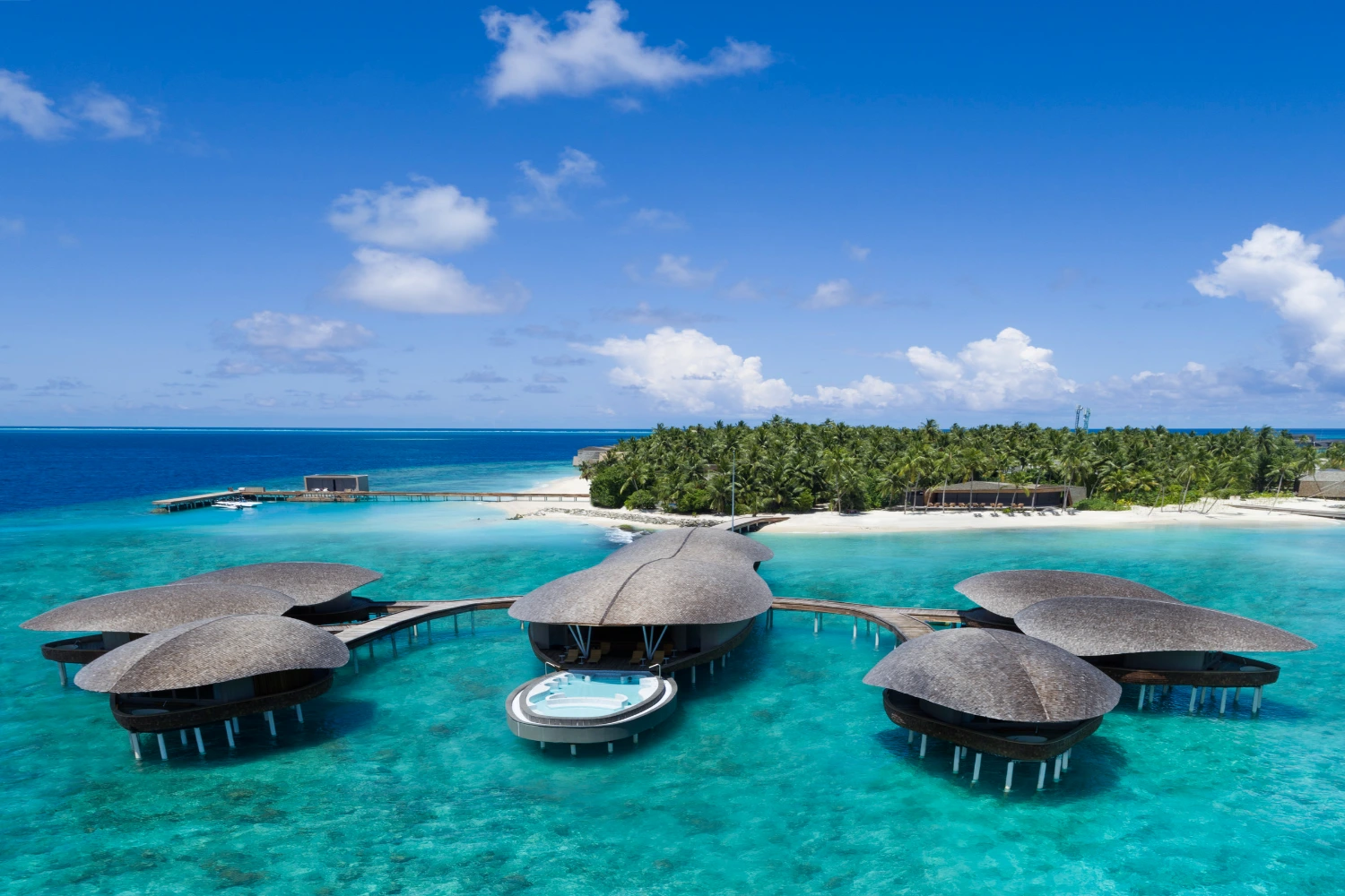 Nestled on a private island in the Dhaalu Atoll, The St. Regis Maldives Vommuli Resort is a triumph of contemporary architecture and eco-conscious luxury. Spread across nine hectares of lush tropical flora, the resort’s avant-garde design pays homage to the local marine life: its 77 exquisitely appointed villas resemble manta rays, the iconic Whale Bar takes the shape of a majestic whale shark, and the Iridium Spa is built in the likeness of a lobster.
