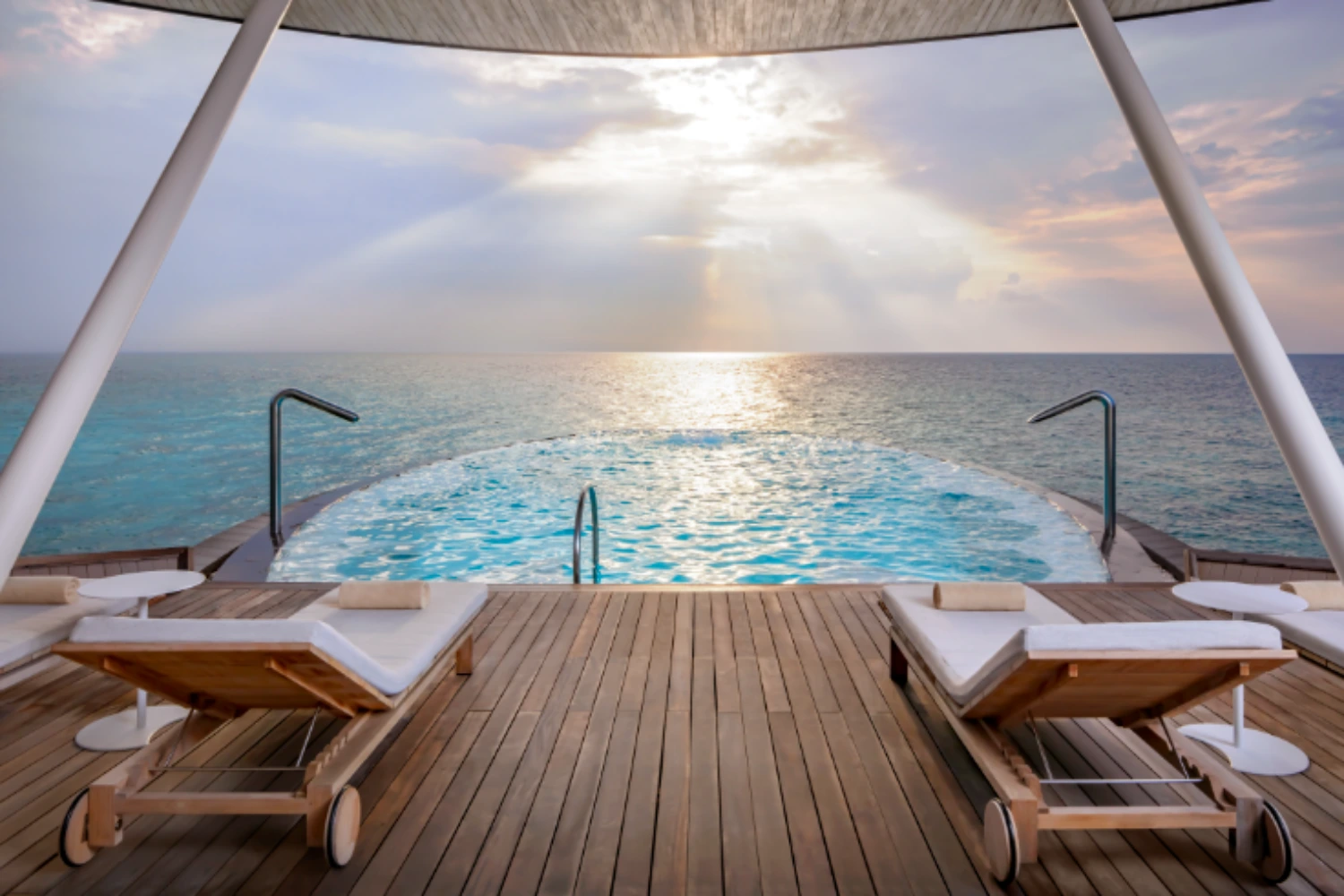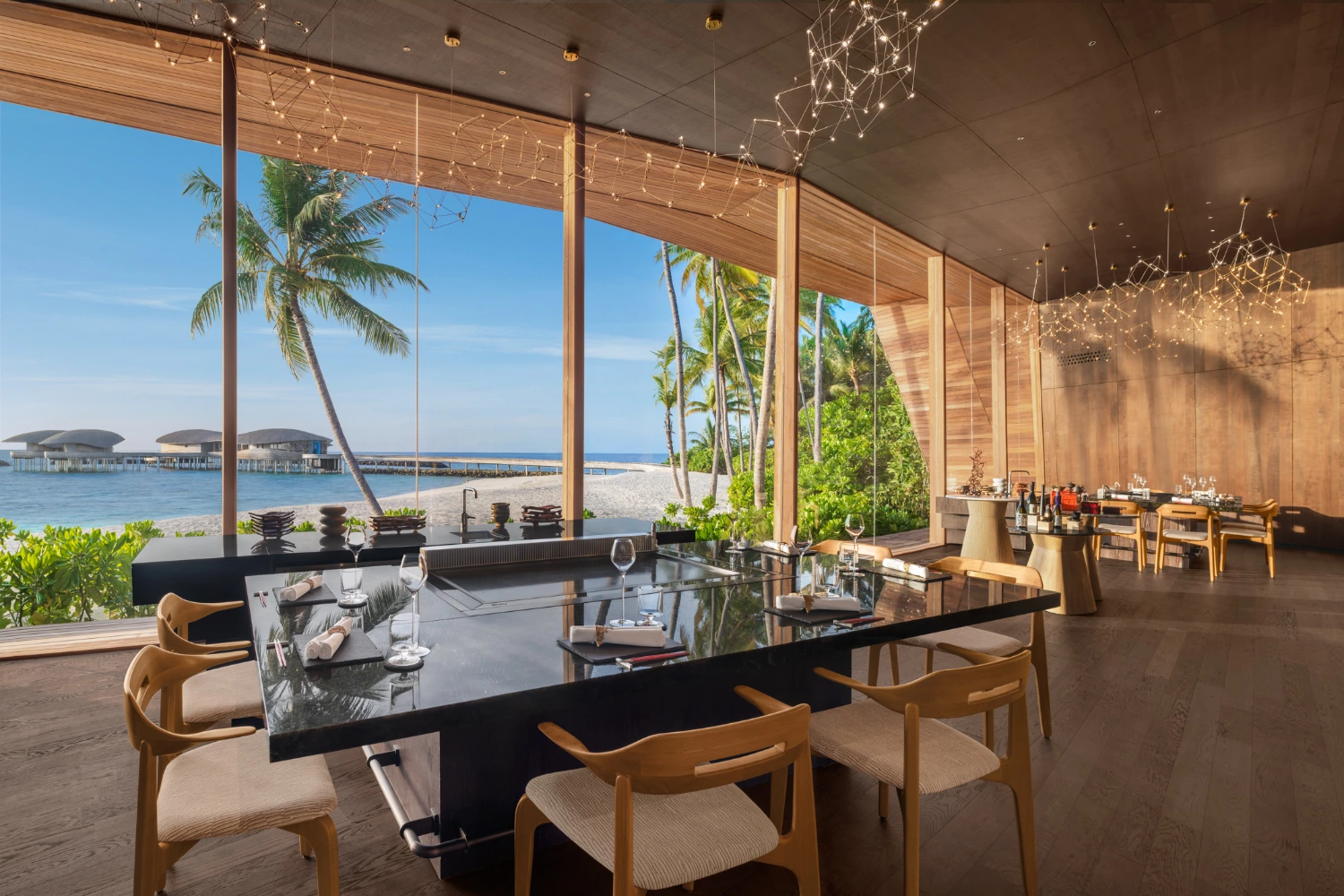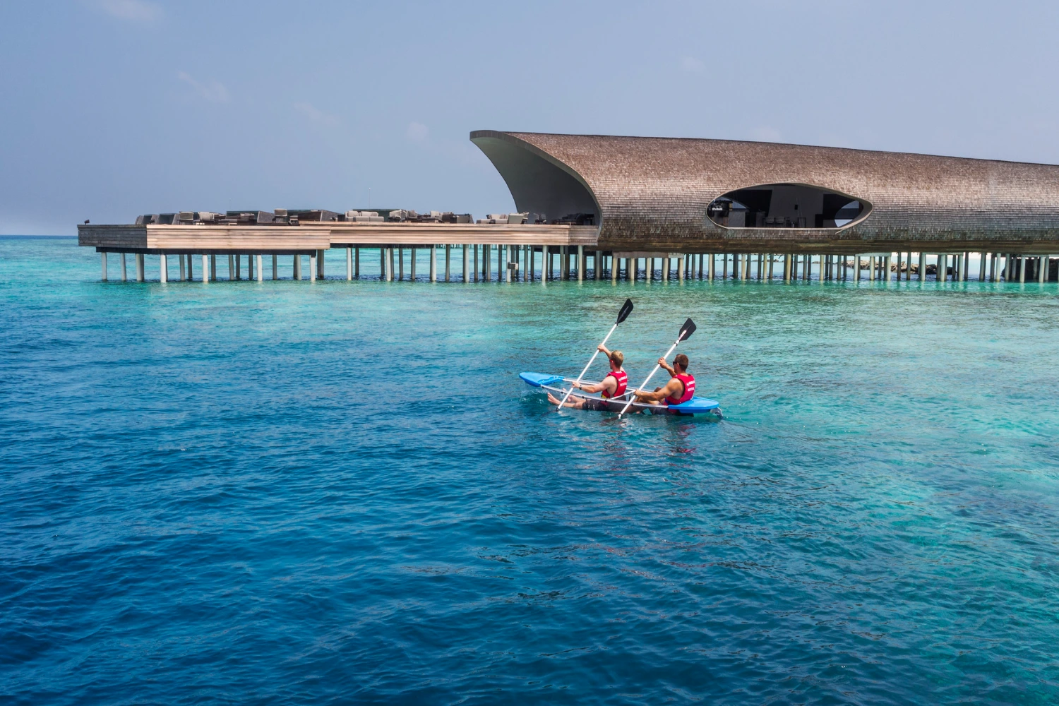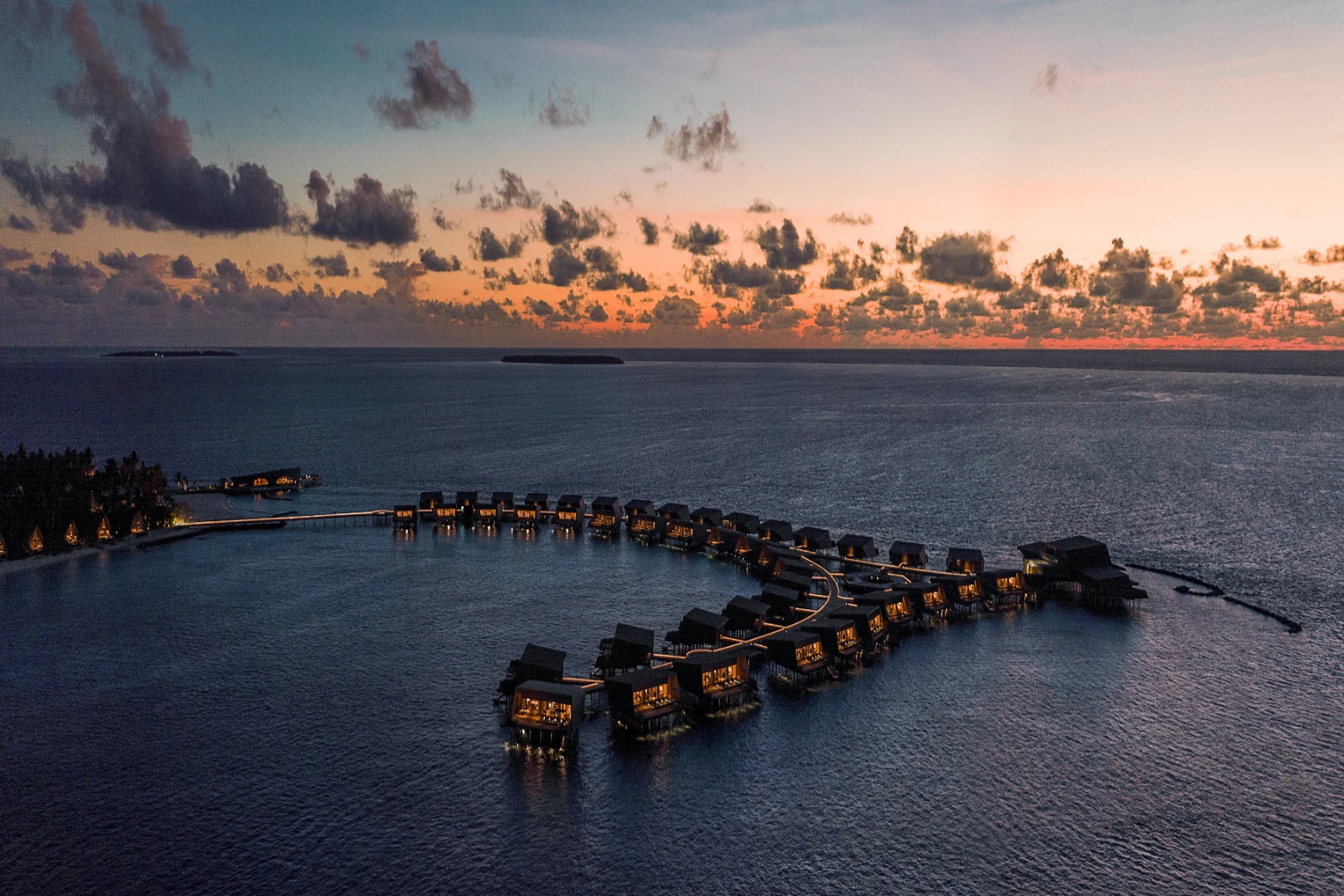 Nestled on a private island in the Dhaalu Atoll, The St. Regis Maldives Vommuli Resort is a triumph of contemporary architecture and eco-conscious luxury. Spread across nine hectares of lush tropical flora, the resort’s avant-garde design pays homage to the local marine life: its 77 exquisitely appointed villas resemble manta rays, the iconic Whale Bar takes the shape of a majestic whale shark, and the Iridium Spa is built in the likeness of a lobster.