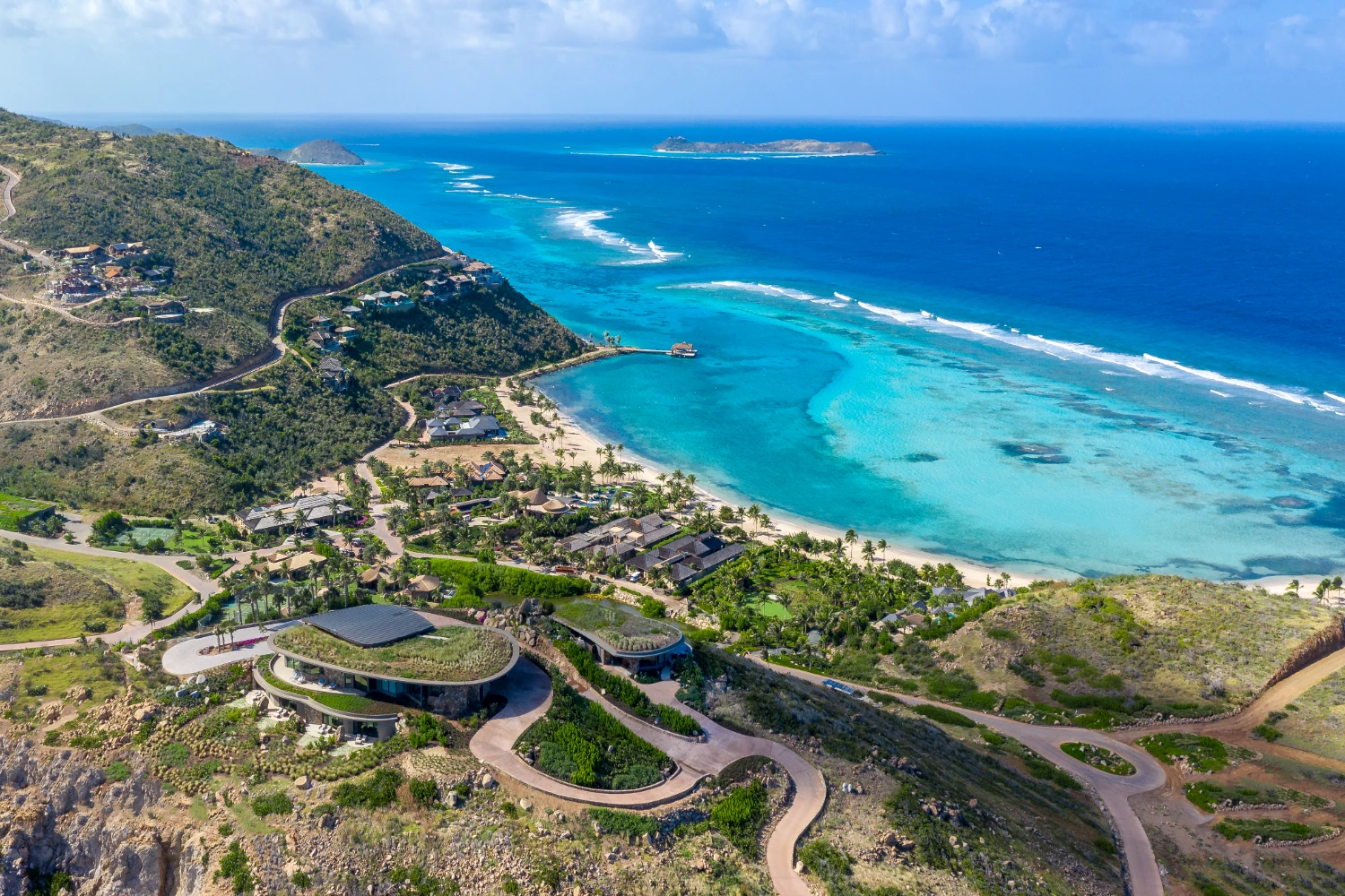 Top-tier amenities include an infinity pool, an outdoor shower, 360-degree sea views, a custom boulder waterfall, a sustainable green roof, an electric cart, daily housekeeping, turndown service, welcome drinks and amenities, personalized concierge service, and yoga mats.