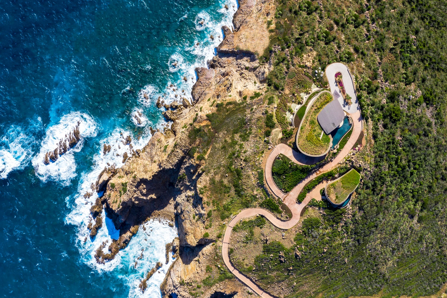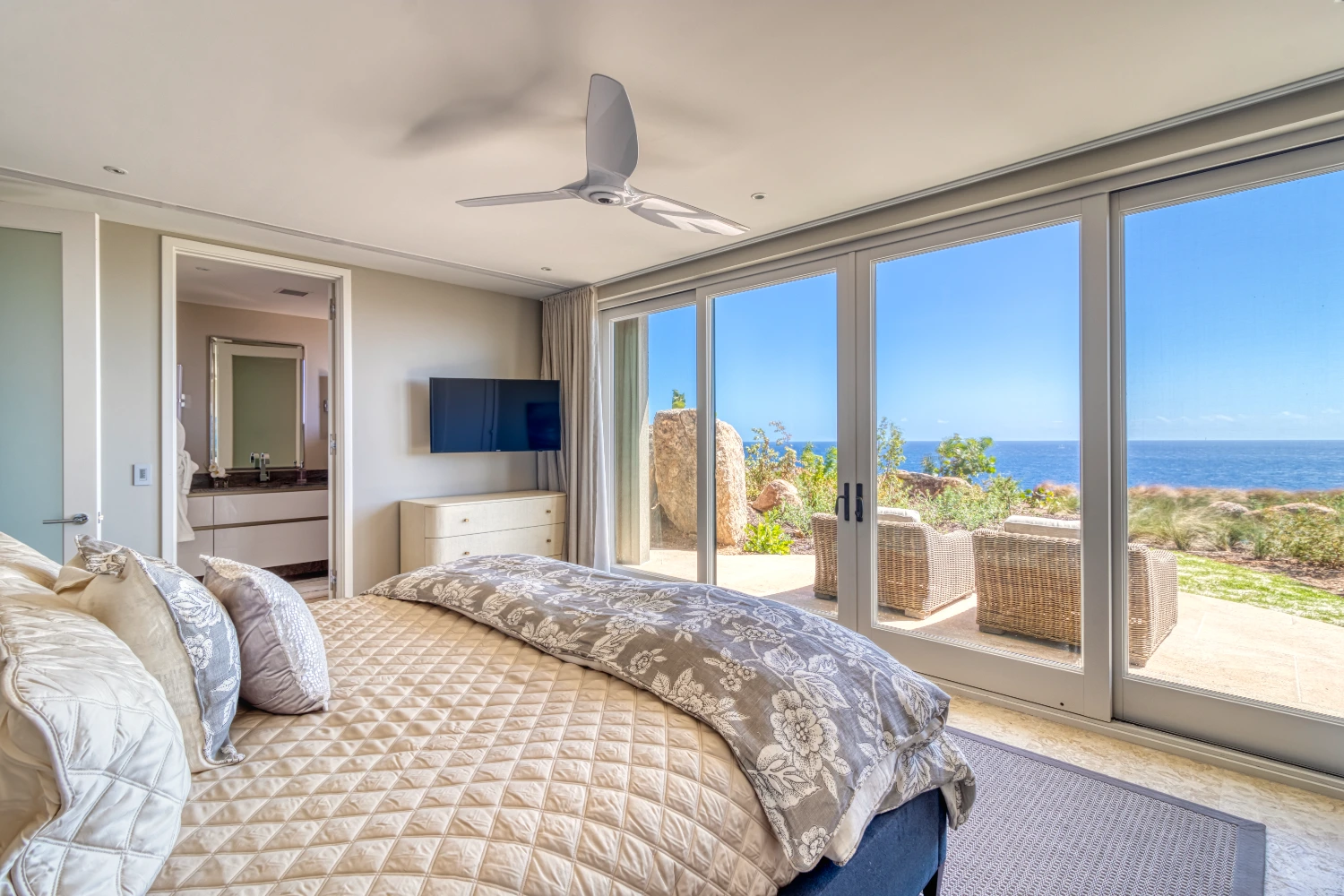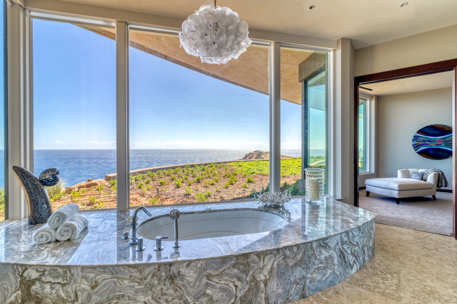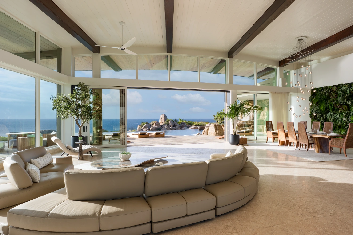 Floor-to-ceiling windows let in lots of light, creating inviting, bright indoor spaces that blend seamlessly into outdoor areas. The open-plan living and dining area invites guests to get together day or night. Take in breathtaking sea views from the contemporary circular sofa while sharing pre-dinner drinks or gather for homemade meals beneath elegant pendant lights.